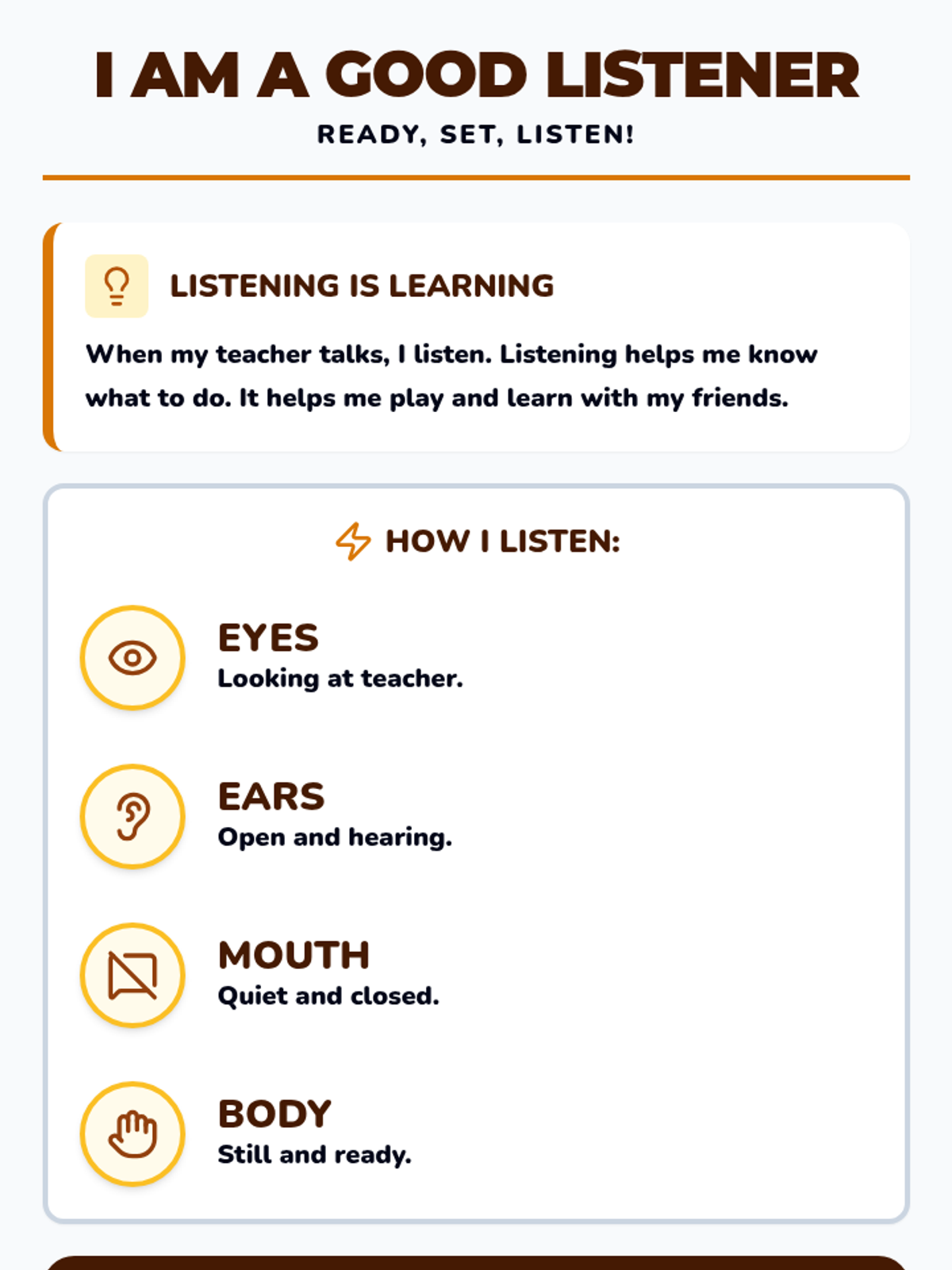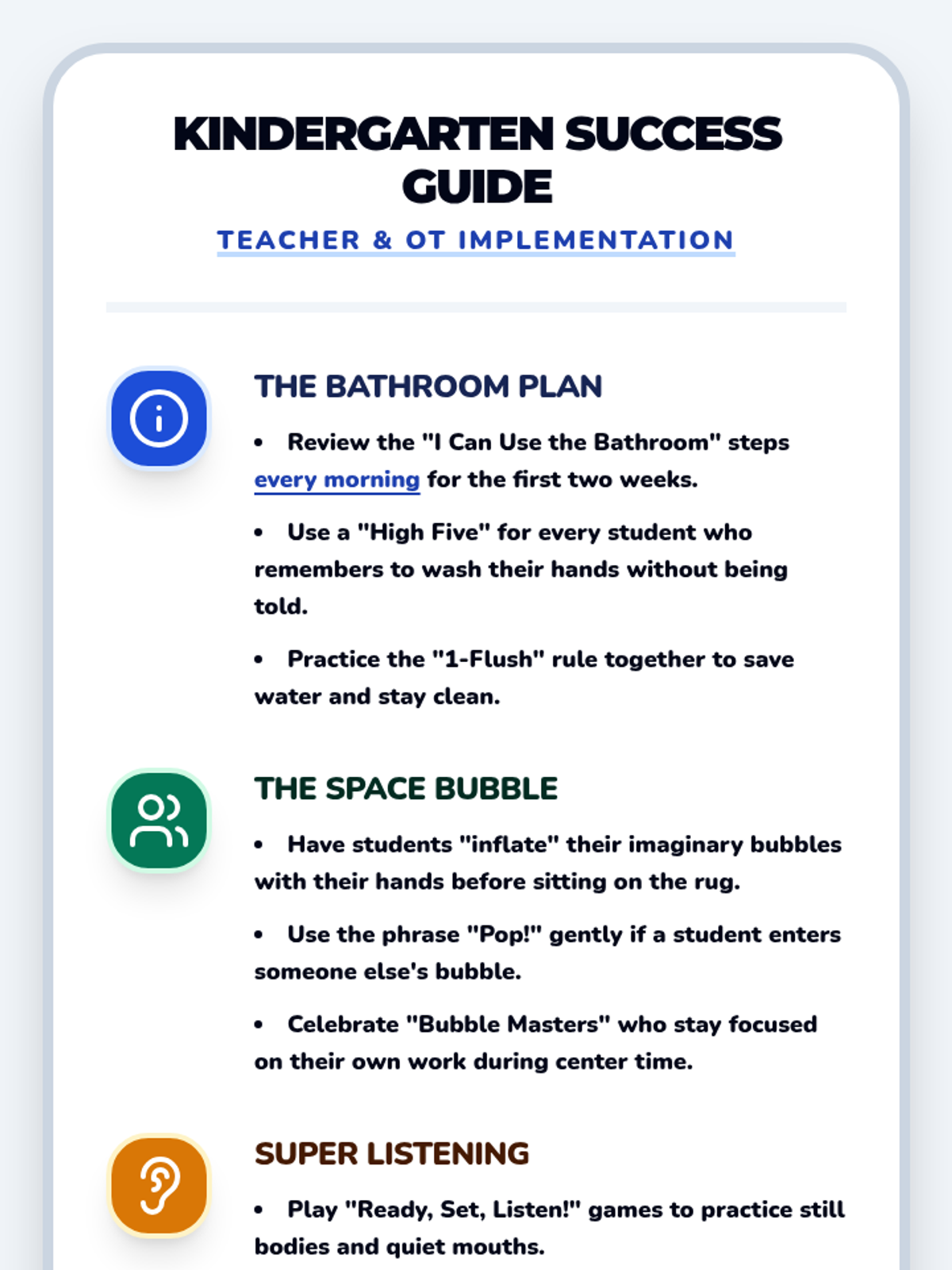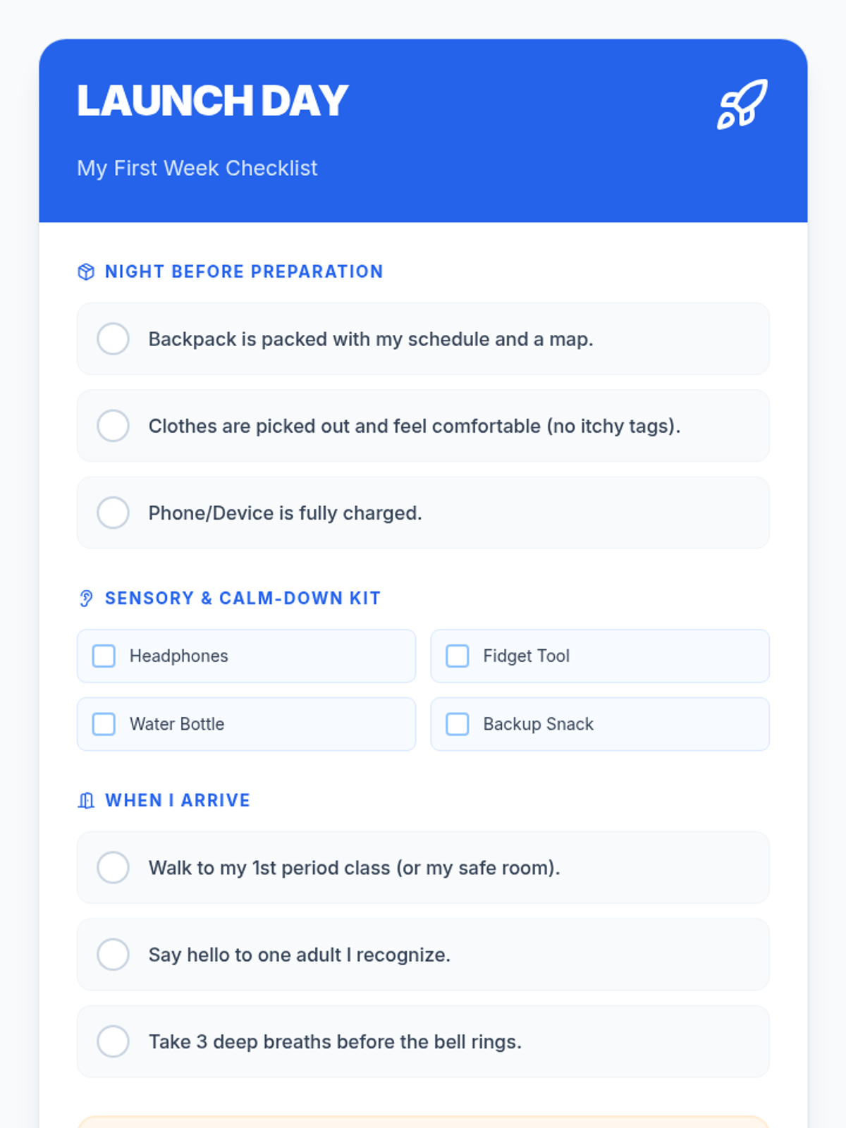 Special EducationSensory Processing & RegulationSensory Preferences IdentificationSensory Tool UseCommunicating Sensory NeedsSensory Overload RecognitionDeep Breathing PracticeMovement Break UtilizationIndependent Calming Strategy UsePersonalized Calming RoutinePersonal Sensory Diet CreationProactive Sensory BreaksEmotion Intensity RecognitionDysregulation RecoveryPositive Behavior SupportUnderstanding Social StoriesPersonal Social Story CreationEmotional Regulation FrameworksPersonal Trigger IdentificationSelecting Regulation StrategiesReinforcement System ResponseSelf-Monitoring & RewardsLearning Positive AlternativesCross-Setting Skill GeneralizationSocial CommunicationEye Contact & Personal SpaceContext-Appropriate GreetingsAppropriate Volume & ToneConversation Turn-TakingTopic Maintenance in DiscussionEffective Help-SeekingBody Language InterpretationFacial Expression RecognitionIdioms & Figurative LanguageSocial Problem IdentificationSocial Solution GenerationSocial Decision EvaluationTask ManagementMinimal Prompting Task StartSelf-Talk for StartingStarter Strategies for Difficult TasksAge-Appropriate Task PersistenceStrategic Break ManagementSmooth Task TransitionsAdapting to Plan ChangesObstacle Problem-SolvingMulti-Day Project CompletionPlanning & OrganizationPhysical Material OrganizationVisual Schedule & Timer UseSequential Task BreakingTime Estimation SkillsTask PrioritizationDigital & Physical Workspace ManagementPersonalized Organization StrategiesDetailed Project PlanningMultiple Commitment BalancingAcademic Support StrategiesMath Manipulative UseVisual Math Problem RepresentationComplex Math Problem BreakdownText Highlighting & AnnotationVisualization While ReadingPredictions & Inferences from TextText Structure Graphic OrganizersWriting Graphic OrganizersSentence Frames & TemplatesStudy Guide CreationSpaced Repetition for MemoryAssistive Writing TechnologyWorking Memory SupportSingle-Step Direction FocusMulti-Step Direction FollowingInformation Chunking PracticeVisual Support Memory AidsMnemonic Device ApplicationEfficient Note-Taking SystemsGraphic Organizer Note-TakingNote Review & OrganizationSustained Complex Task AttentionAssistive TechnologySymbol-Word CommunicationAAC Device NavigationSpeech Recognition DictationDictation Text EditingText-to-Speech for ReadingDigital Calendar UseKeyboard Shortcuts NavigationProductivity App ManagementSelf-Advocacy SkillsCommunicating Learning NeedsRequesting AccommodationsAdvocating for Appropriate SupportsIEP & Student RightsUnderstanding IEP ComponentsMeaningful IEP Meeting ParticipationIDEA & Section 504 RightsProgress MonitoringTracking IEP Goal ProgressReflecting on AchievementData-Informed Instructional AdjustmentTransition PlanningCareer & Vocational Goal SettingExploring Post-Secondary OptionsIndependent Living Skills Planning