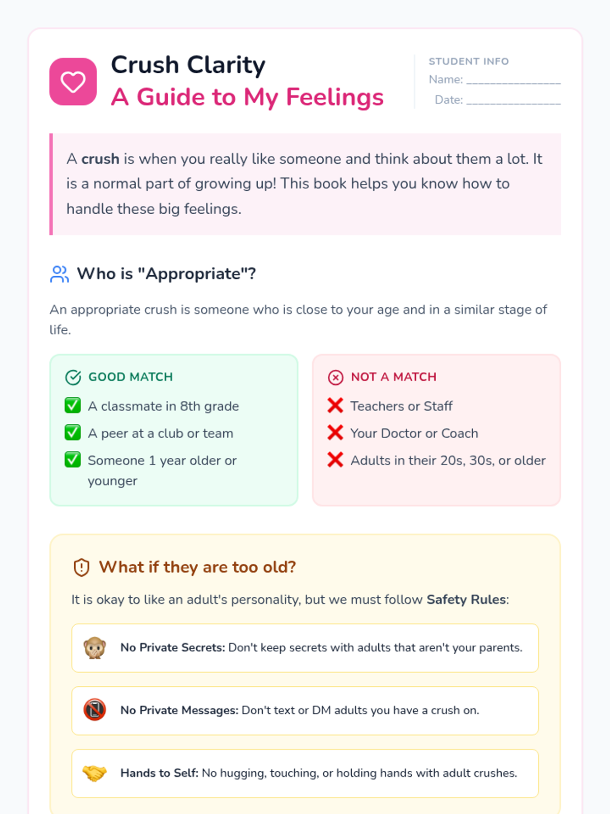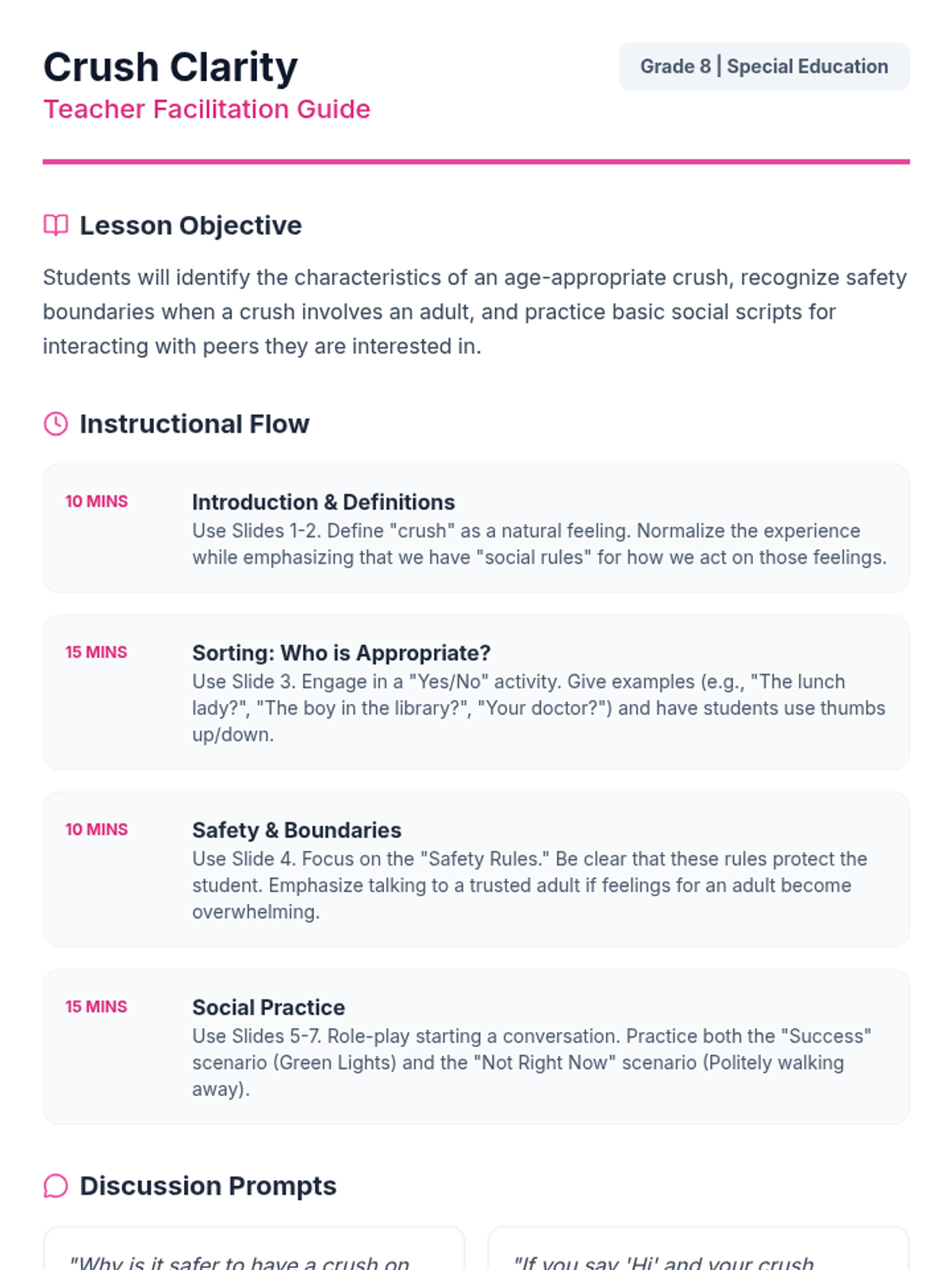 A lesson designed for 8th-grade students with intellectual disabilities focusing on identifying appropriate crushes, handling crushes on older individuals, and practicing social skills for interacting with peers.