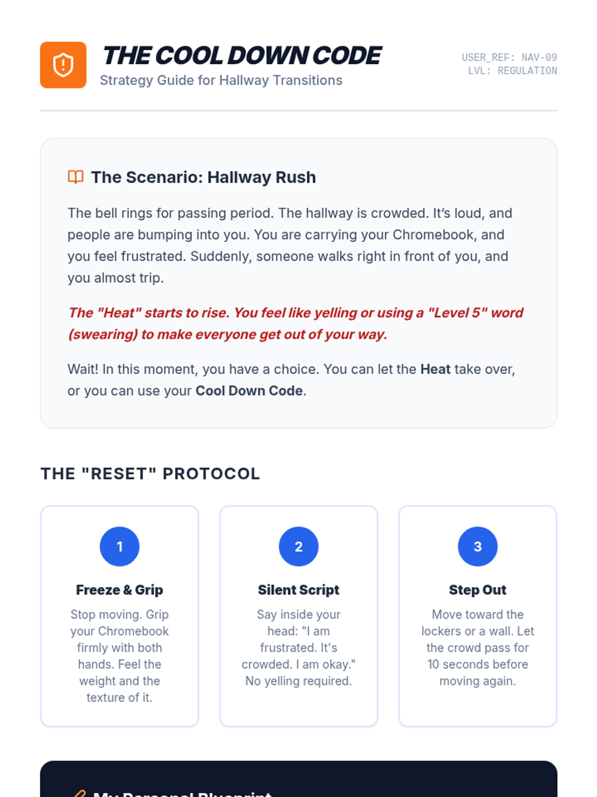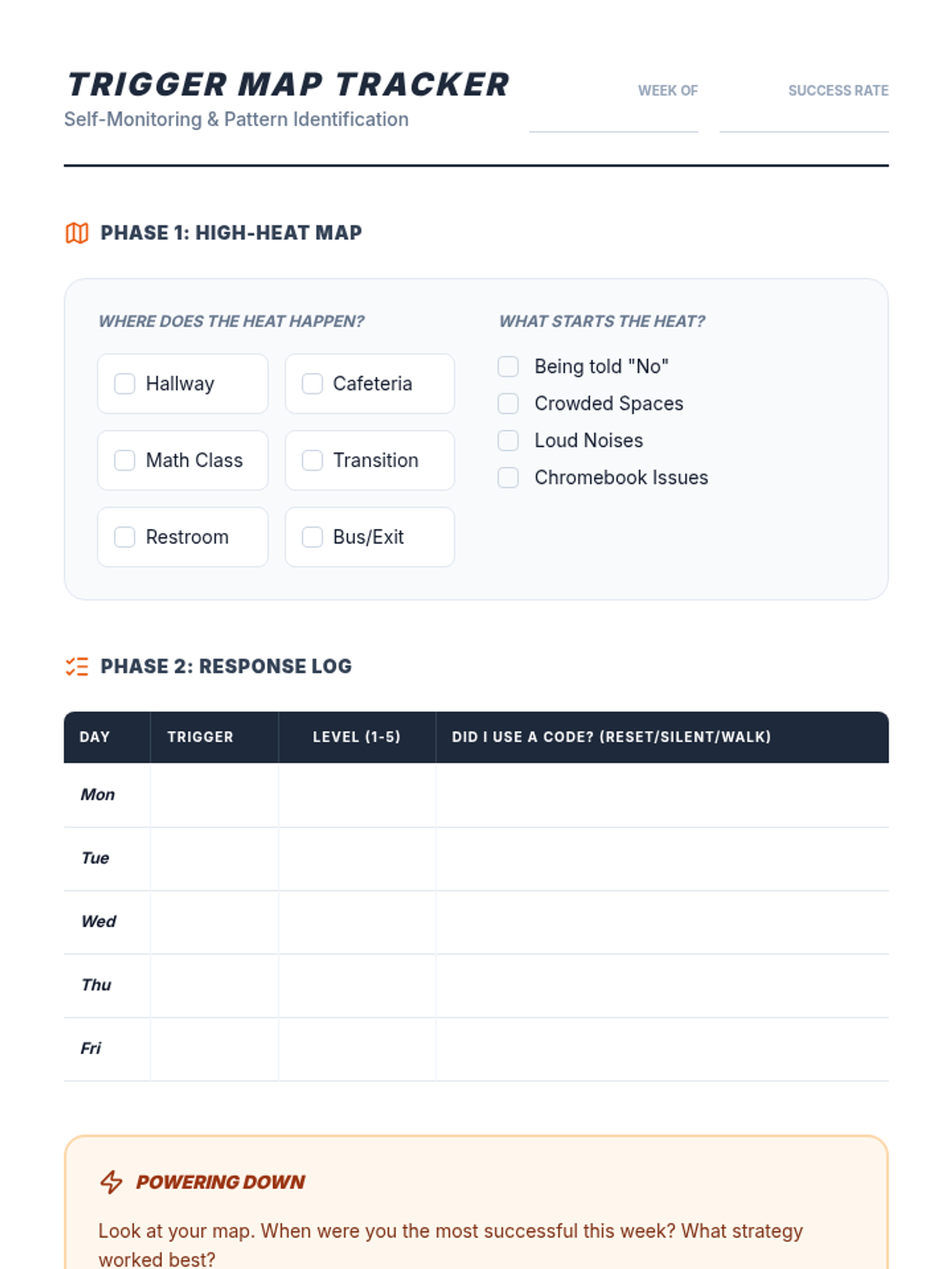 Personal Trigger IdentificationIdentifies physiological and emotional cues linked to specific stressors. Equips learners with self-monitoring tools to anticipate reactions and apply proactive coping strategies.