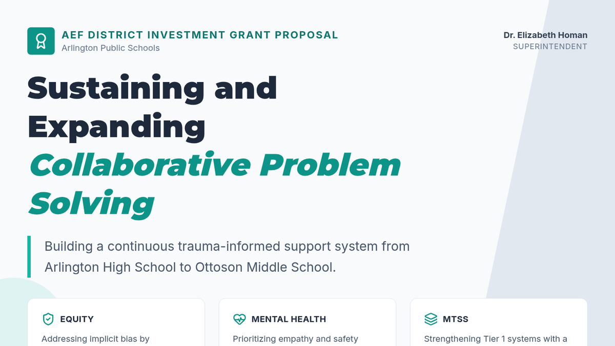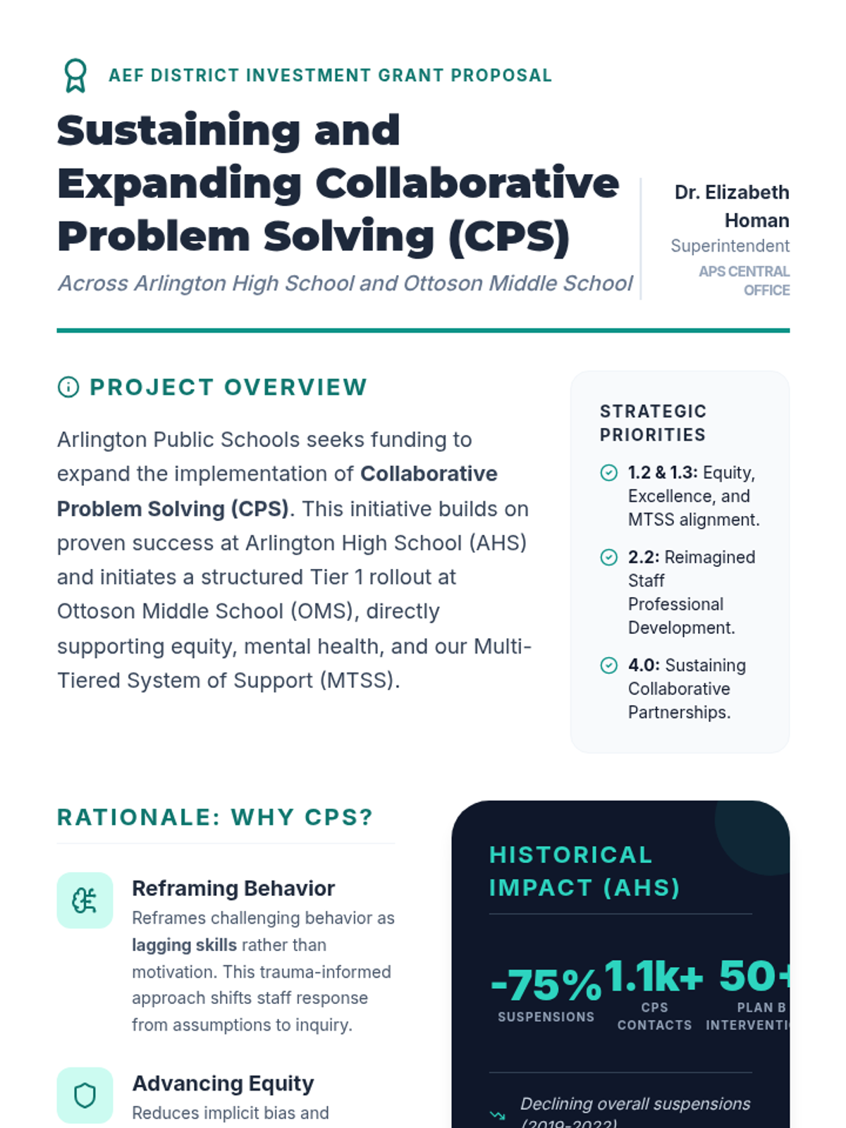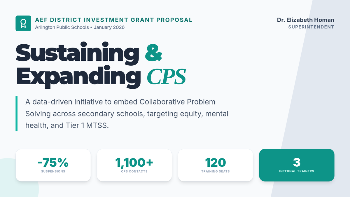 A professional presentation designed to communicate the goals, rationale, and impact of the Collaborative Problem Solving (CPS) expansion initiative for the Arlington Public Schools AEF District Investment Grant.