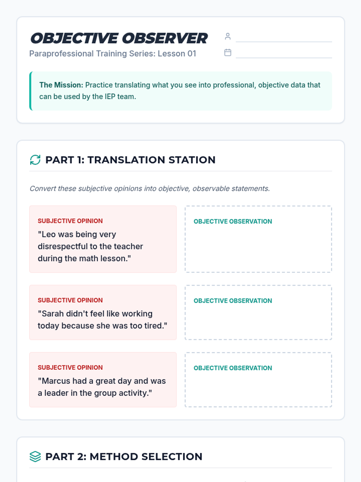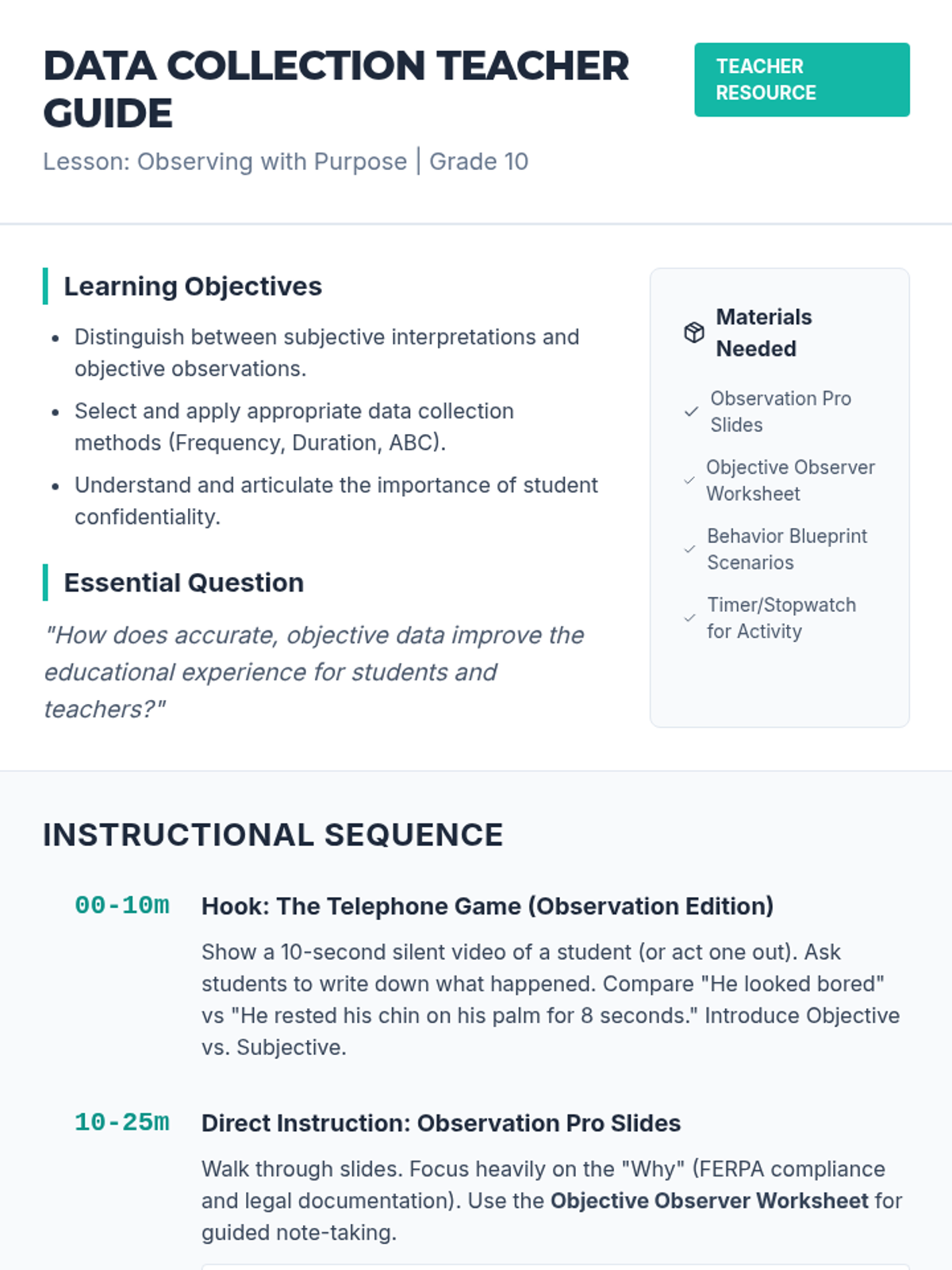 This lesson equips 10th-grade students with practical observation and data collection techniques essential for paraprofessionals, focusing on objectivity, frequency, duration, and ethical reporting.