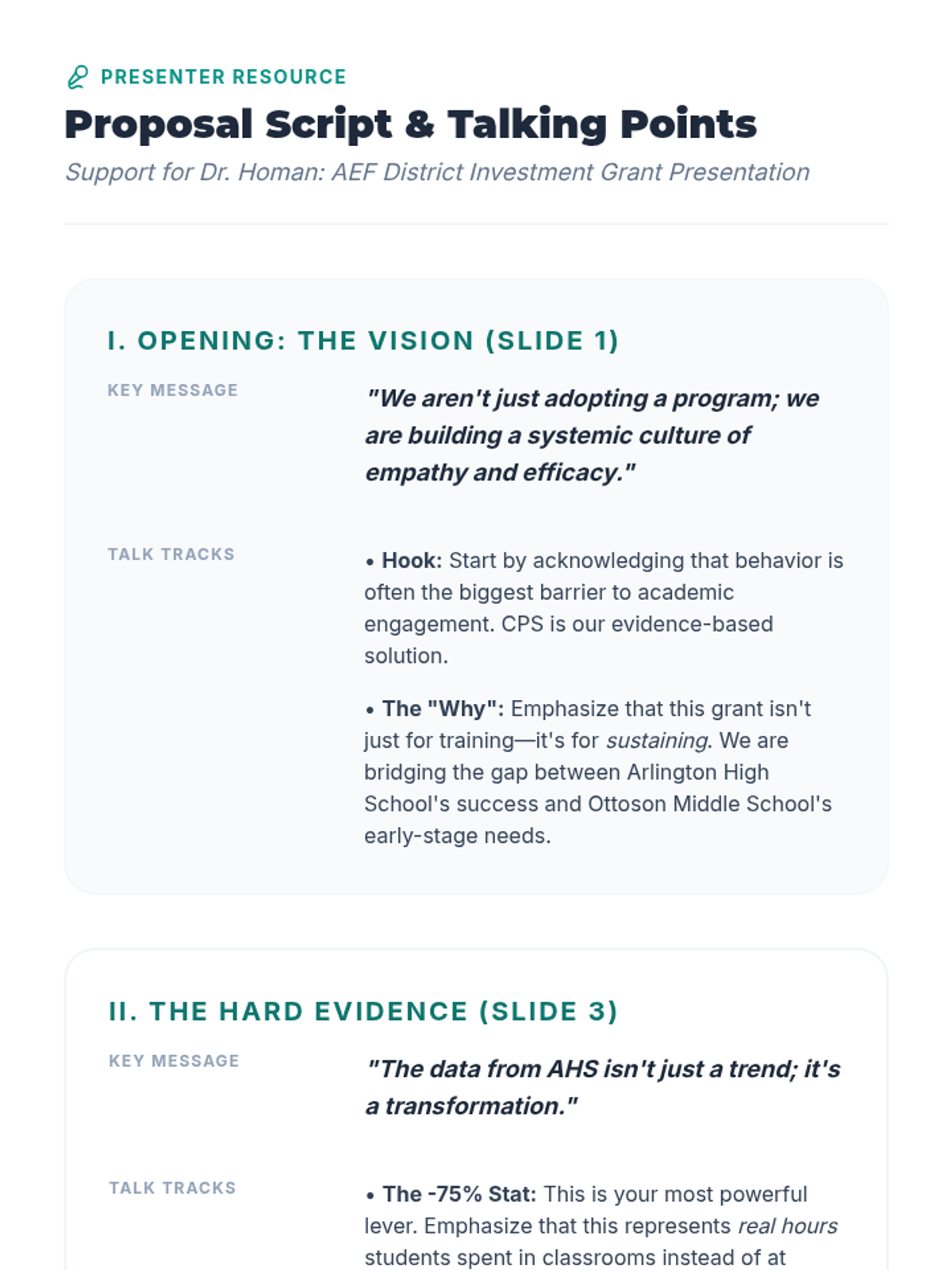 A comprehensive set of resources for presenting the CPS Framework scaling project for the AEF grant, including slides and a summary poster.