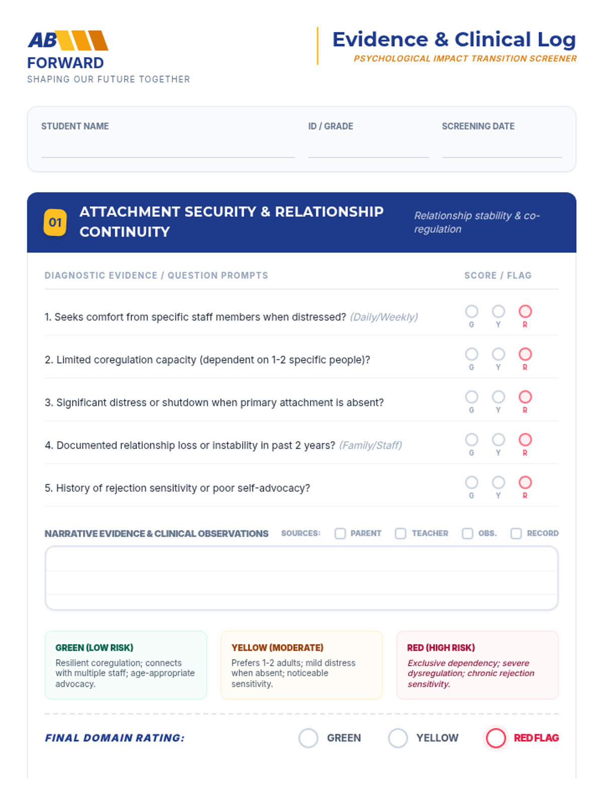 A comprehensive assessment framework designed to evaluate and mitigate the psychological risks associated with student school transitions, ensuring psychological safety is prioritized alongside physical accessibility.