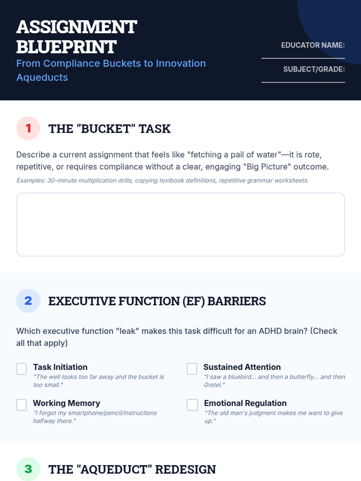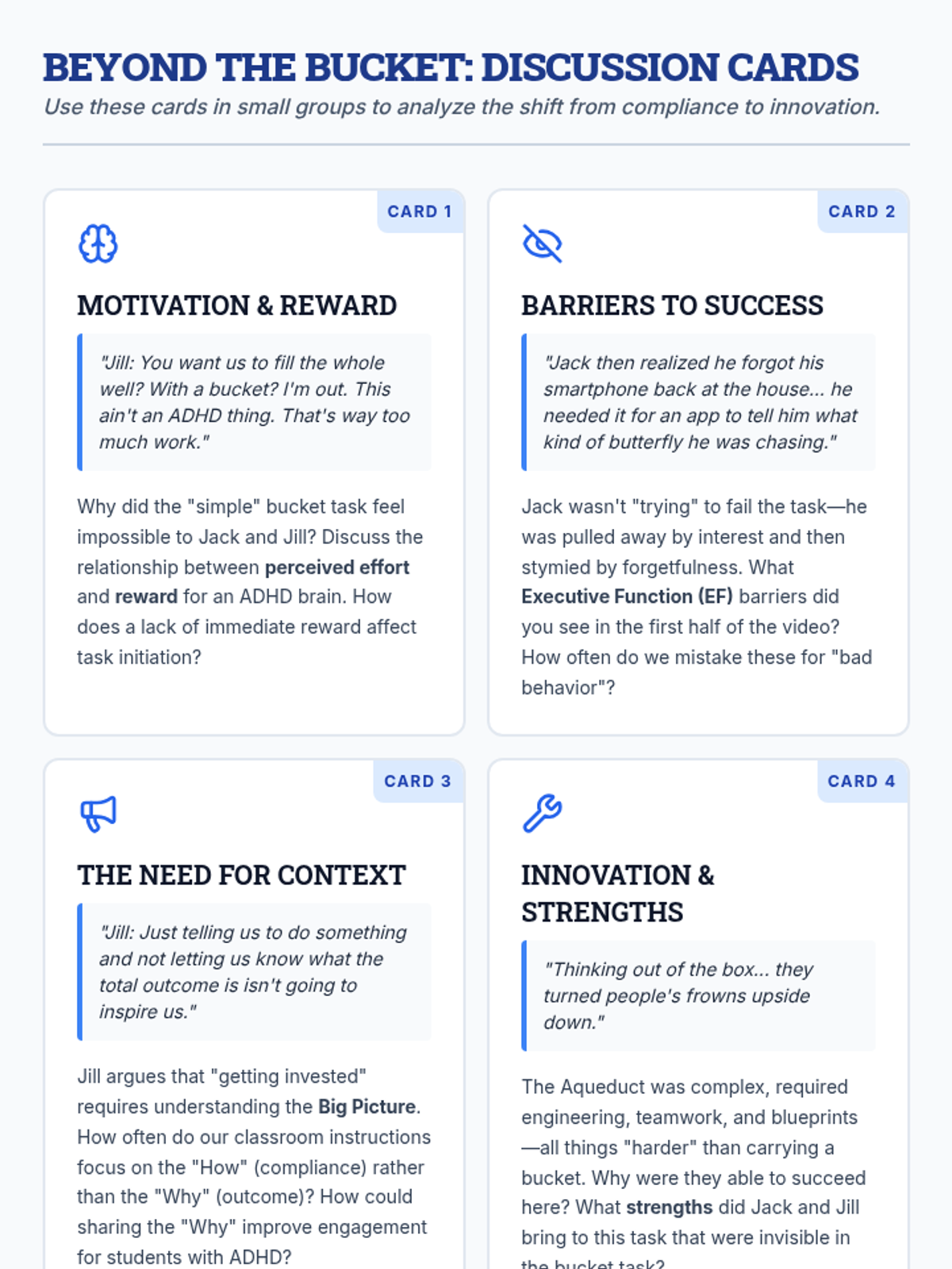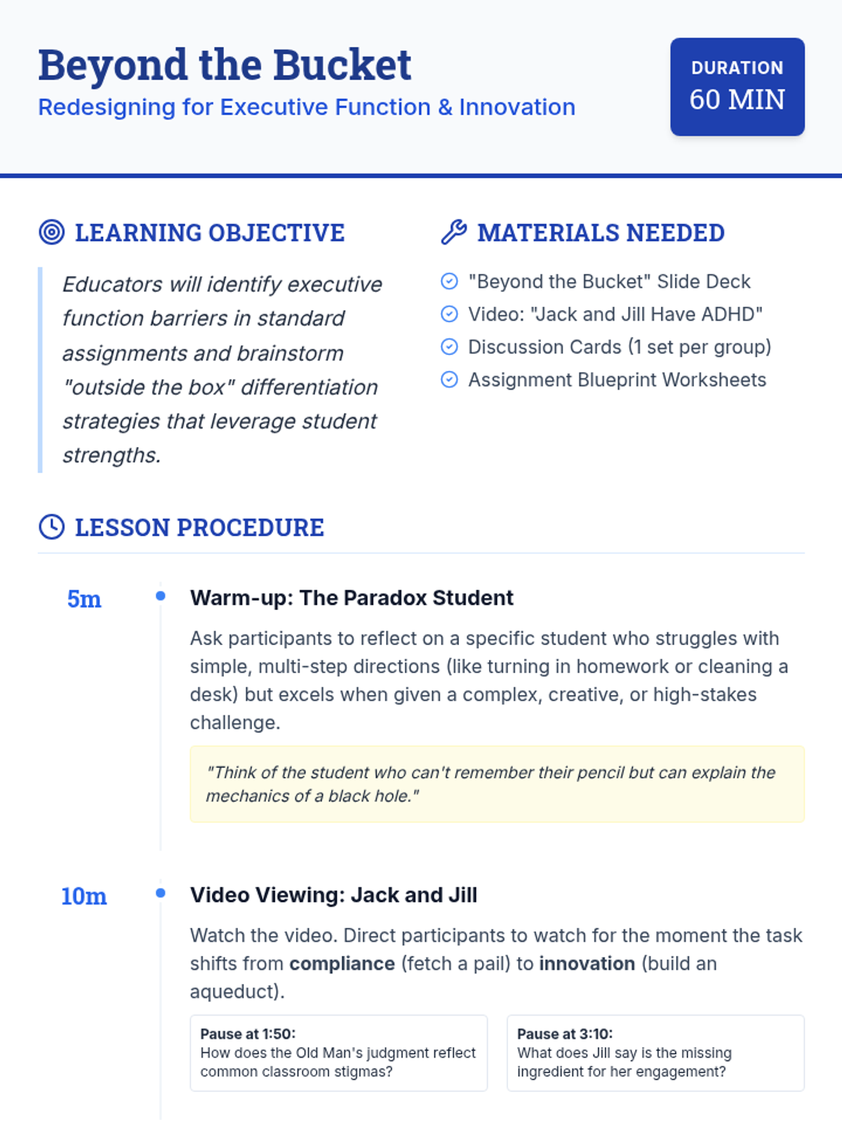 A professional development lesson for educators focused on shifting from rote 'compliance' tasks to engaging 'innovation' tasks for students with ADHD, inspired by the 'Jack and Jill Have ADHD' video. Educators analyze executive function barriers and redesign assignments to leverage student strengths.