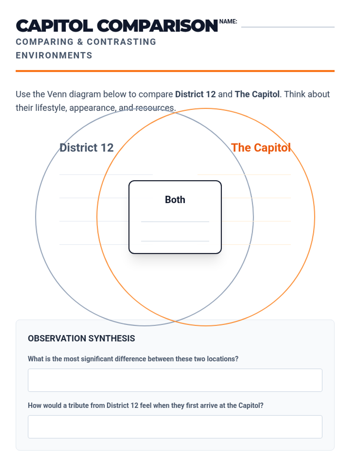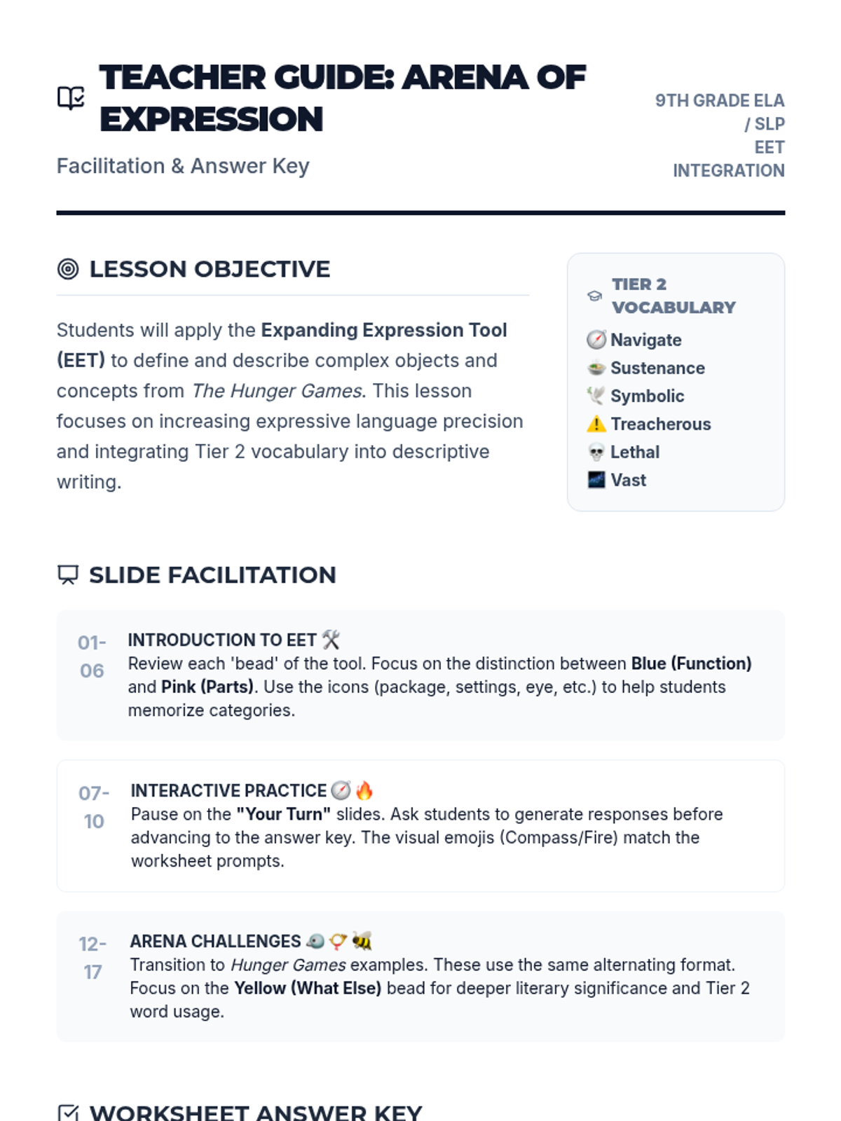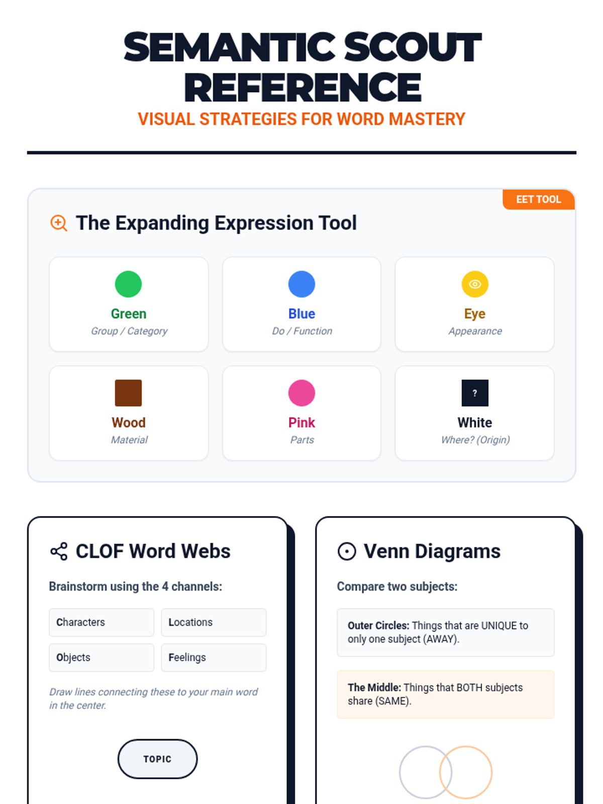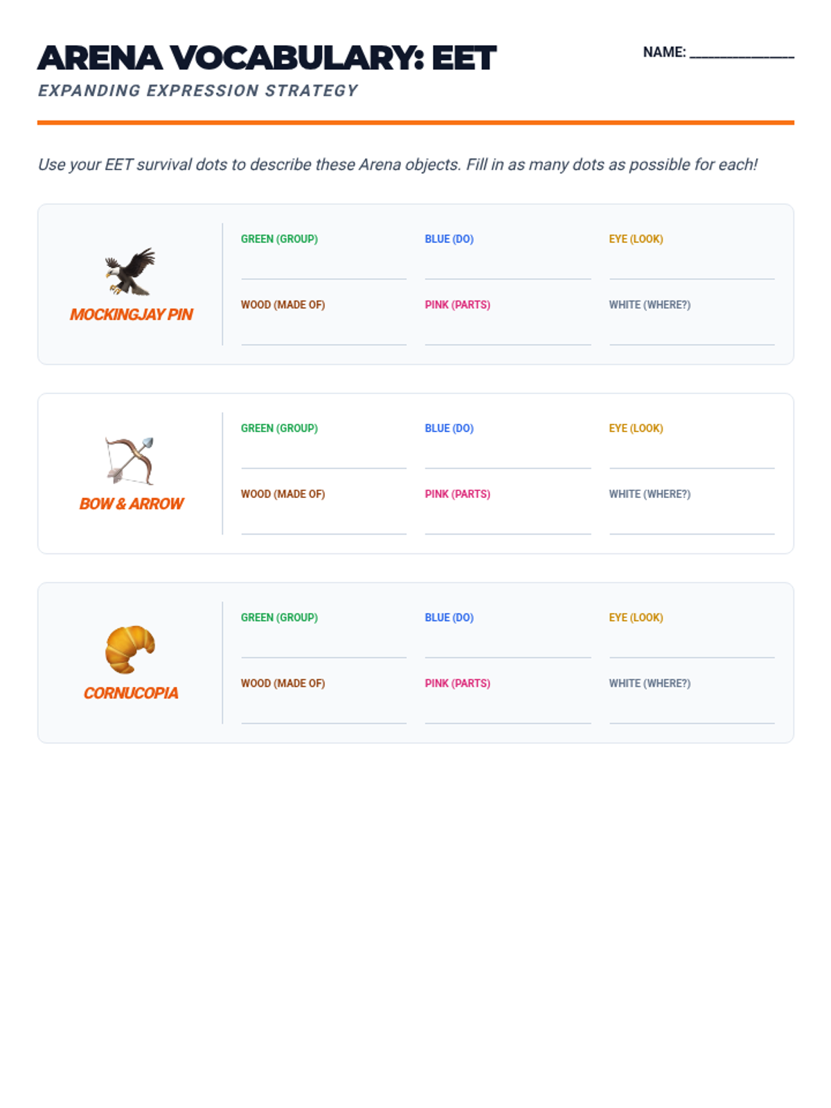 A structured language lesson using The Hunger Games to build semantic retrieval and knowledge through visual organizers like word webs, Venn diagrams, and the Expanding Expression Tool (EET).