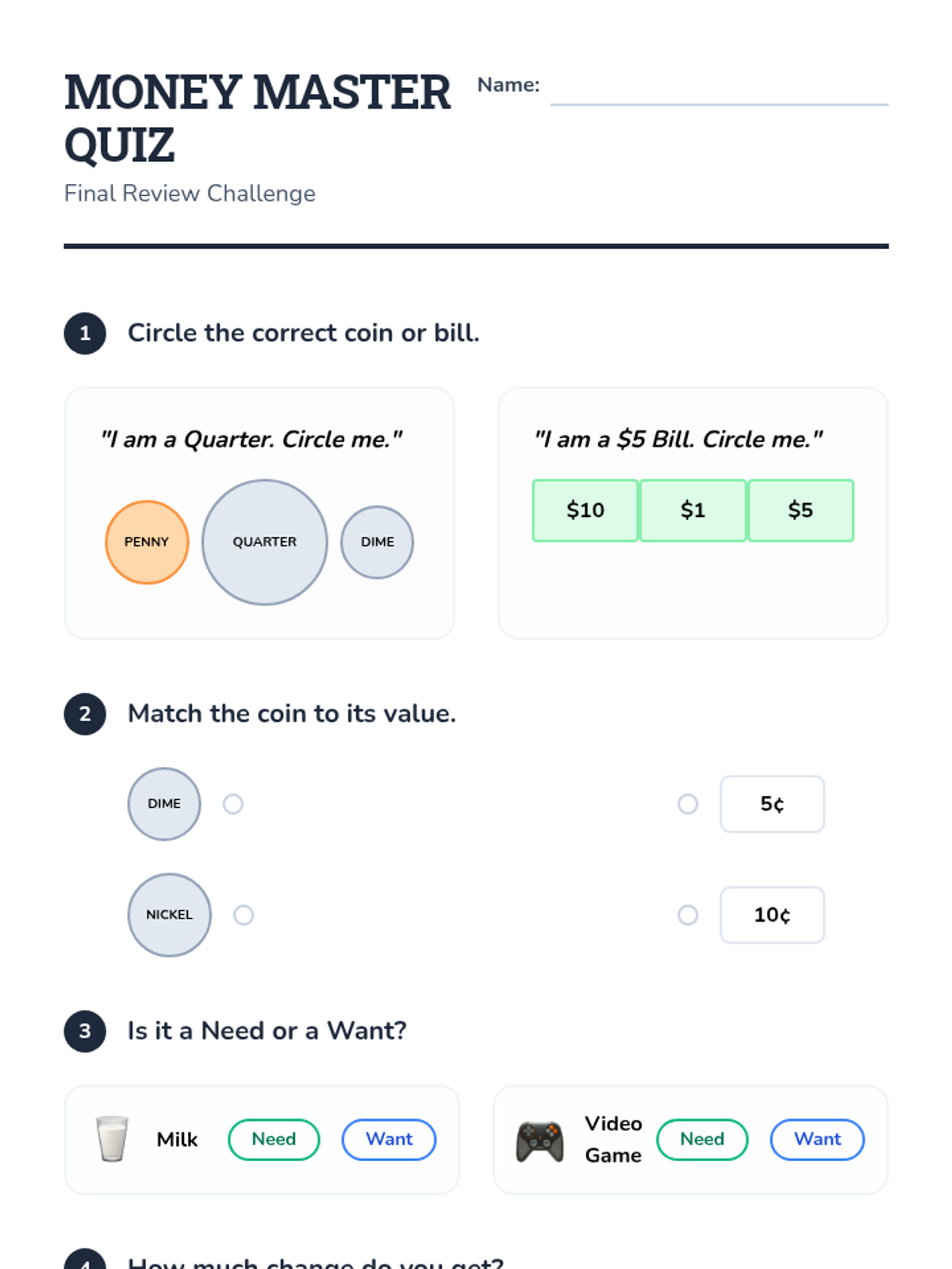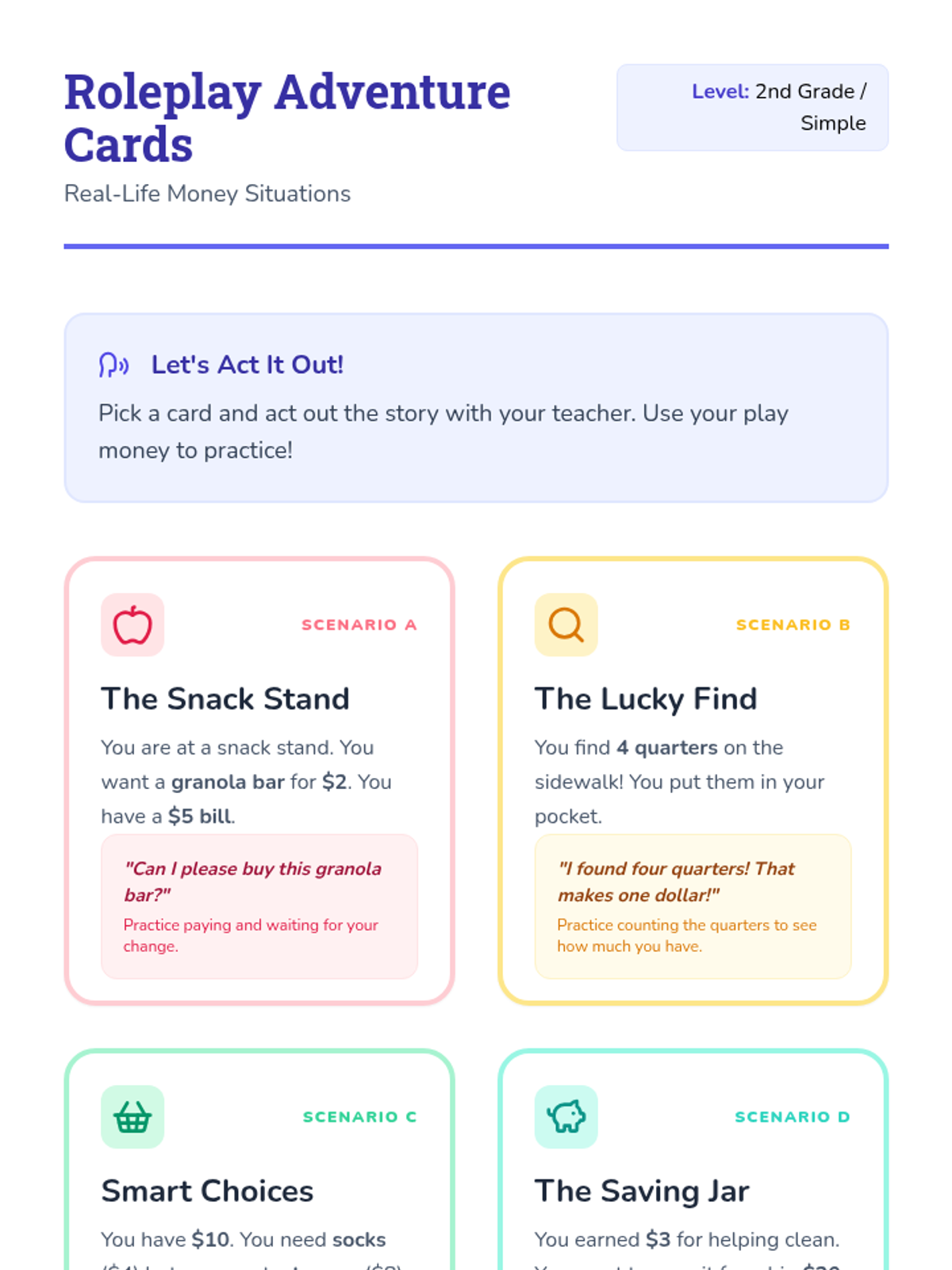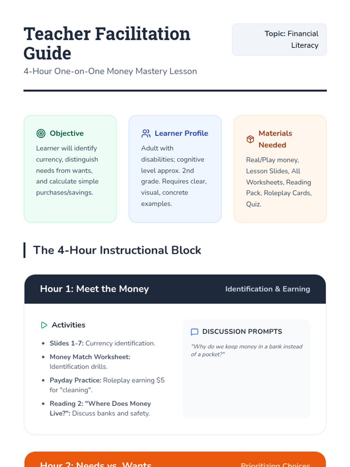 A comprehensive 4-hour individual lesson for an adult learner at a 2nd-grade level, focusing on money identification, needs vs. wants, making purchases, and saving strategies through hands-on activities and role-play.