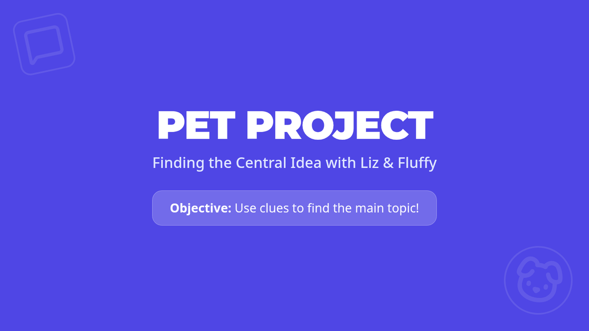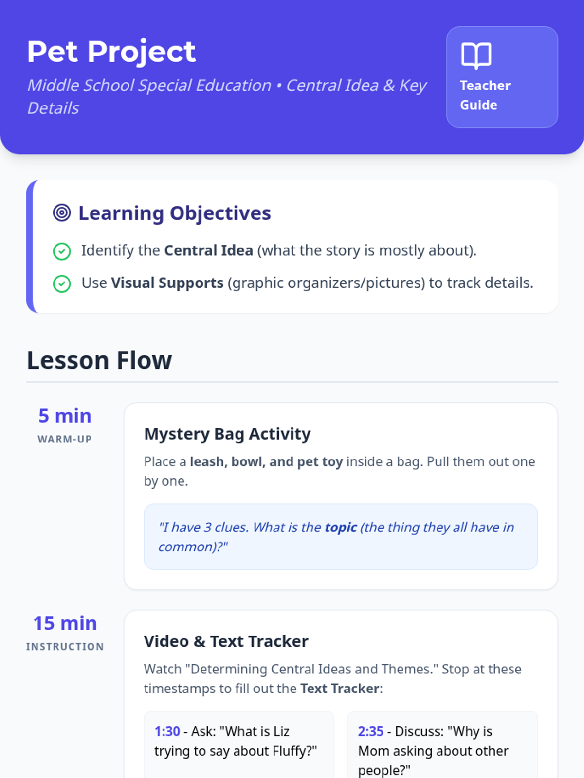 A visual-heavy lesson for Middle School Special Education focusing on identifying central ideas through a humorous text message exchange about a pet named Fluffy.