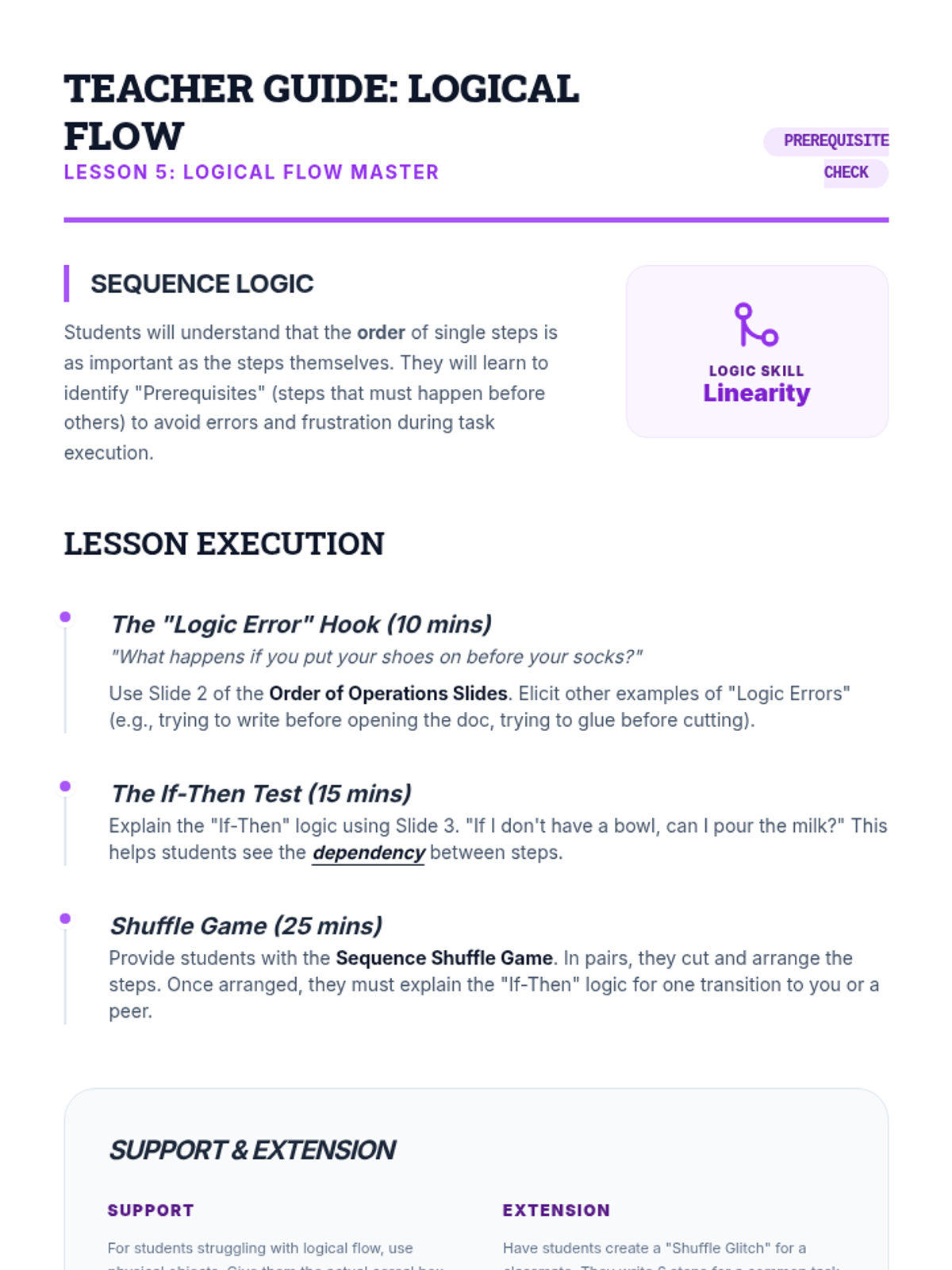 Students act as 'programmers' to move a 'human robot' through a maze using only rigid, single-step commands. This lesson illustrates the 'logic error' of combining steps and the importance of precise, isolated language.