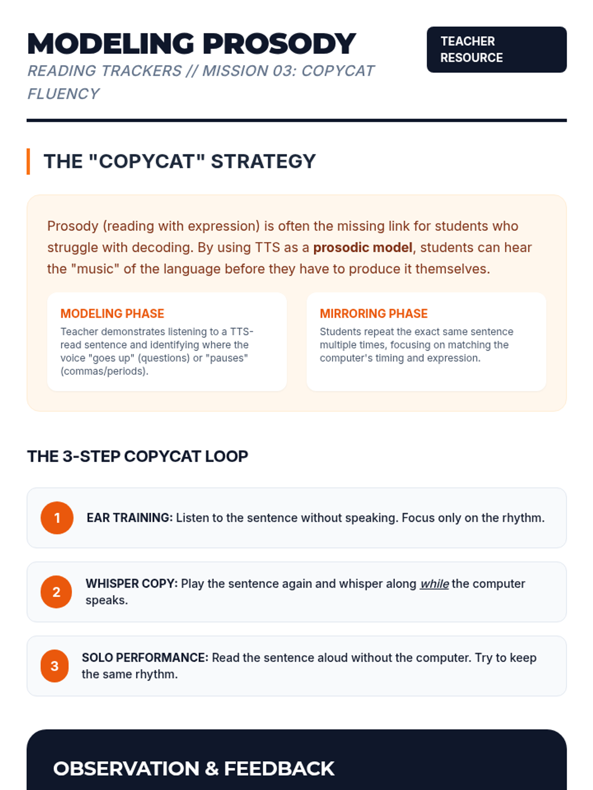 Students use TTS as a model for phrasing and rhythm, practicing repeated readings of short passages to build oral reading fluency.