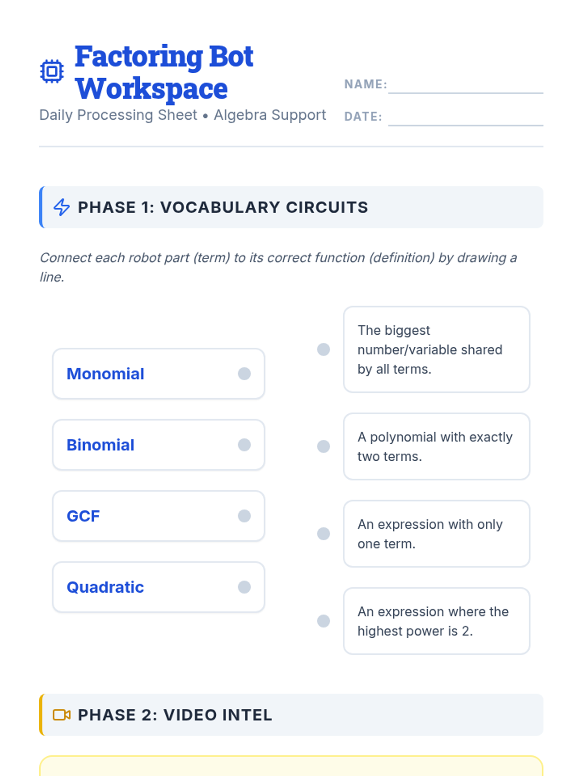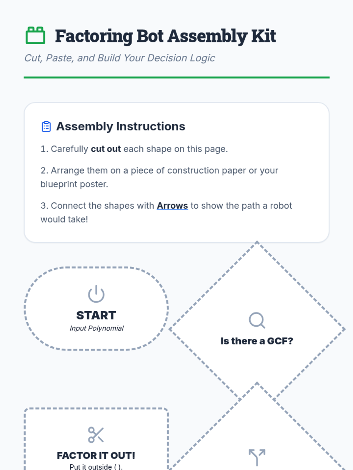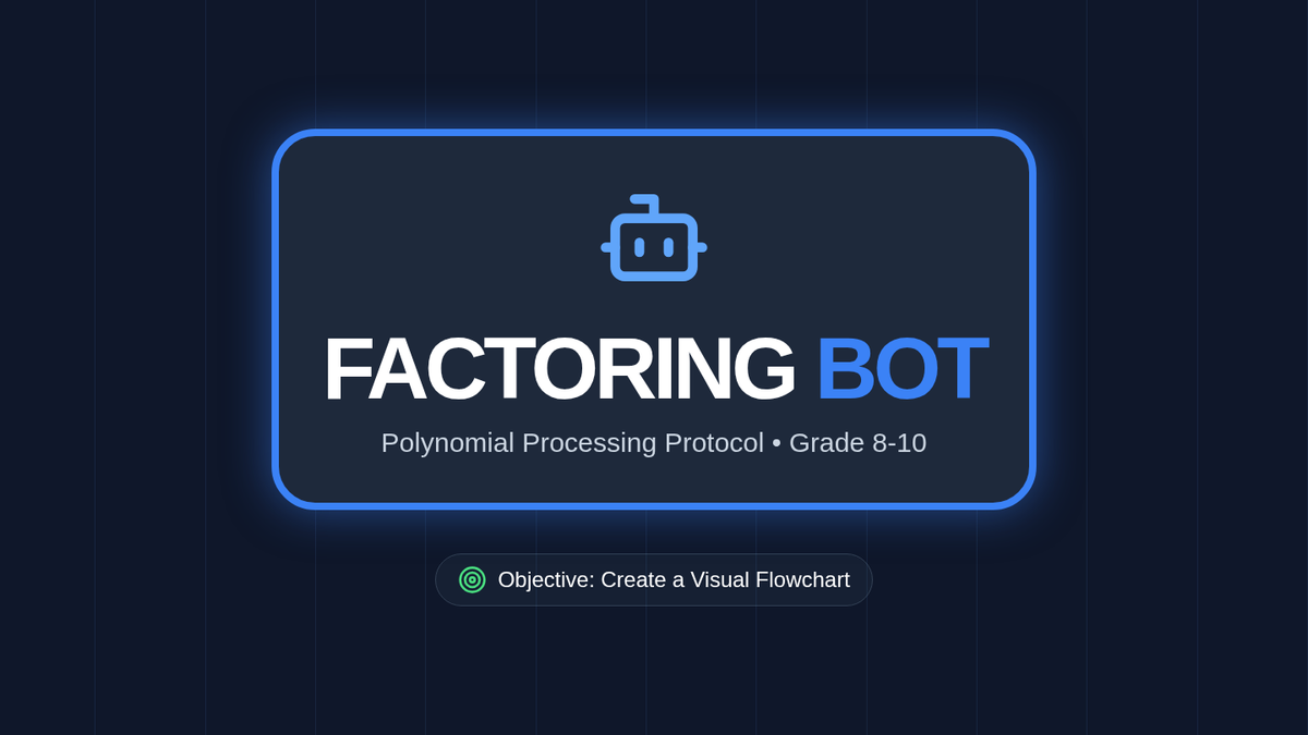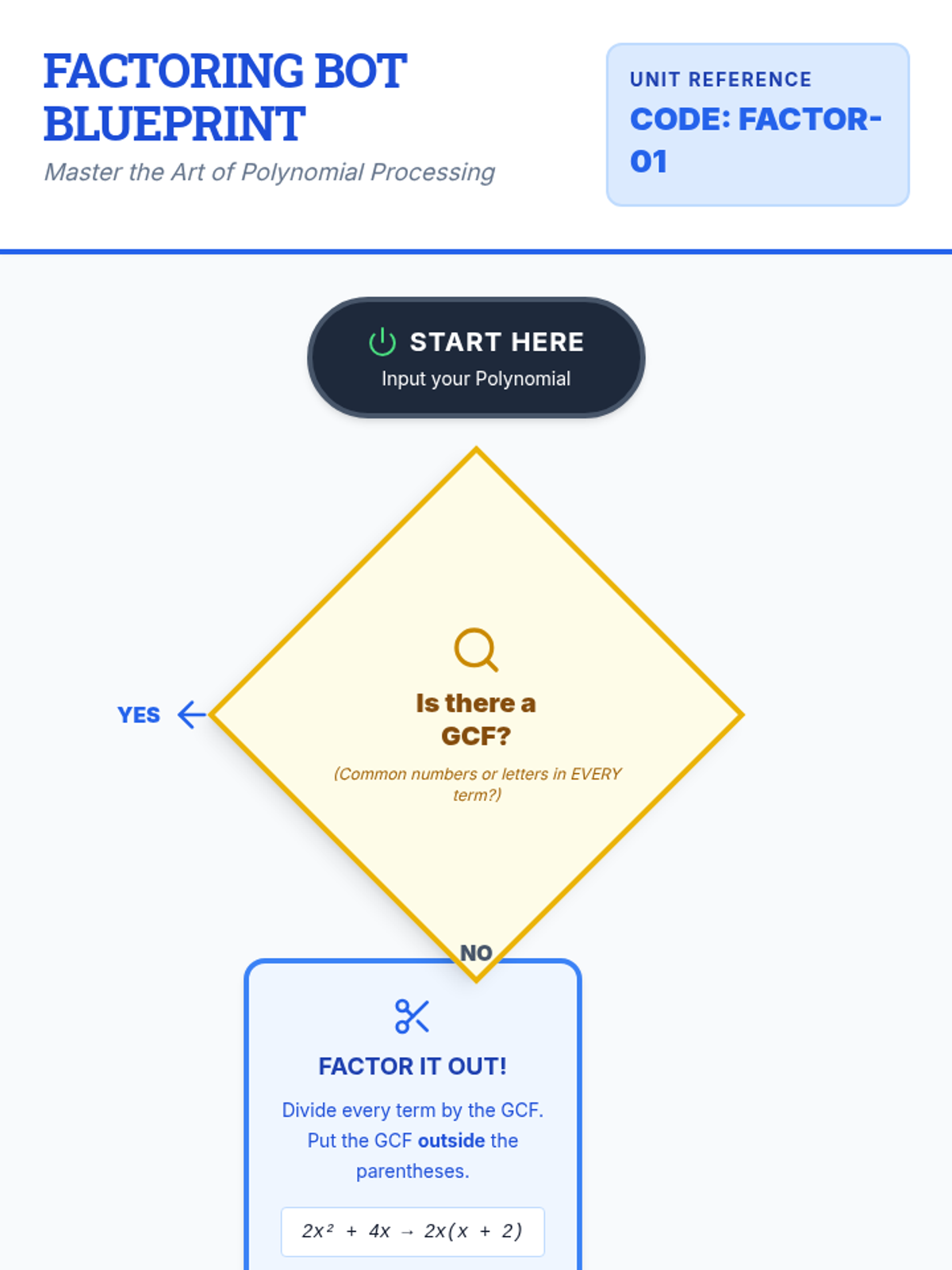 A specialized algebra lesson for SPED students focused on a step-by-step decision-making process for factoring polynomials, using a 'Factoring Bot' flowchart theme to guide students through GCF and quadratic factoring.