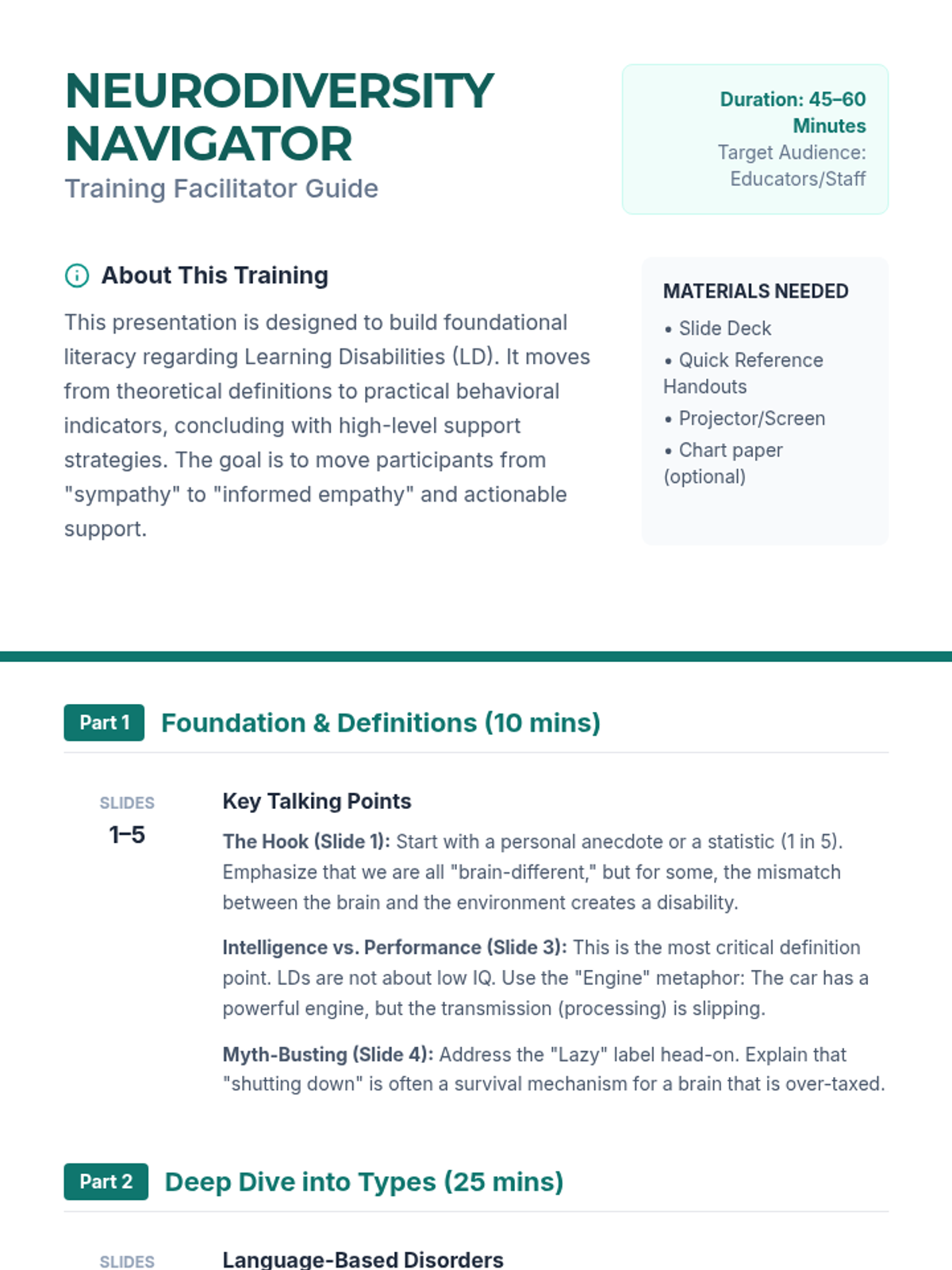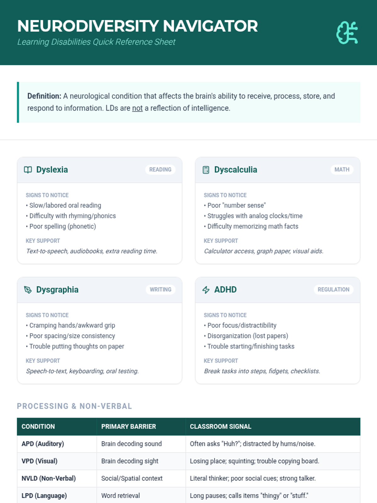 A comprehensive training module designed for educators or professionals to understand, identify, and support various learning disabilities. This lesson covers major LD types, behavioral indicators, and foundational support strategies.