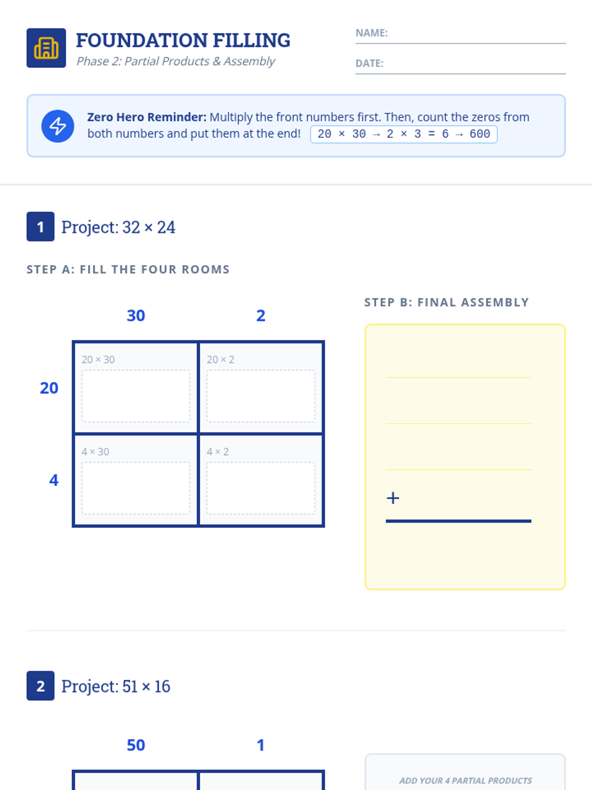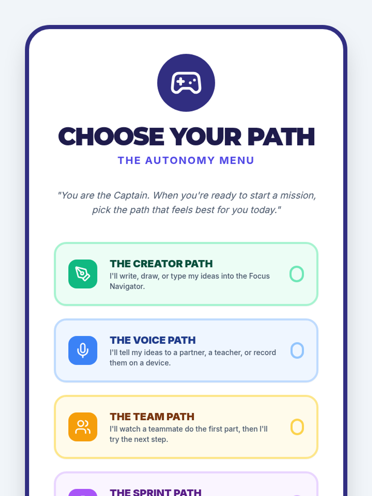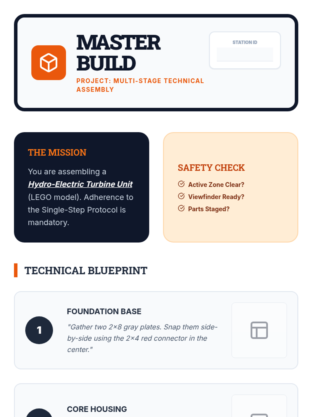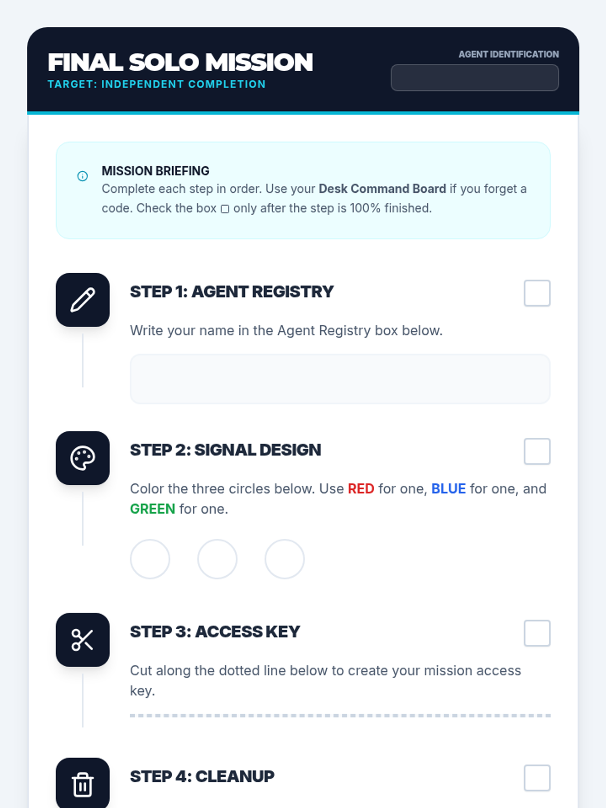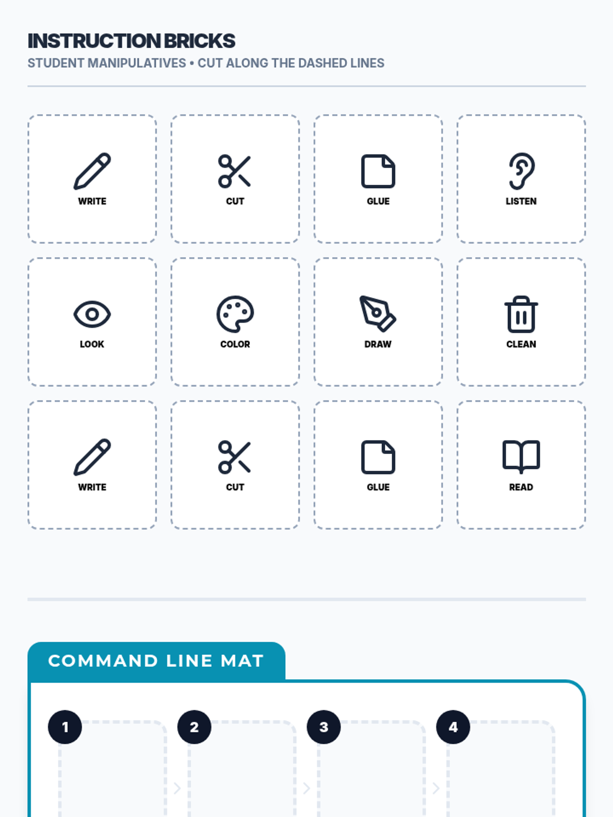 Students are given a simple worksheet or project paired with a single-step visual guide. They navigate the task independently by covering up future steps and revealing only the current step's visual.