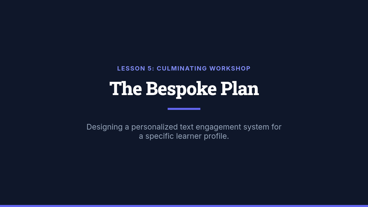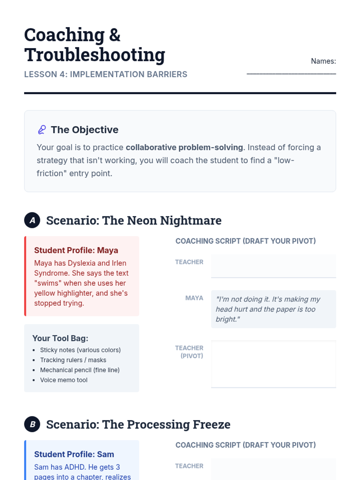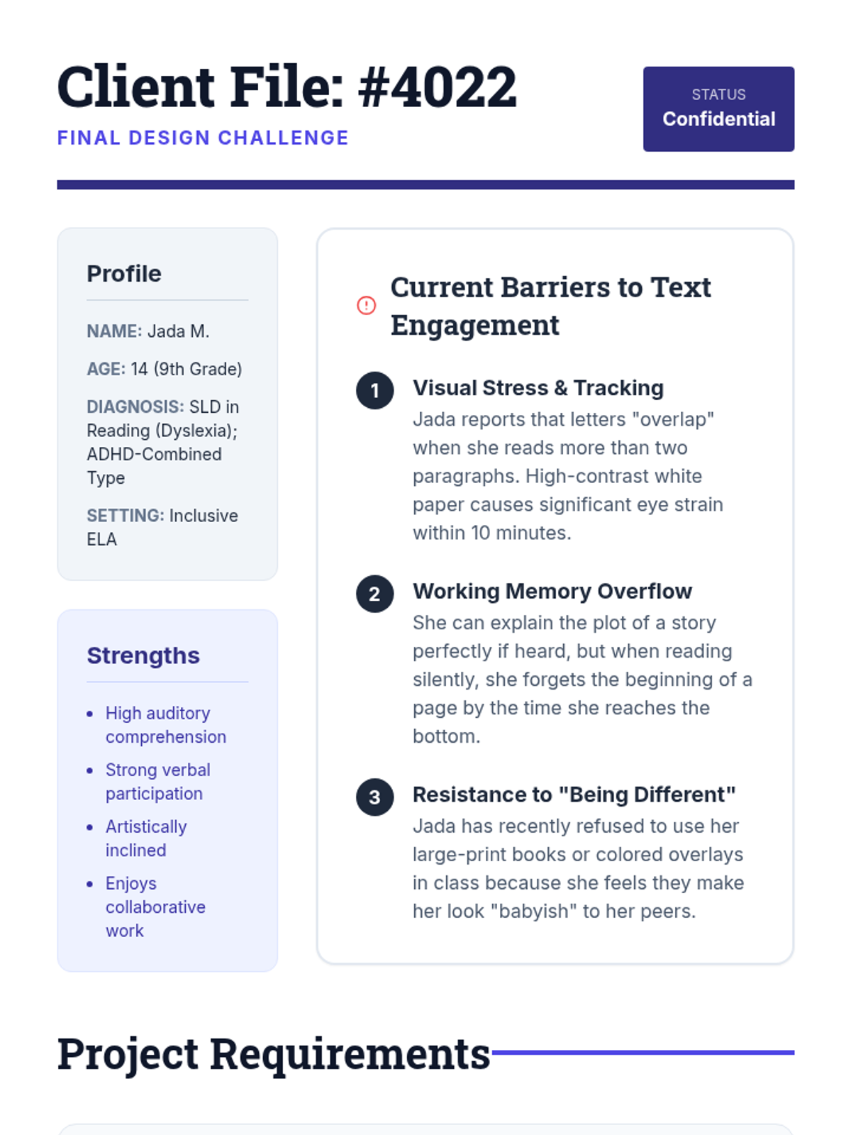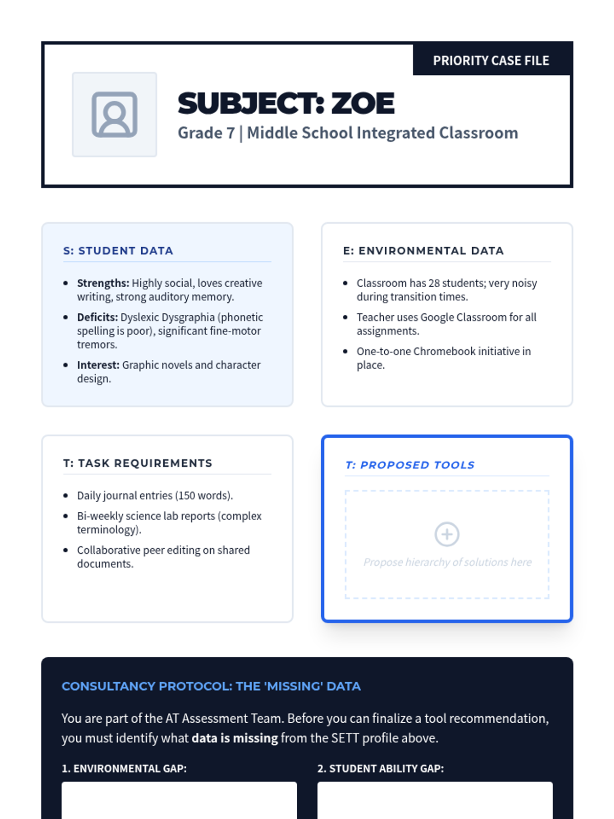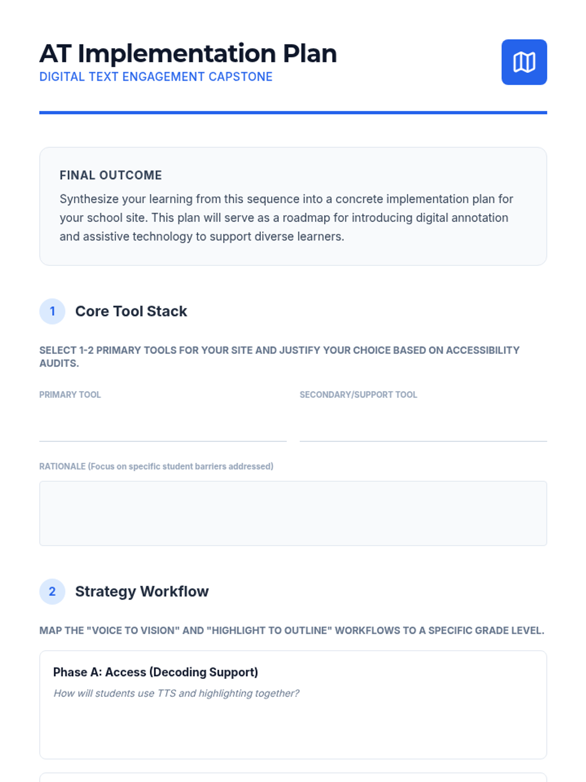 In this culminating workshop, students are given a detailed IEP profile and must design a comprehensive text engagement plan, selecting tools and instructional progressions suited for a specific learner.