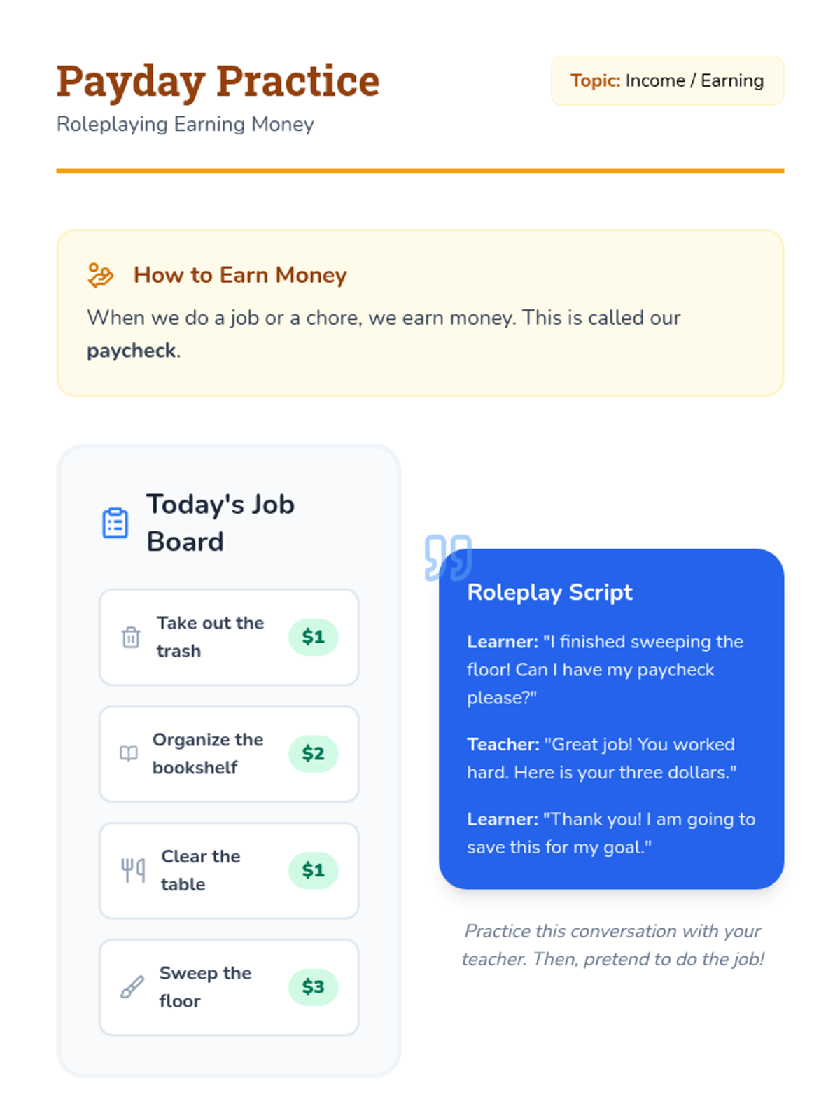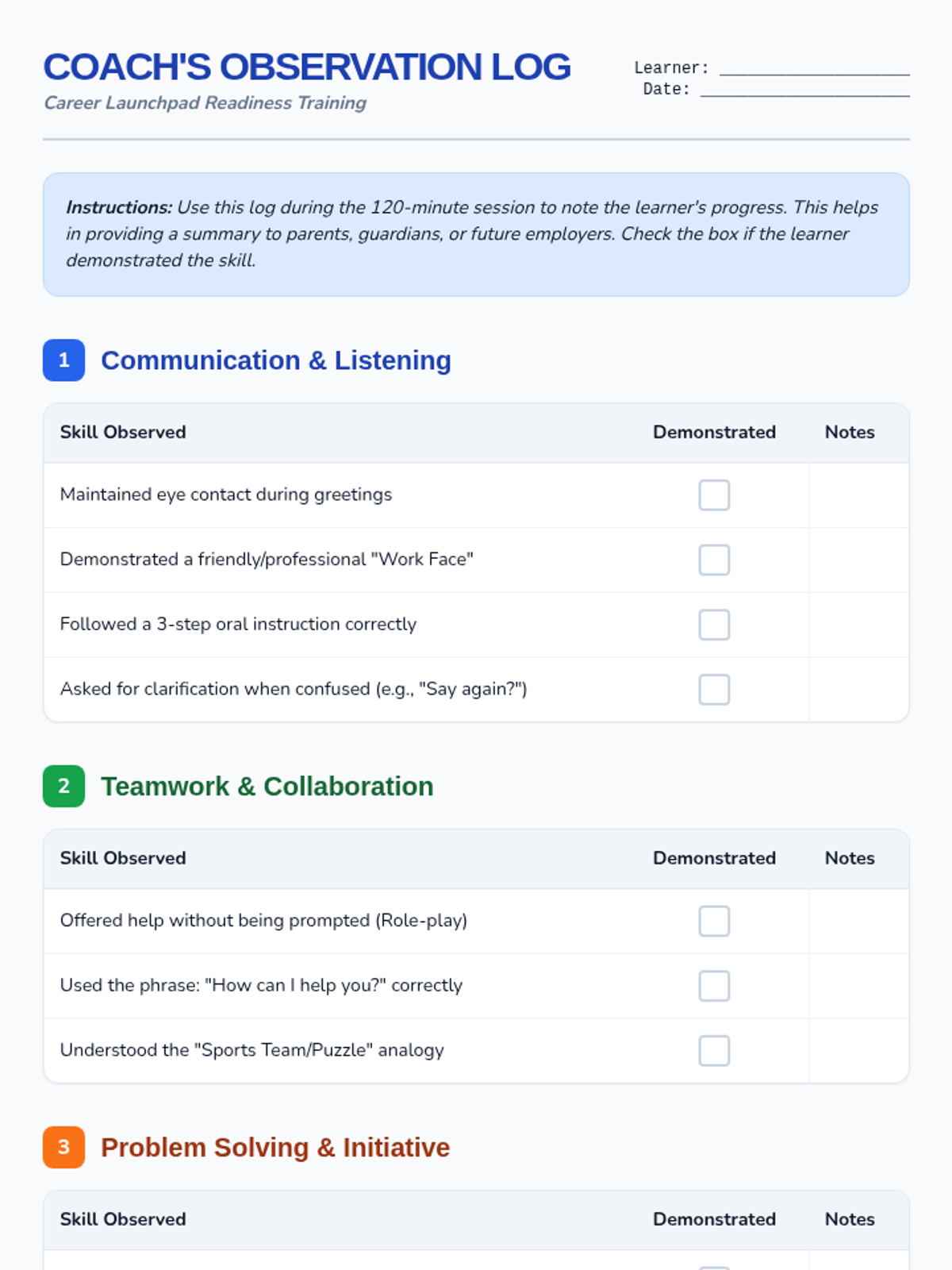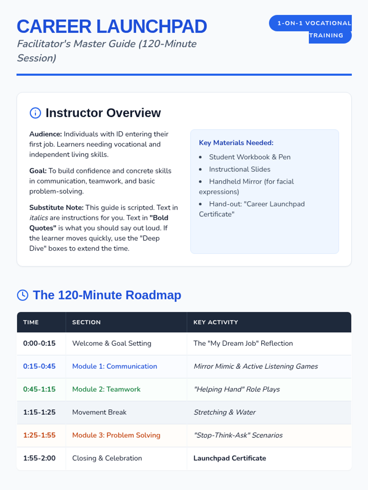 A comprehensive 120-minute one-on-one training session designed for individuals with intellectual disabilities. This lesson covers professional communication, teamwork, and problem-solving through scripted instruction, role-play, and practical activities.