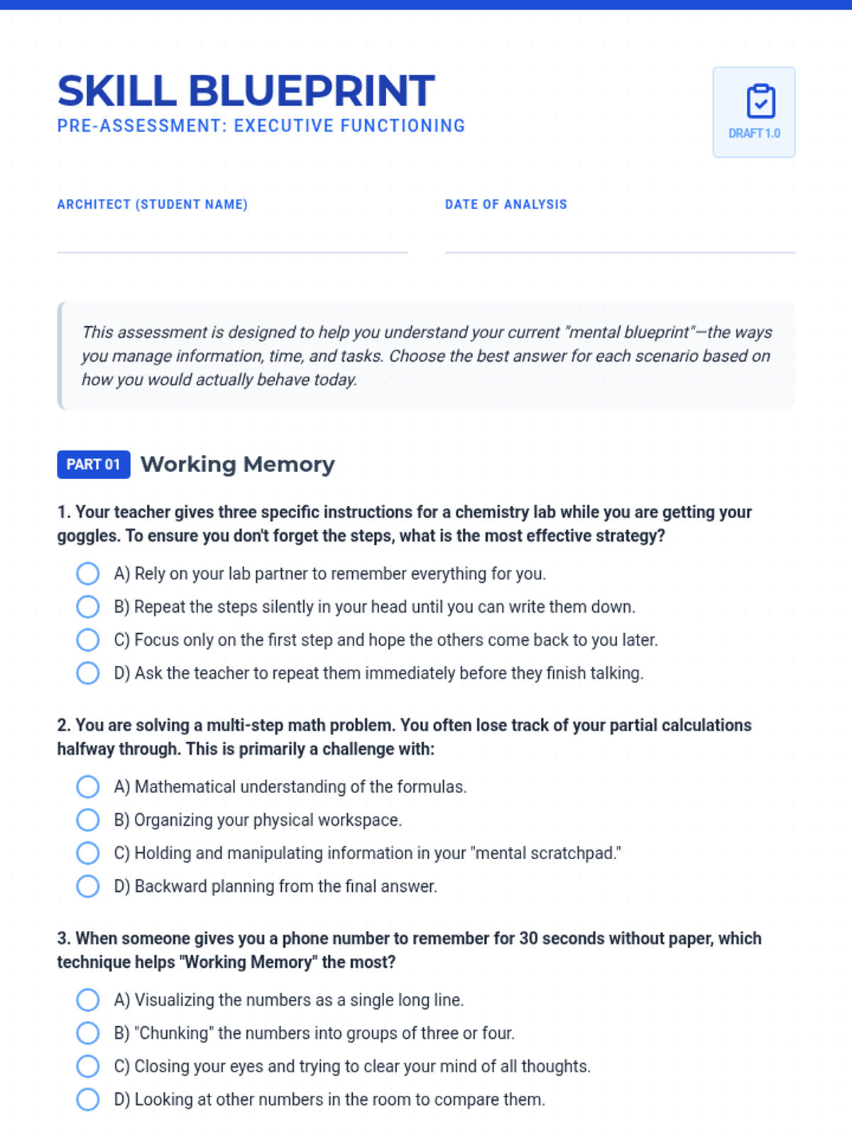 A comprehensive assessment suite designed for high school students to measure growth in key executive function skills: working memory, planning, organization, and backward planning.