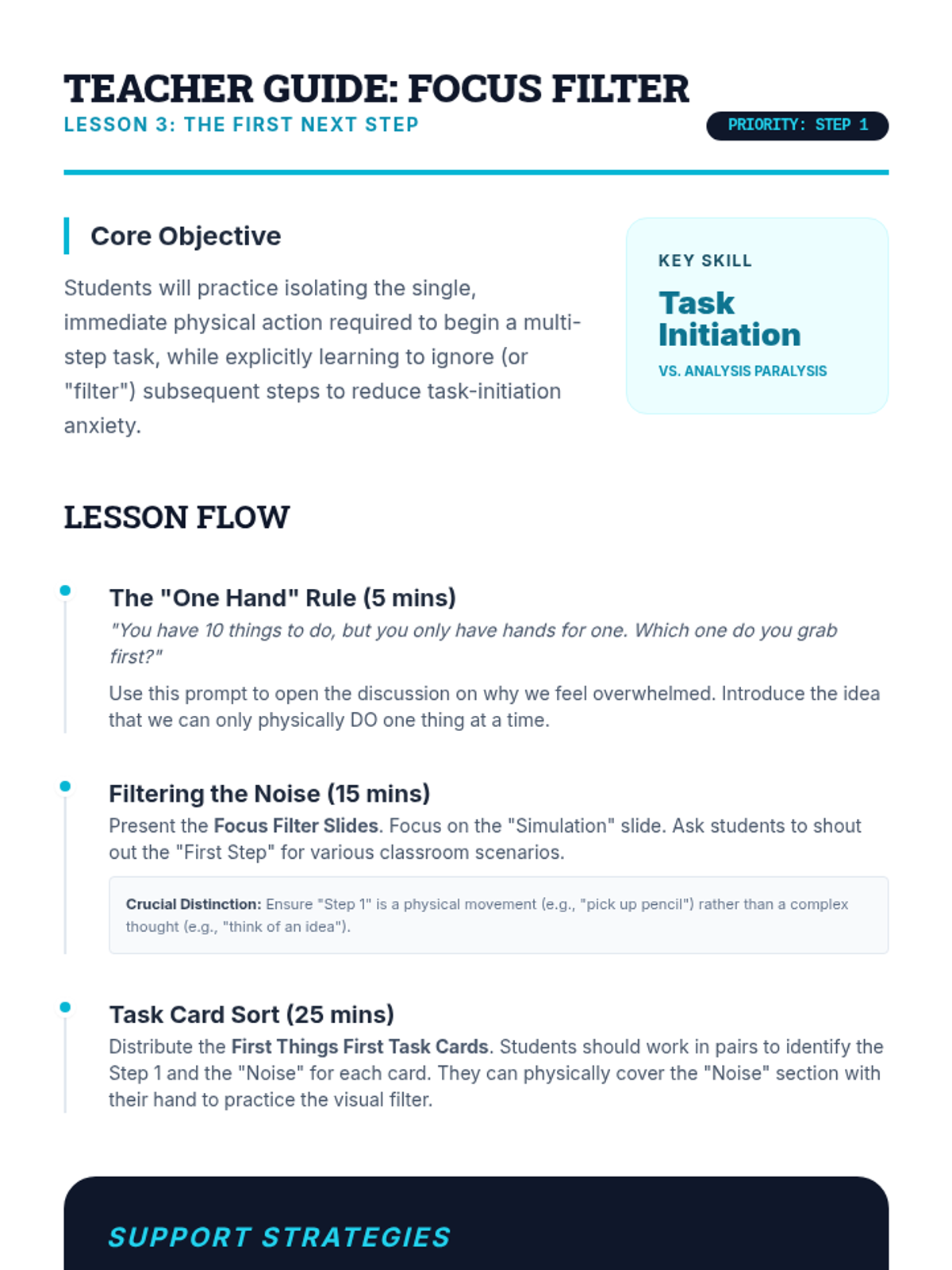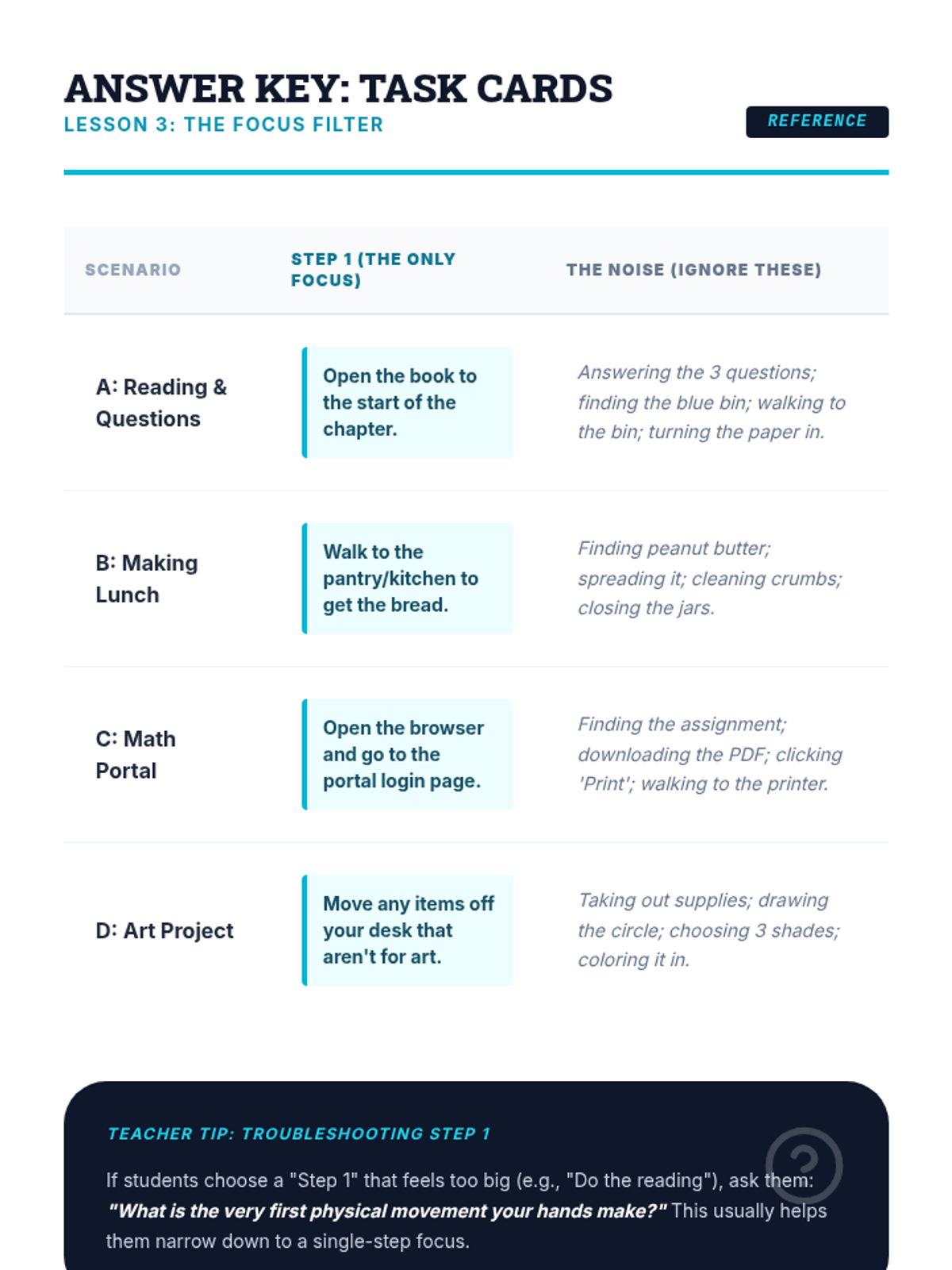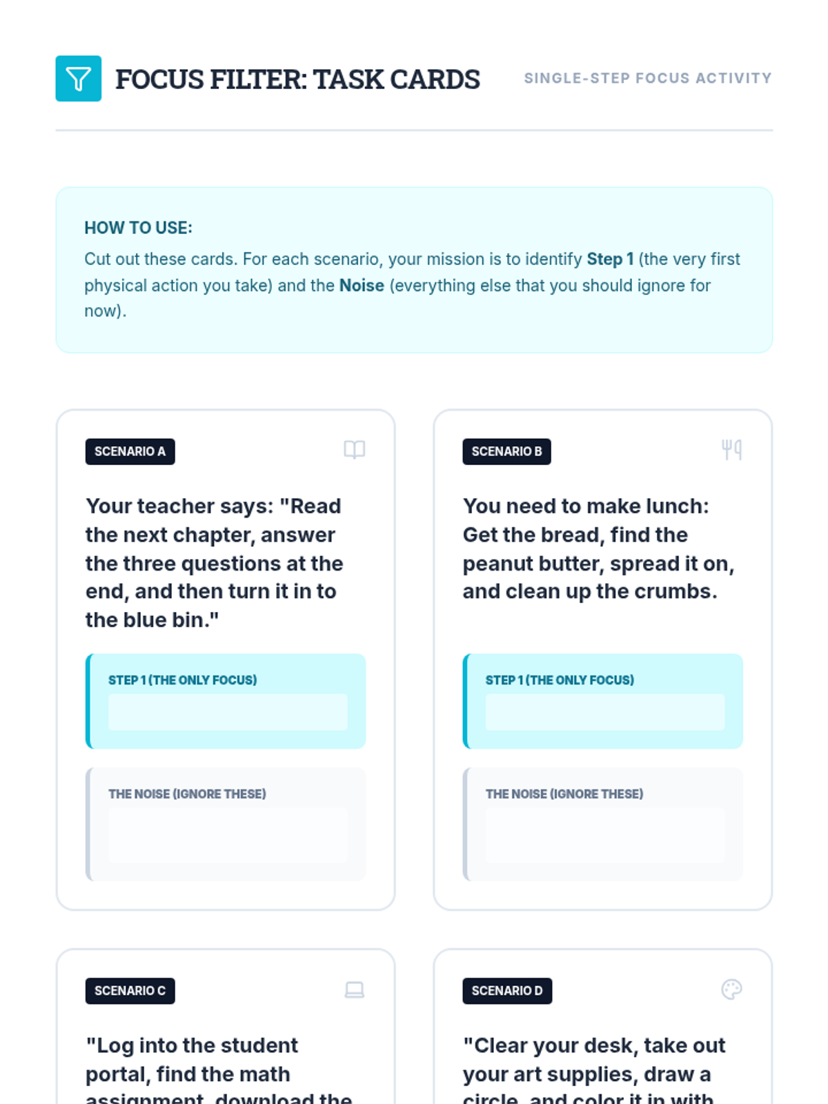 Students practice isolating and initiating the very first step of a multi-step task to reduce overwhelm and start tasks effectively.