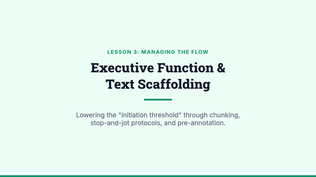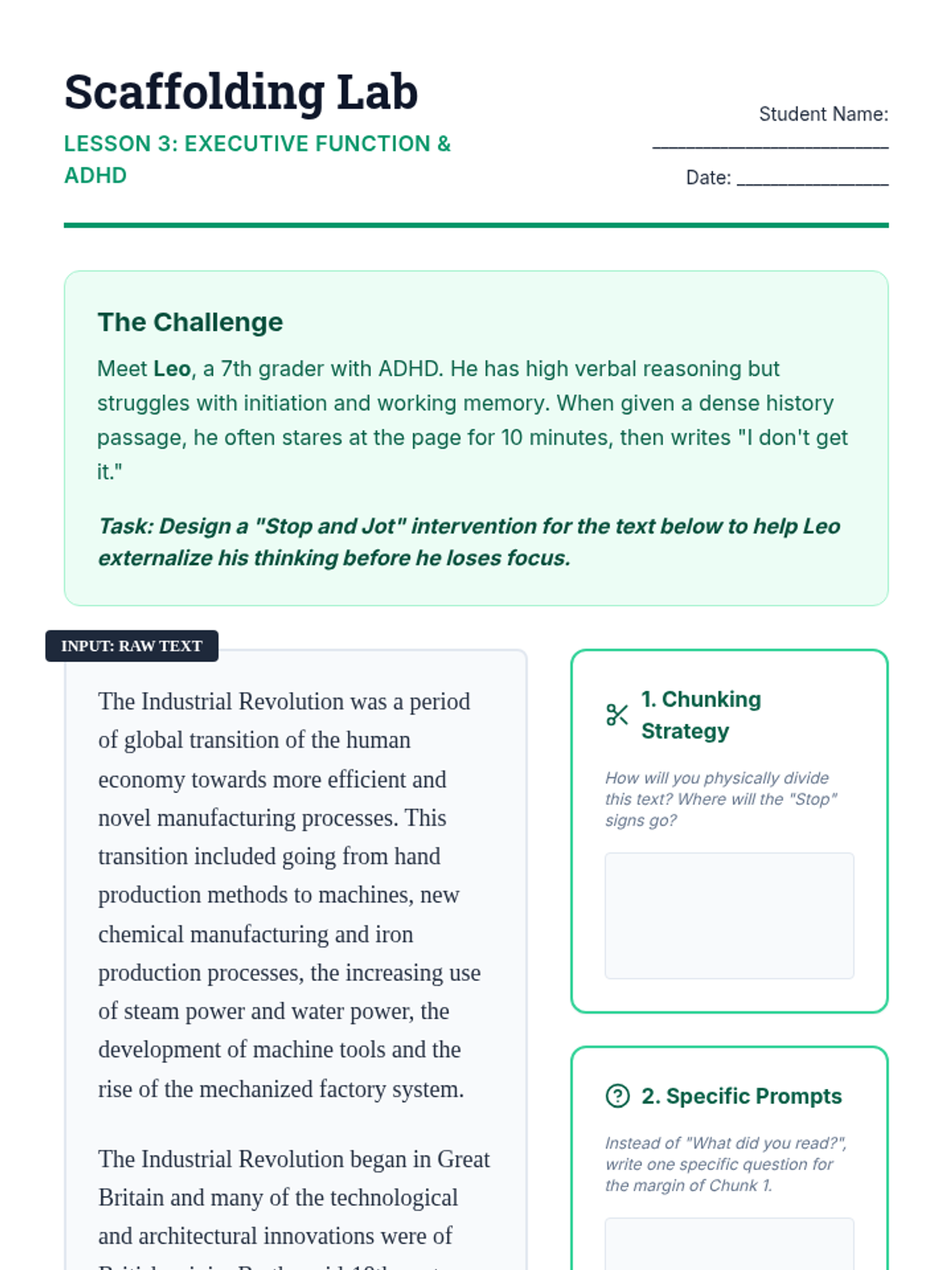 Focusing on executive function, students design 'Stop and Jot' protocols and create pre-annotated texts to reduce cognitive load and initiation thresholds for learners with ADHD.