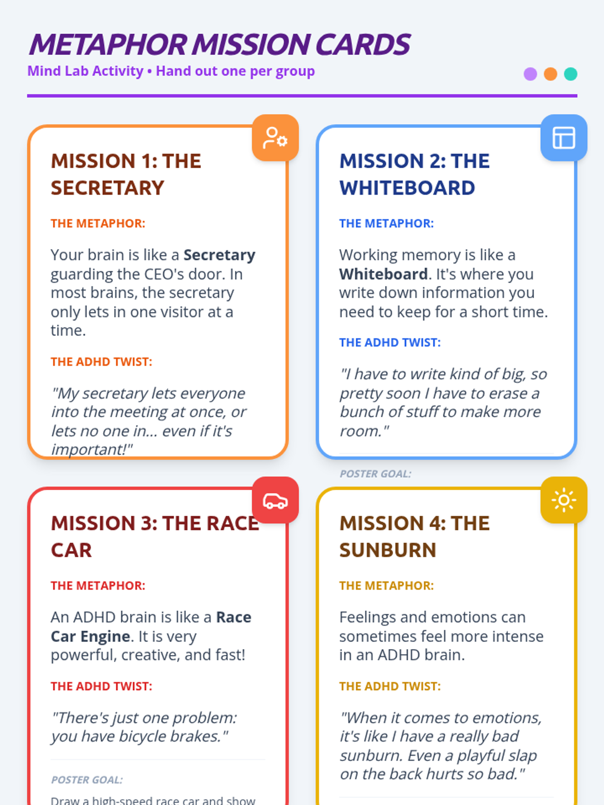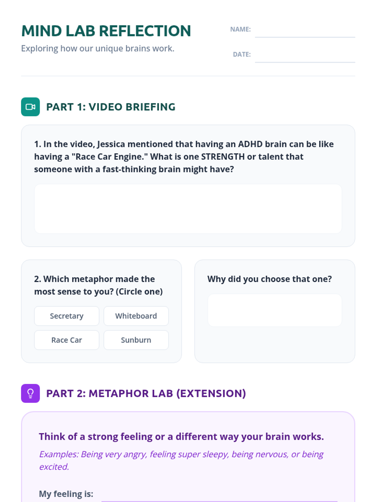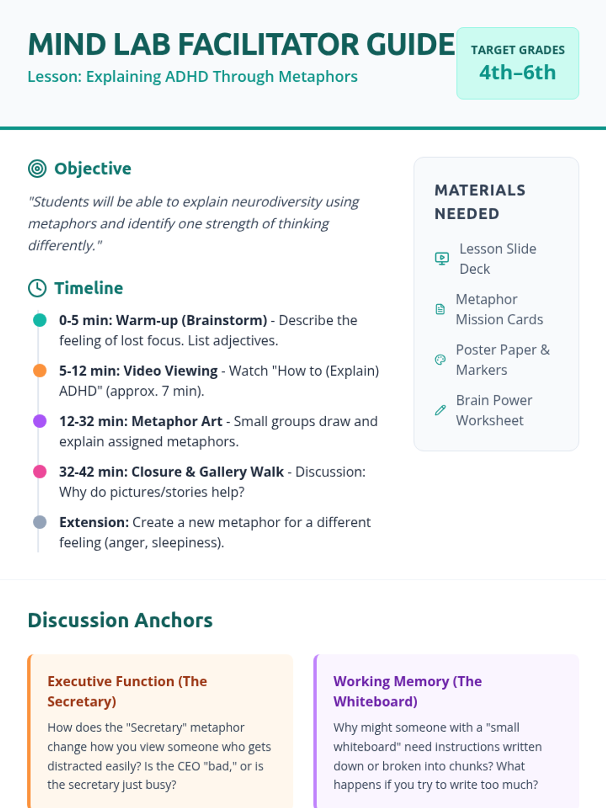 Students explore neurodiversity through the lens of ADHD using powerful metaphors like the Race Car Brain and the Brain Secretary. They will learn to identify brain-based differences as unique strengths and challenges rather than character flaws.
