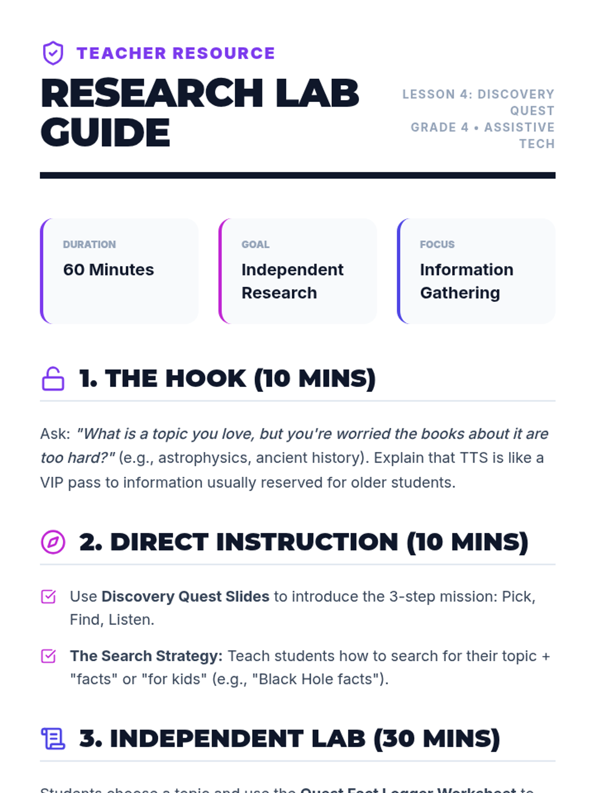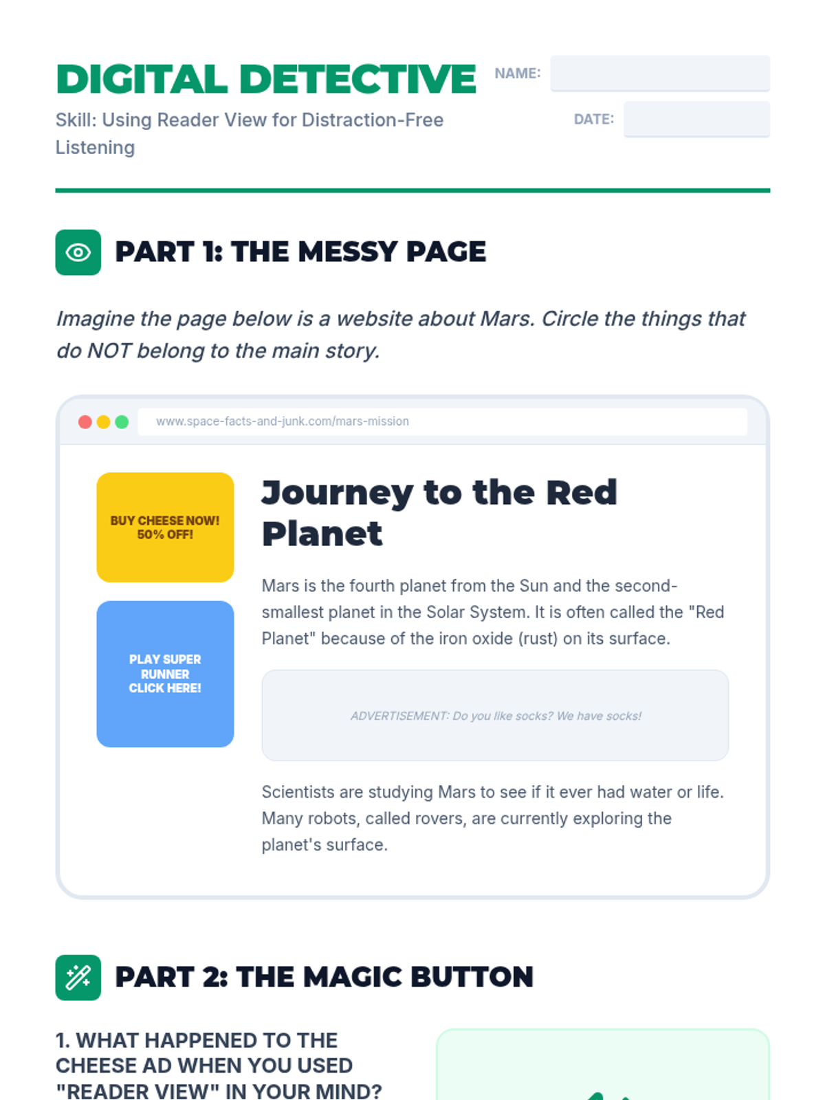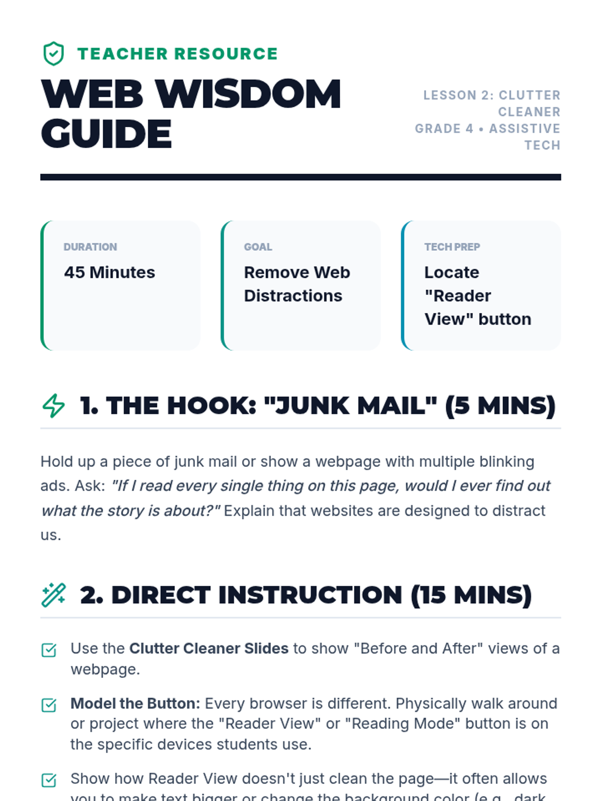 Students learn to use 'Reader View' or text-only modes in conjunction with TTS to strip away ads and distractions on websites. This focuses the audio on the main content.