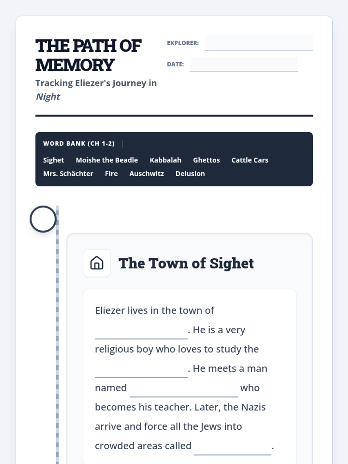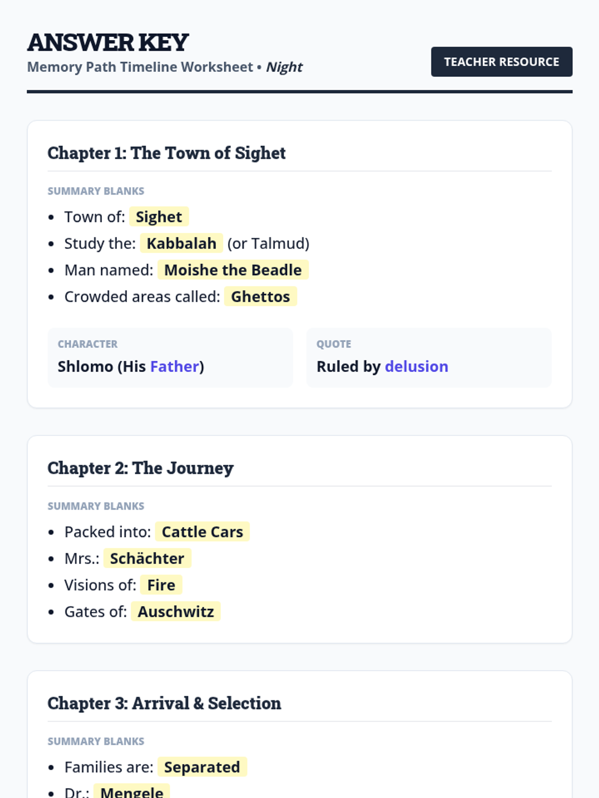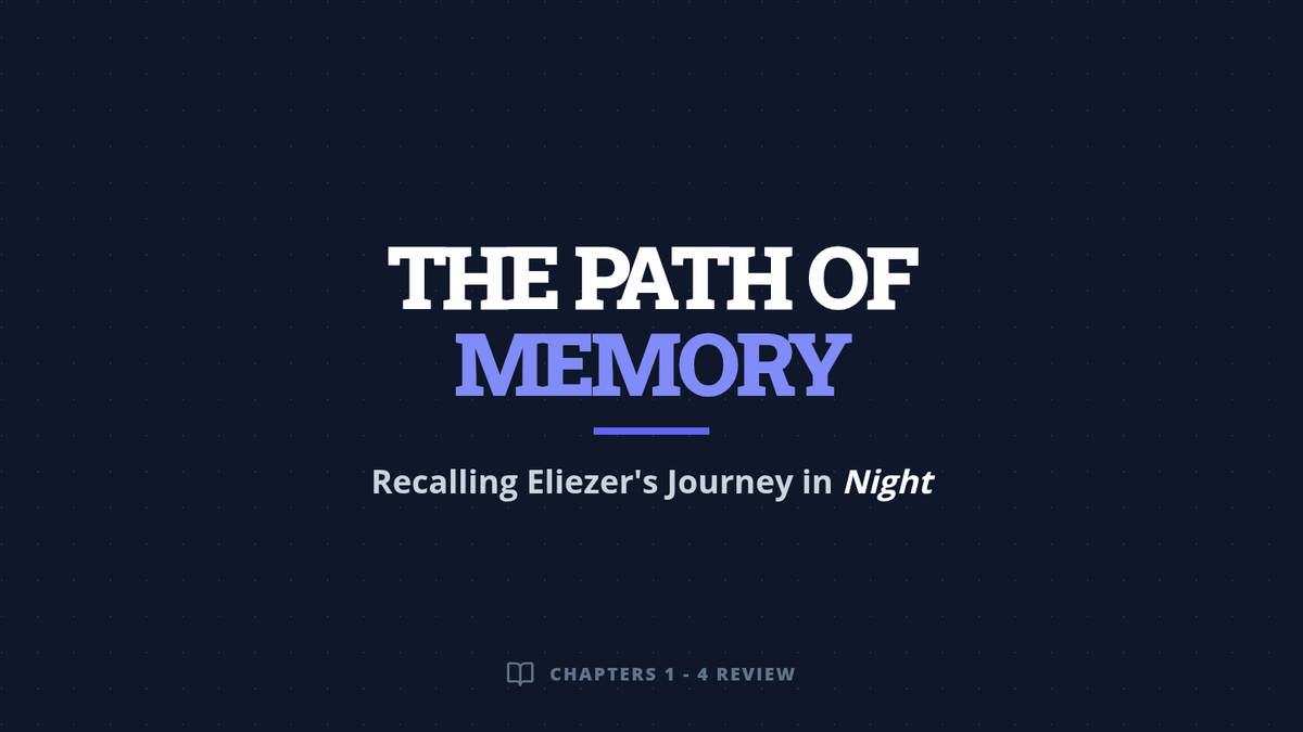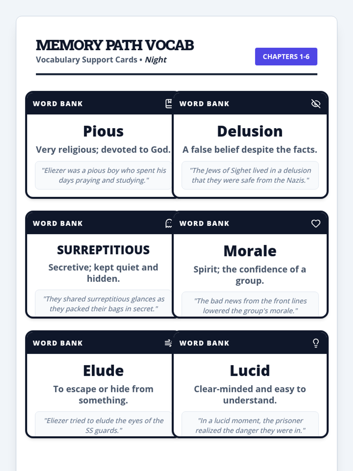 A specialized support lesson for students reading 'Night' by Elie Wiesel, focusing on memory retrieval, chronological tracking, and visual mapping of key events for Chapters 1-4.