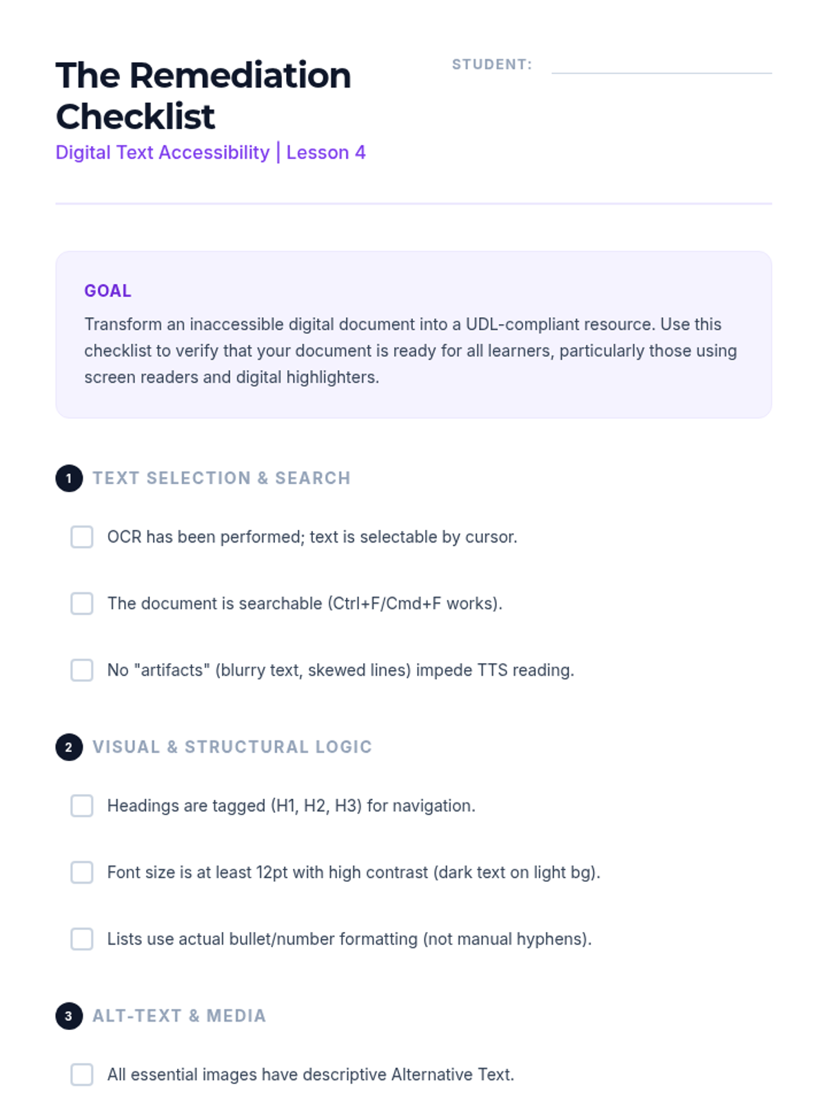 Apply UDL principles to digital text, ensuring compatibility with screen readers and learning to remediate inaccessible documents.