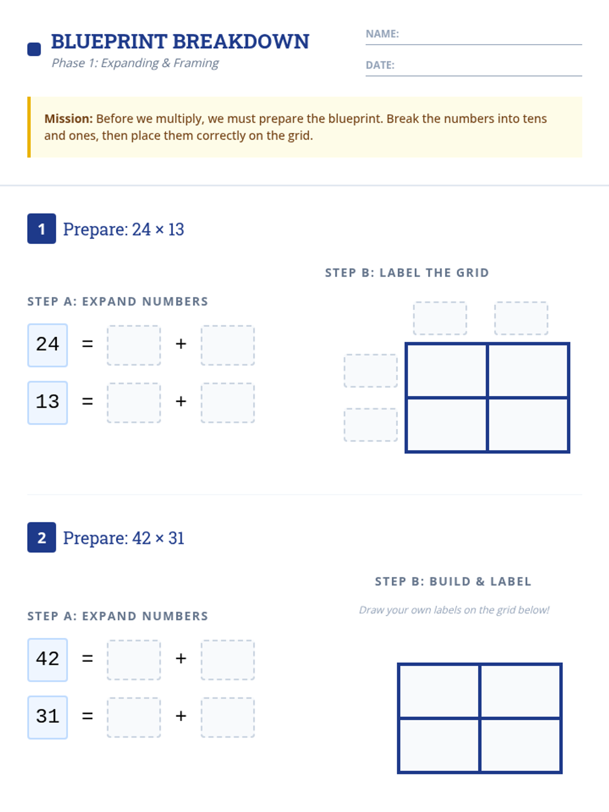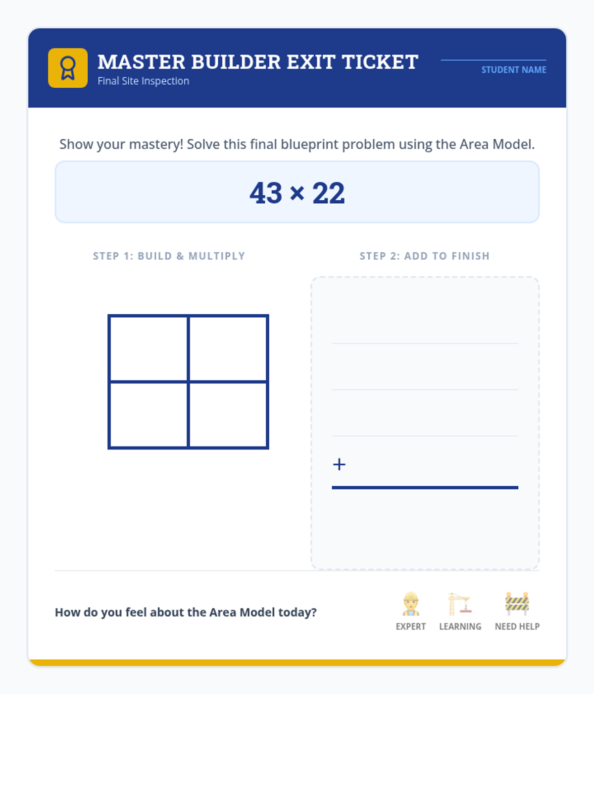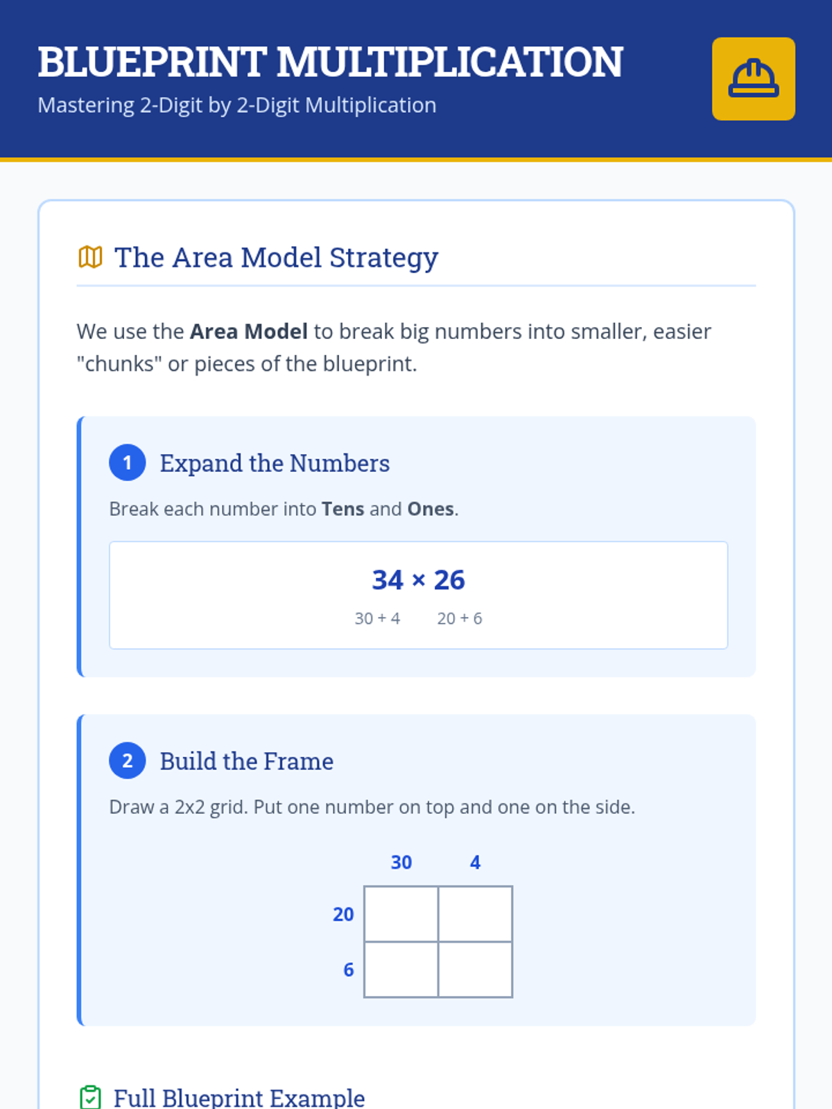 A specialized reteach lesson for fourth-grade students, focusing on double-digit multiplication using visual area models and chunked steps to support special education learners.
