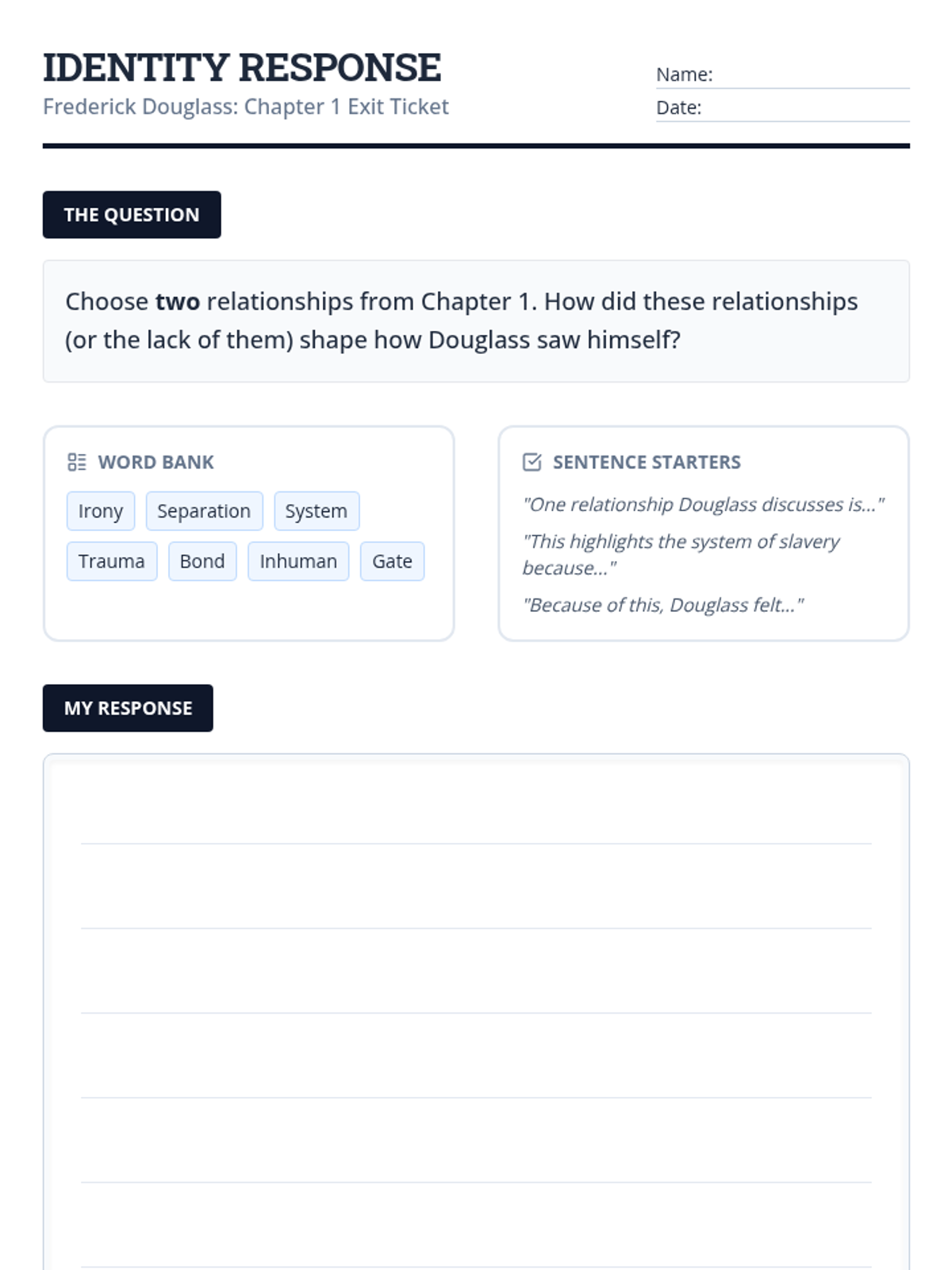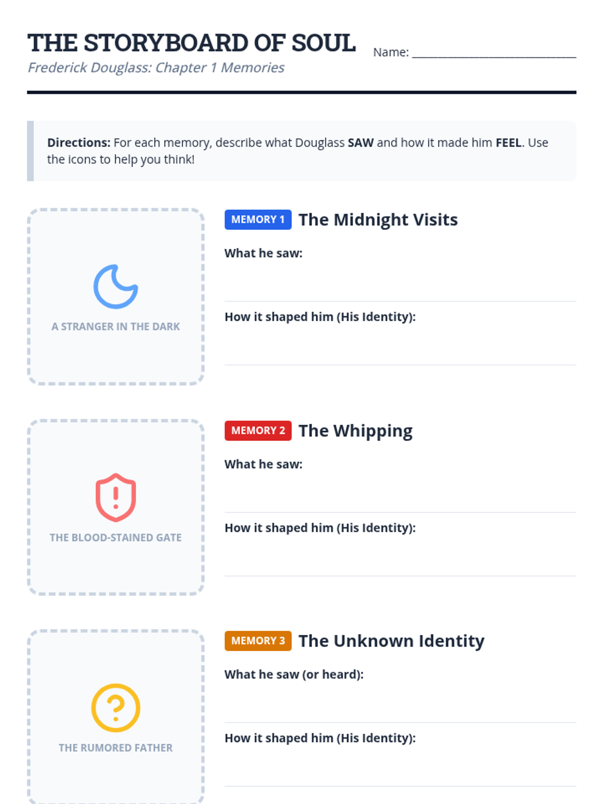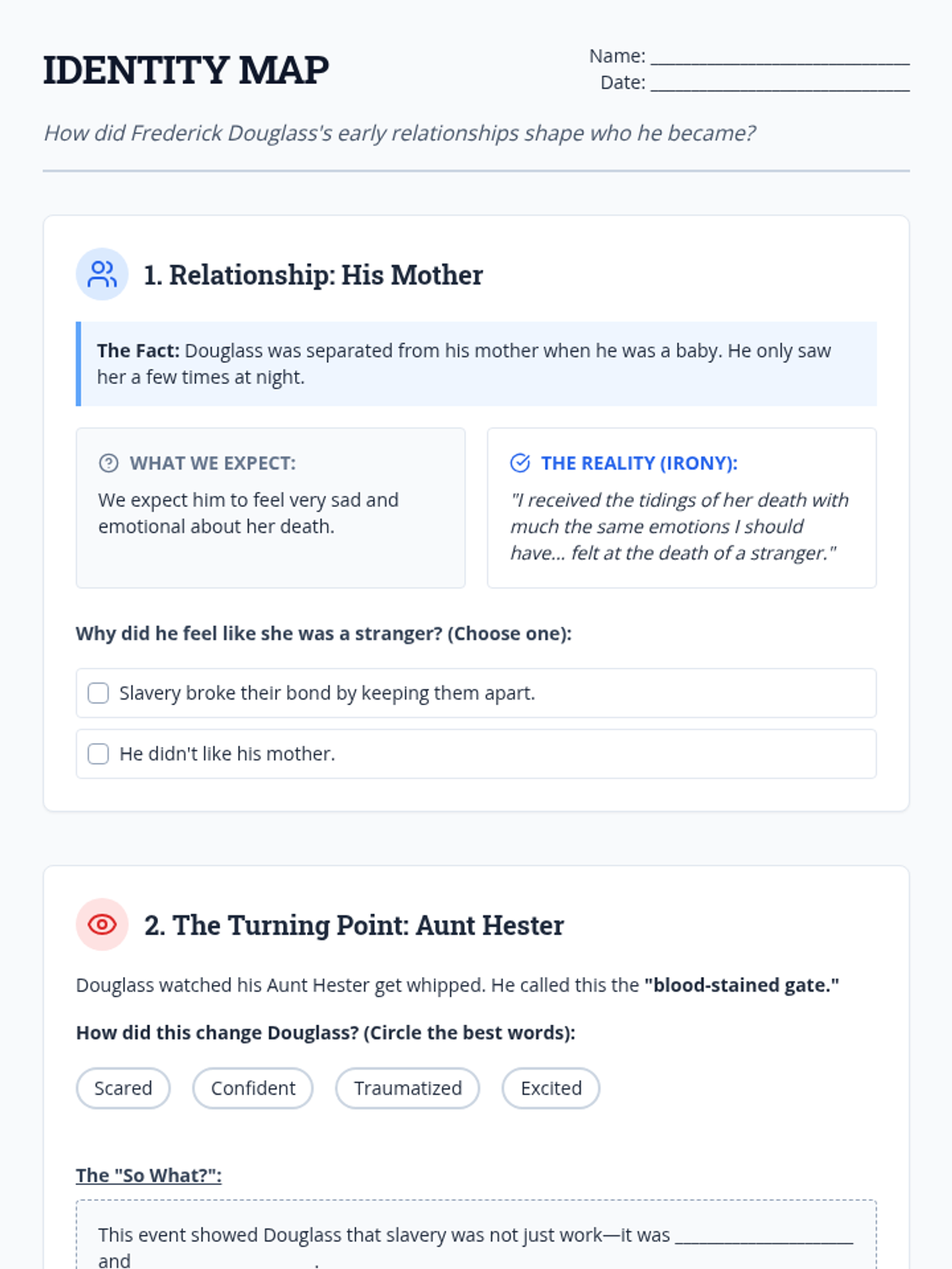 A modified version of the Frederick Douglass Chapter 1 lesson designed for SPED students, focusing on chunking information, visual organizers, and step-by-step writing supports to analyze how early relationships shaped Douglass's identity.