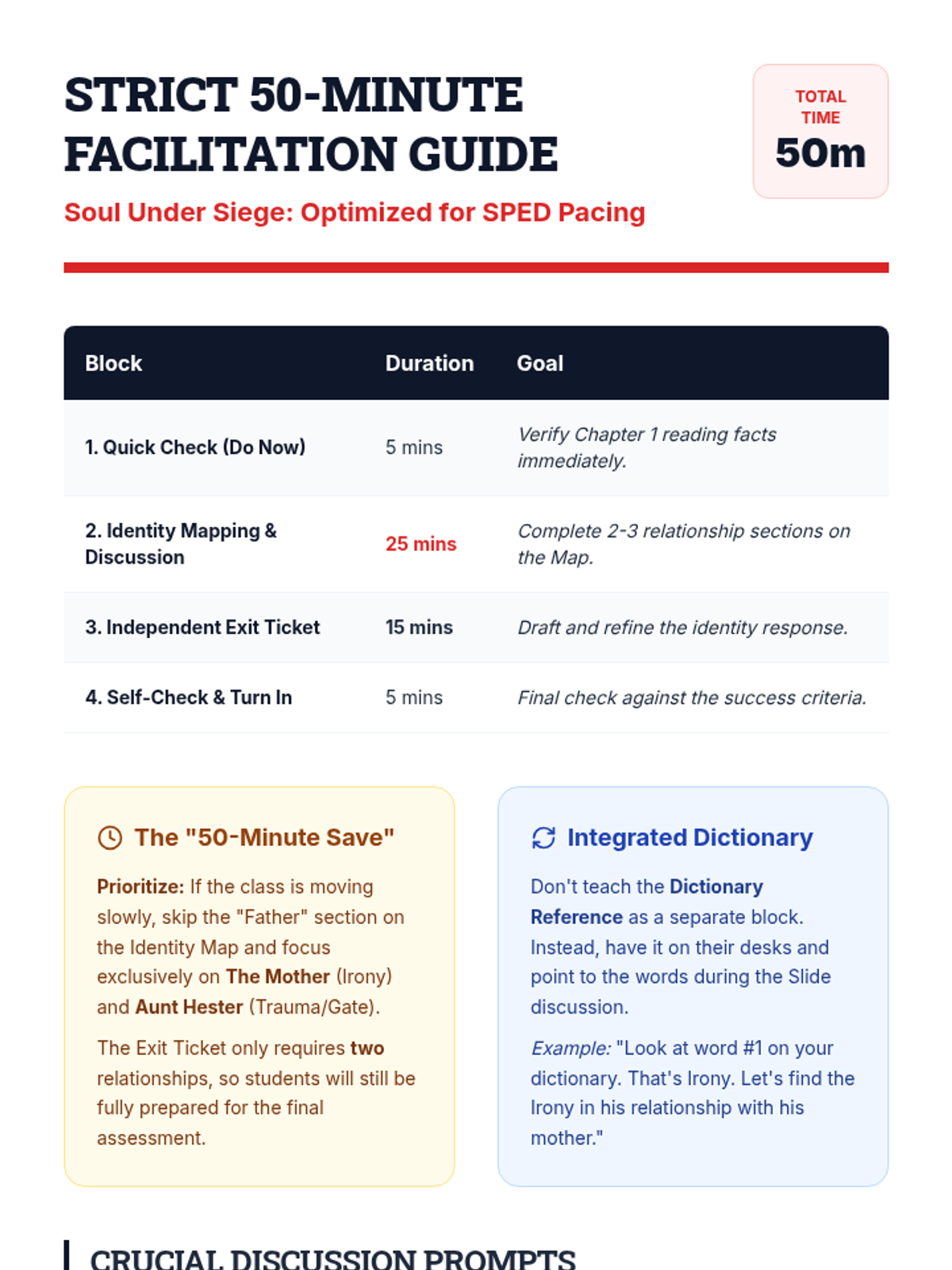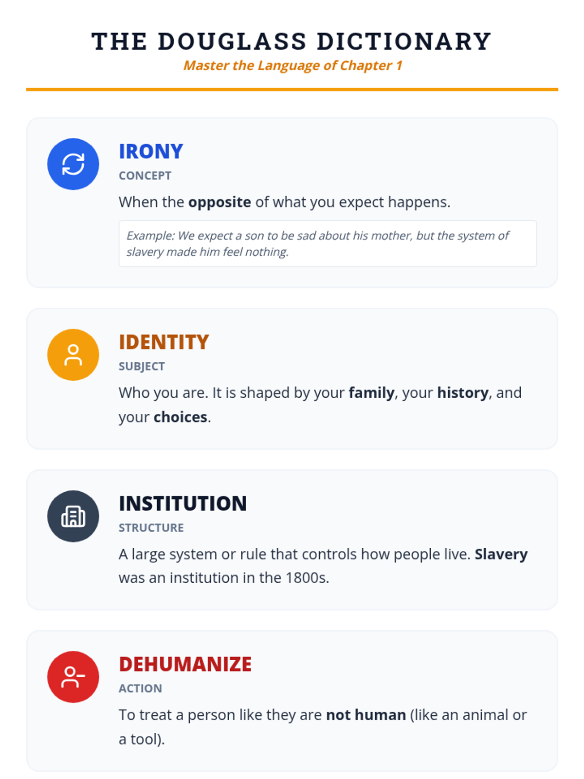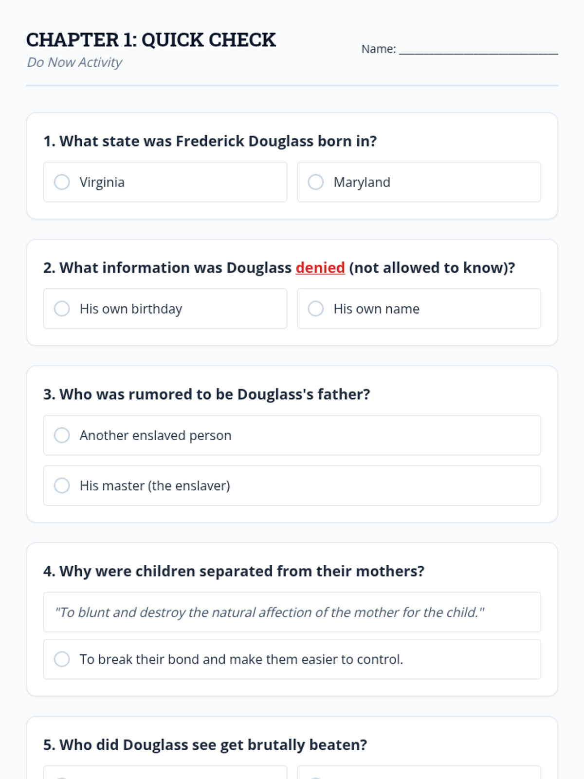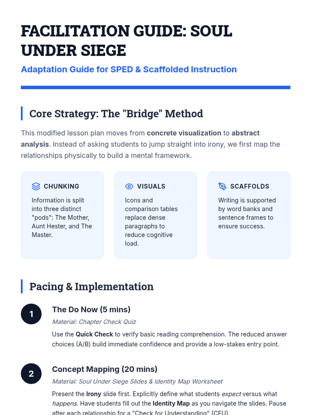A modified version of the Frederick Douglass Chapter 1 lesson designed for SPED students, focusing on chunking information, visual organizers, and step-by-step writing supports to analyze how early relationships shaped Douglass's identity.