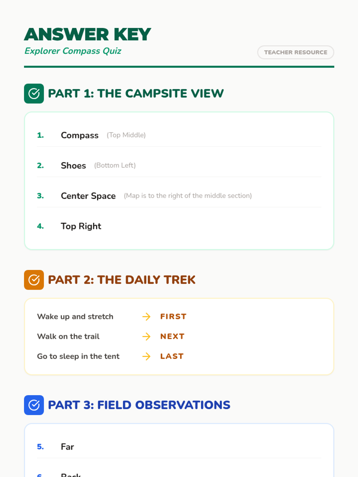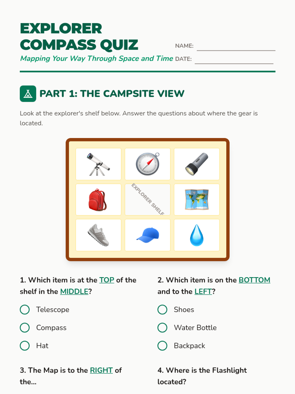 A lesson focused on mastering spatial and temporal concepts through visual review and a comprehensive assessment. Students will identify positions in space and sequences in time using an explorer-themed approach.