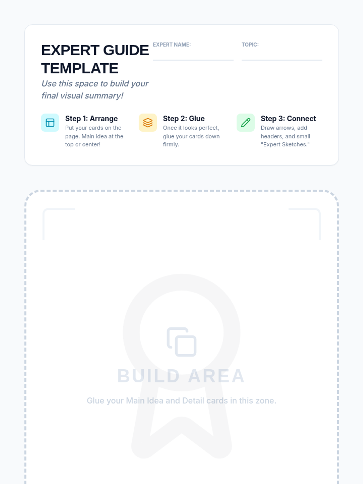 Students glue their arranged notes onto a poster or template to create a 'One-Page Expert Guide.' They add headers and arrows to connect the ideas, effectively creating a graphic organizer from their original text highlights.