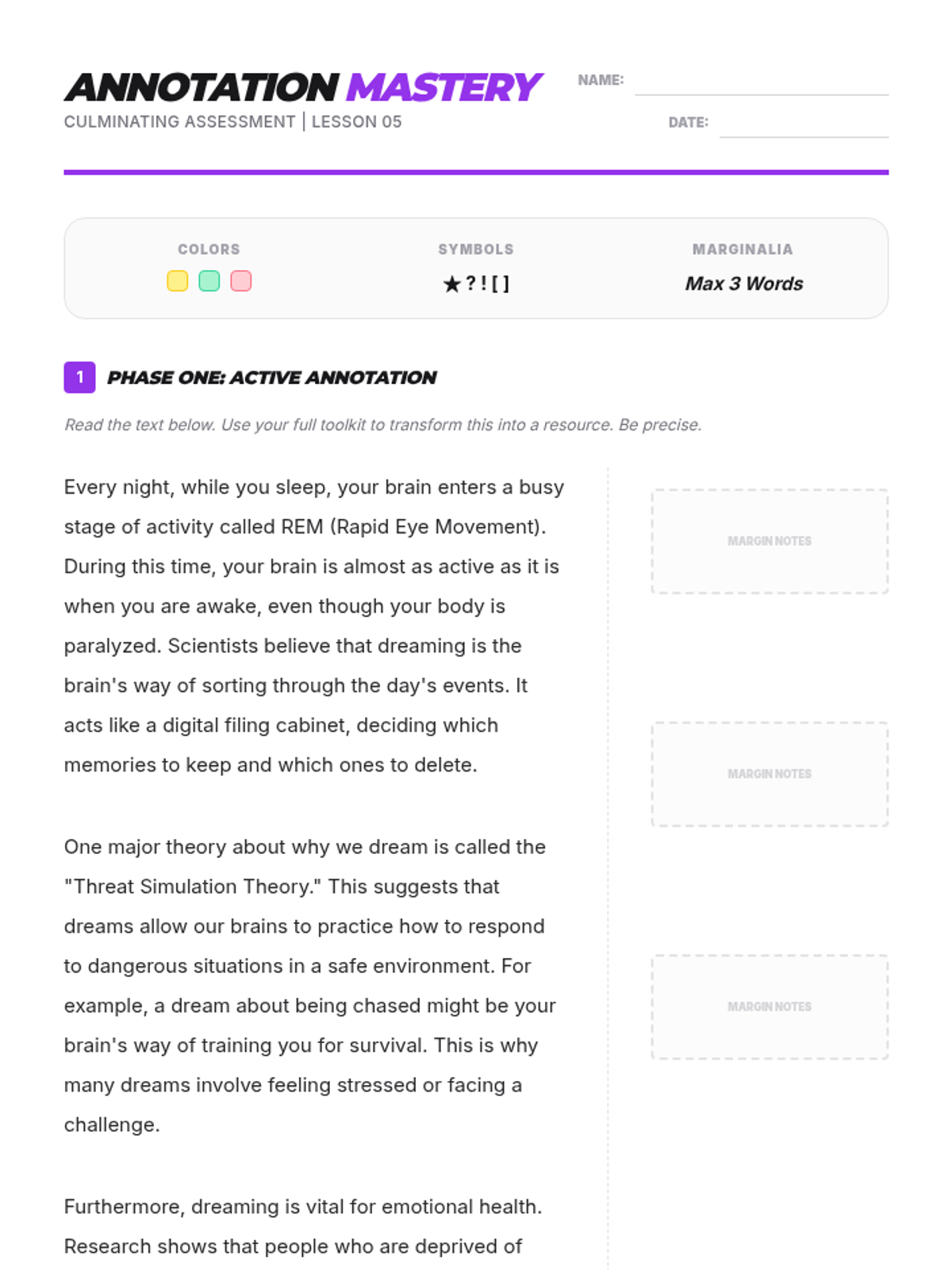 Students independently process a fresh text using all strategies: color-coding, symbols, and marginal notes. They then use only their annotations to construct a short summary, proving the utility of their notes for retention.