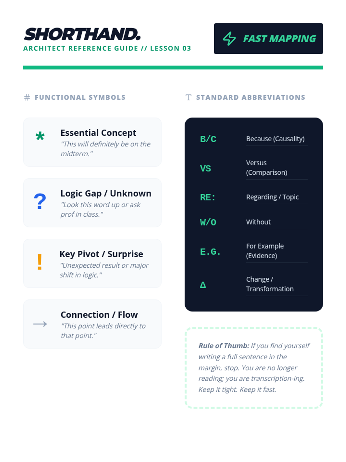 Introduction of symbol shorthand and rapid marginalia techniques to synthesize complex ideas into concise notes.