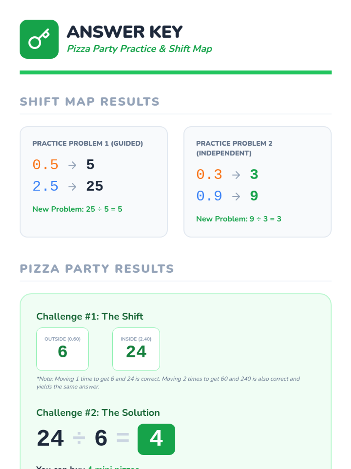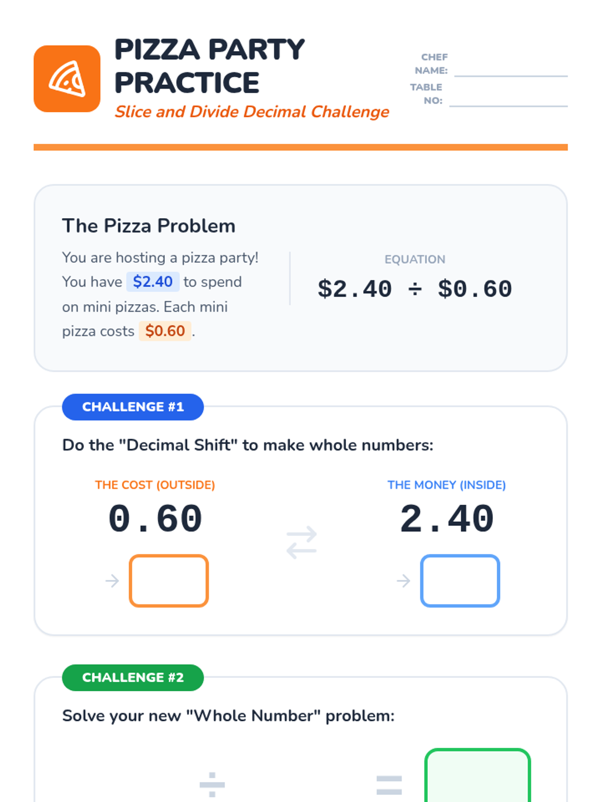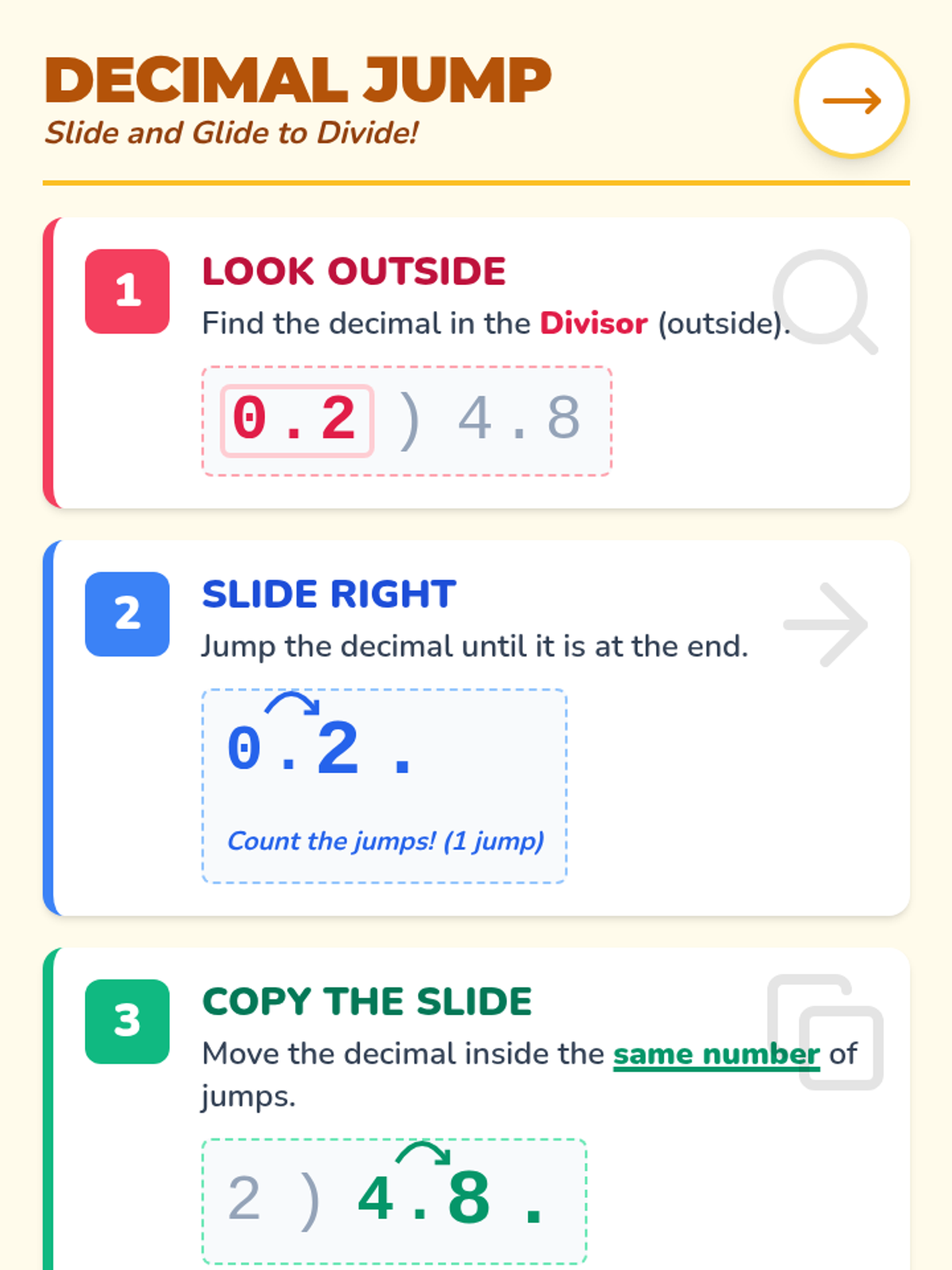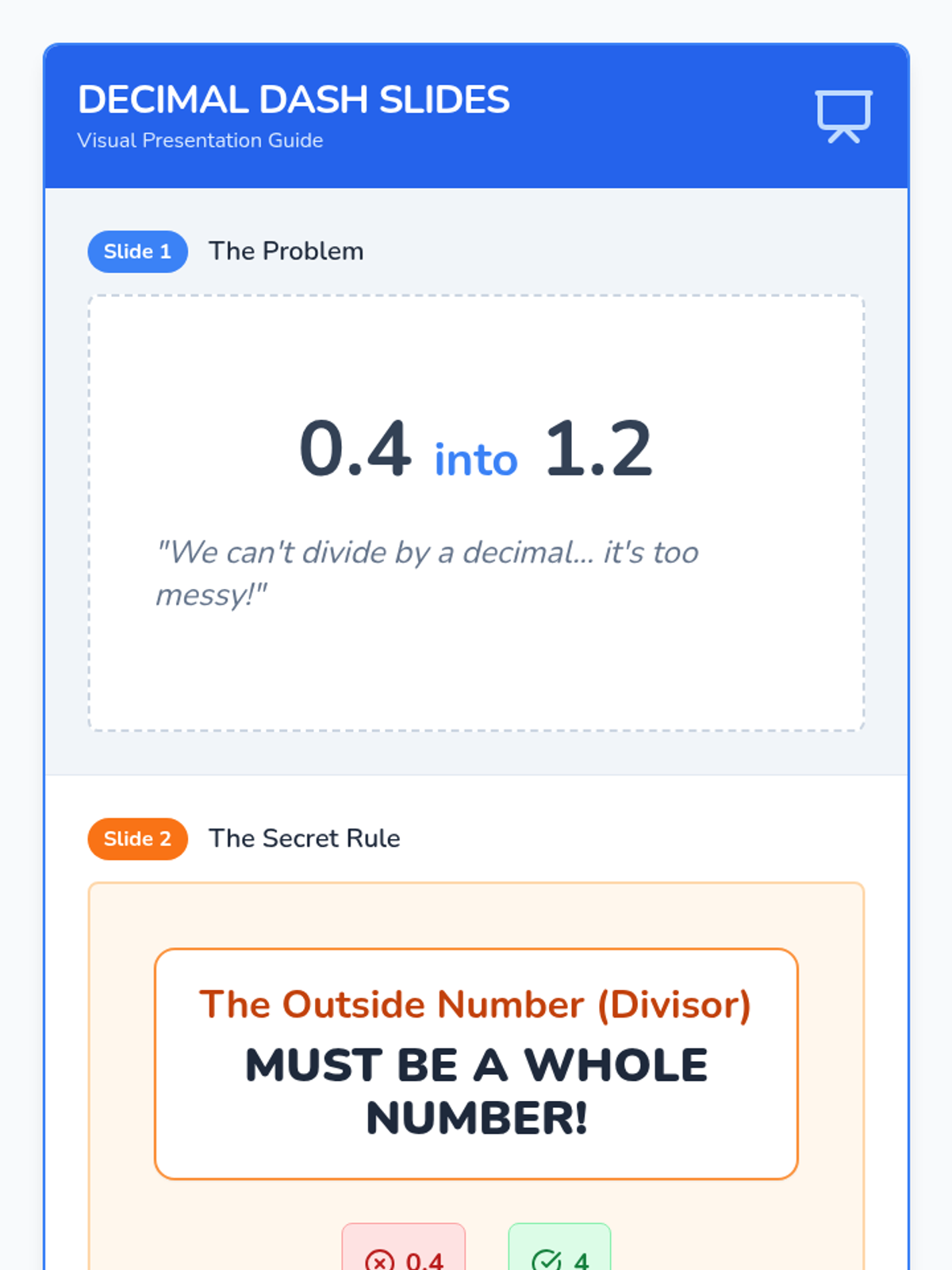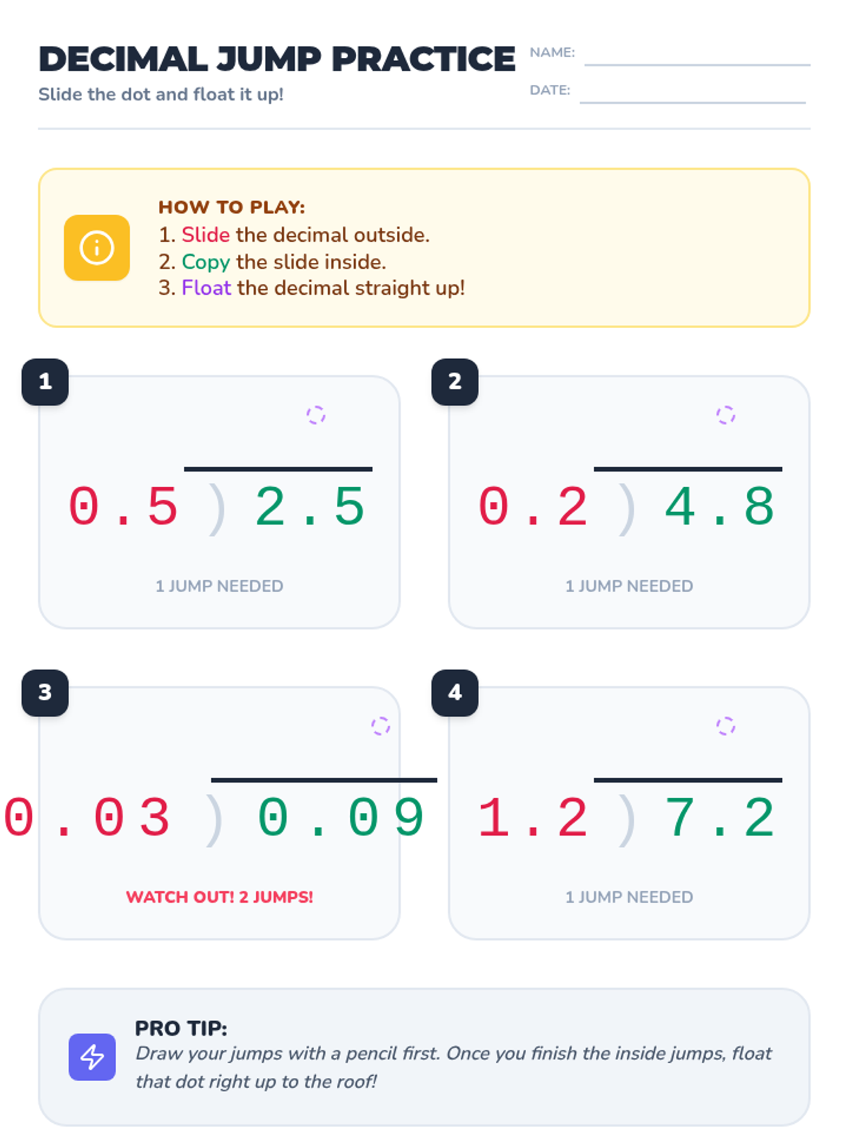 This lesson focuses on the foundational skill of moving the decimal point in division problems, specifically designed for students who benefit from clear, visual, step-by-step instructions.