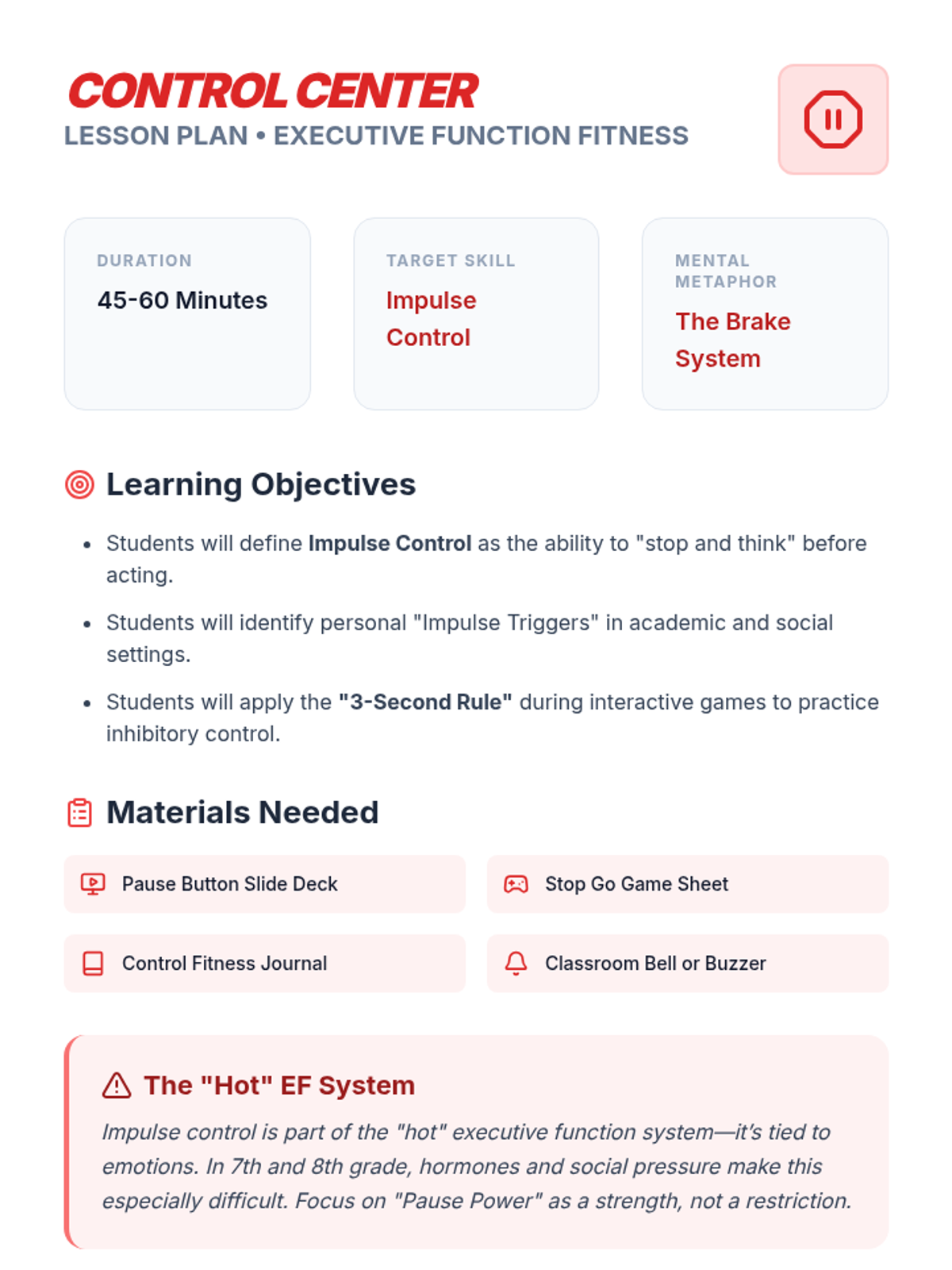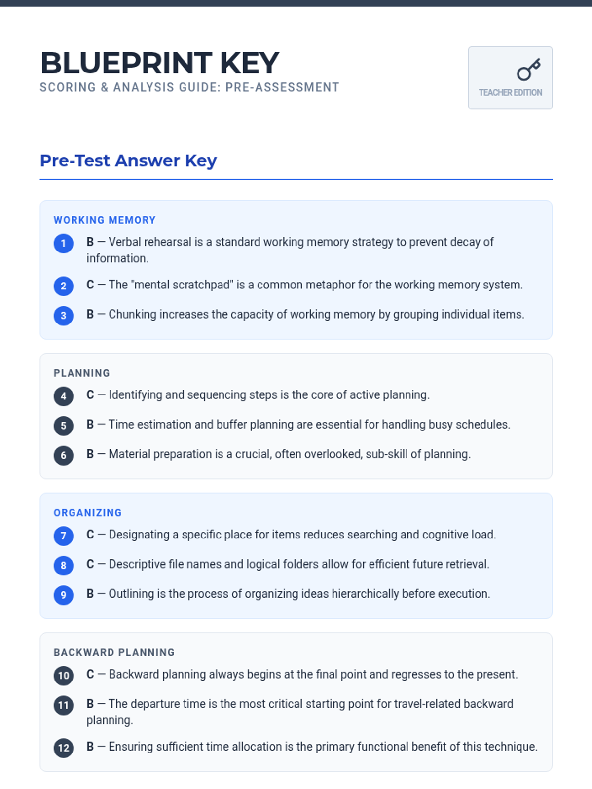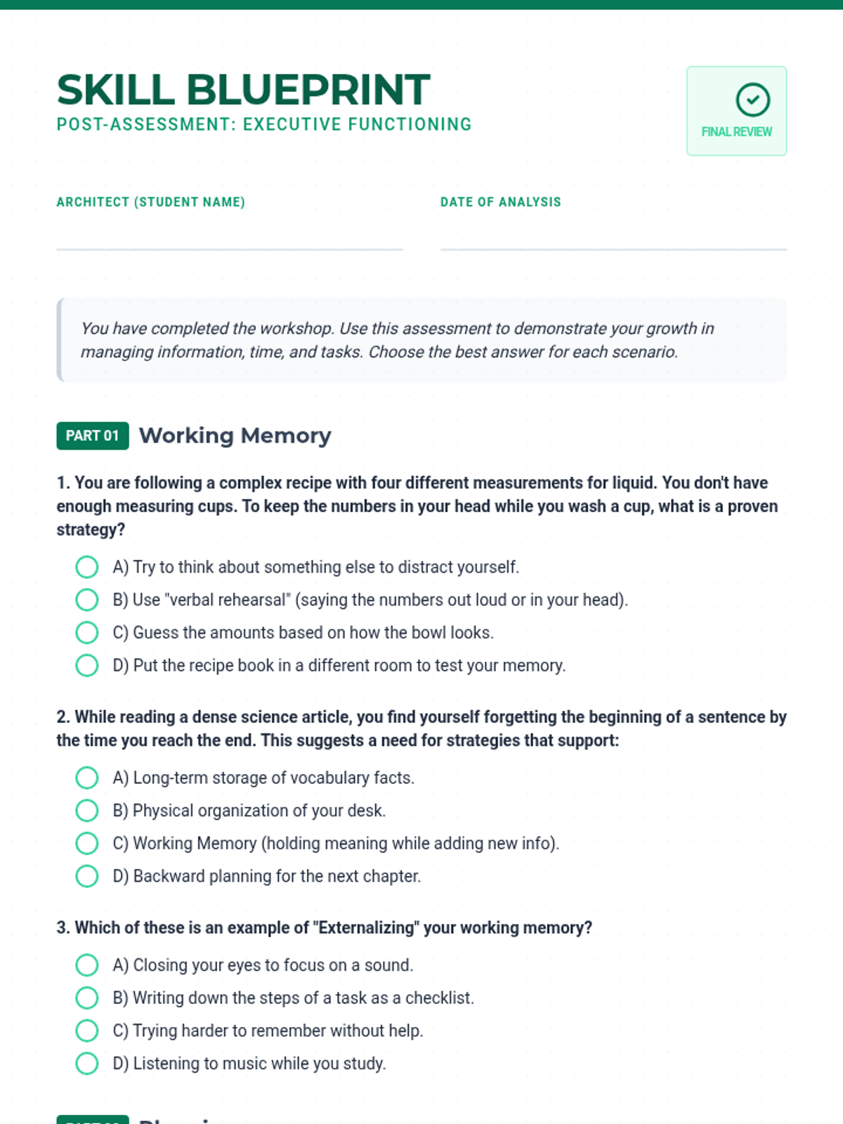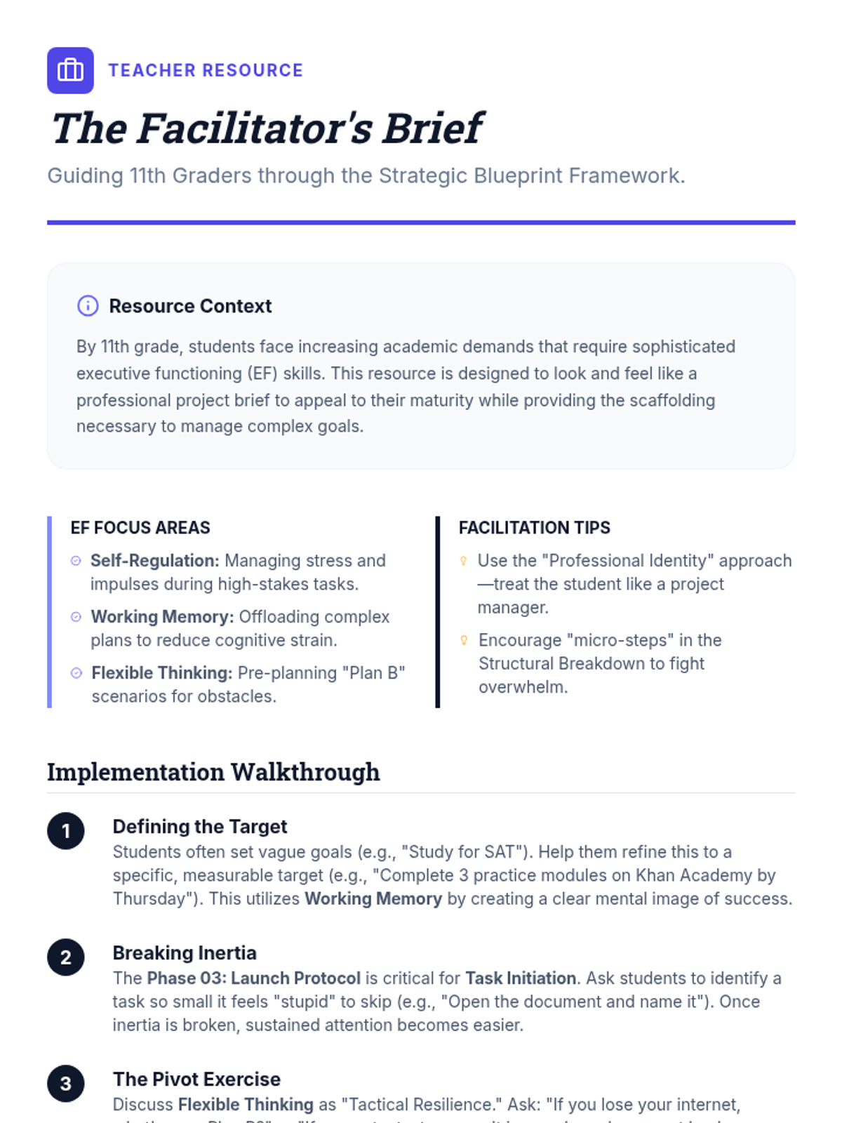 A specialized framework designed for high school students to master complex executive functioning skills through structured goal-setting and strategic planning. This lesson targets self-regulation, working memory, and task initiation within a professional-grade planning context.
