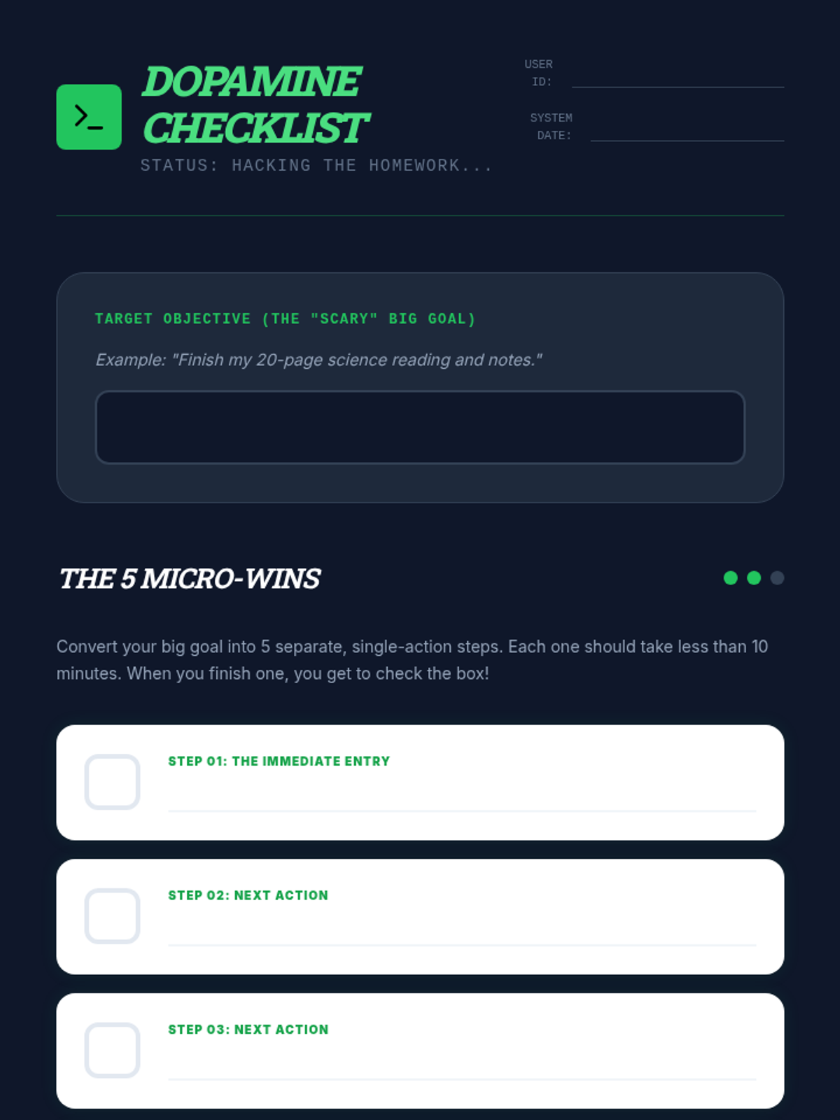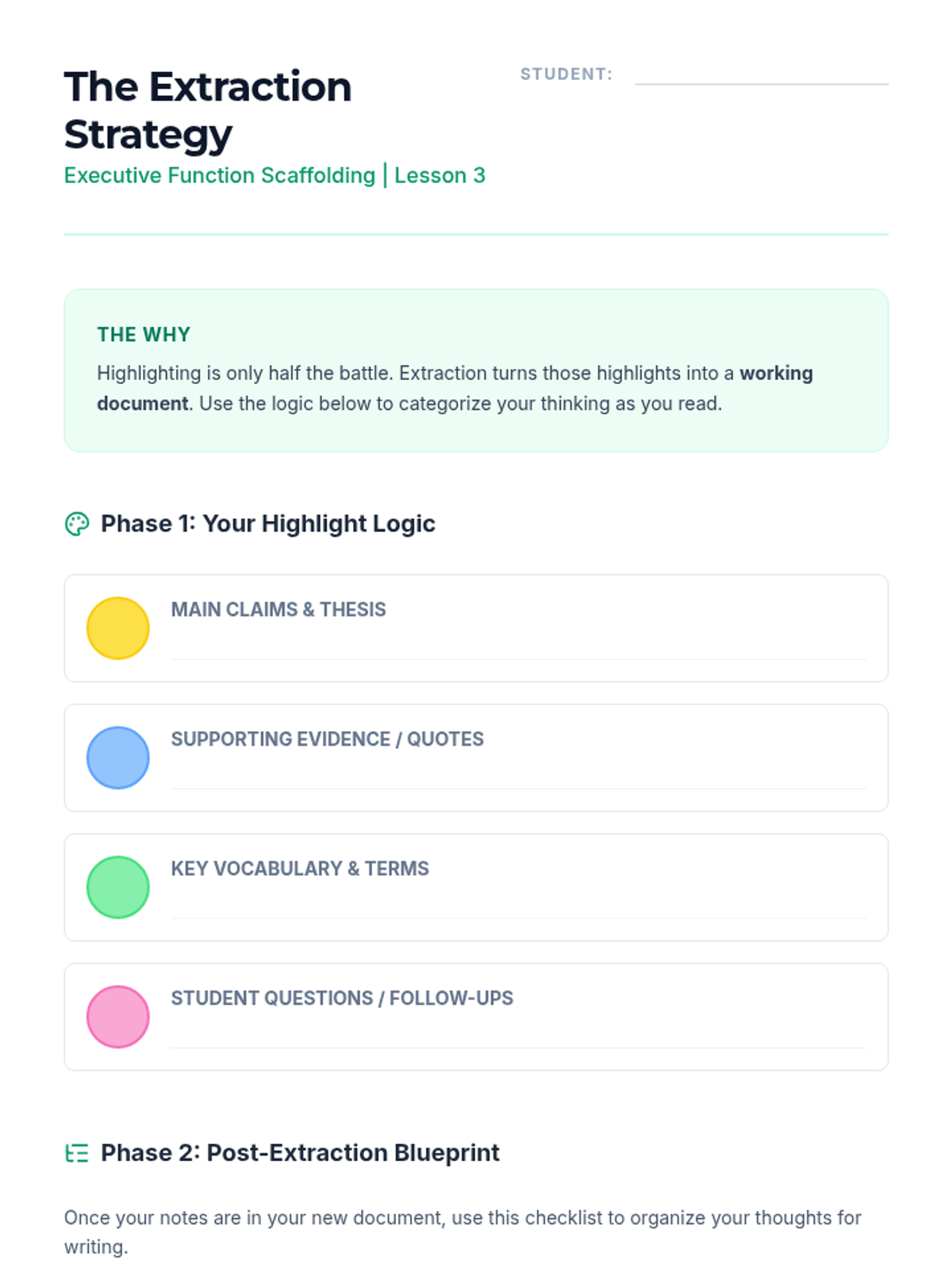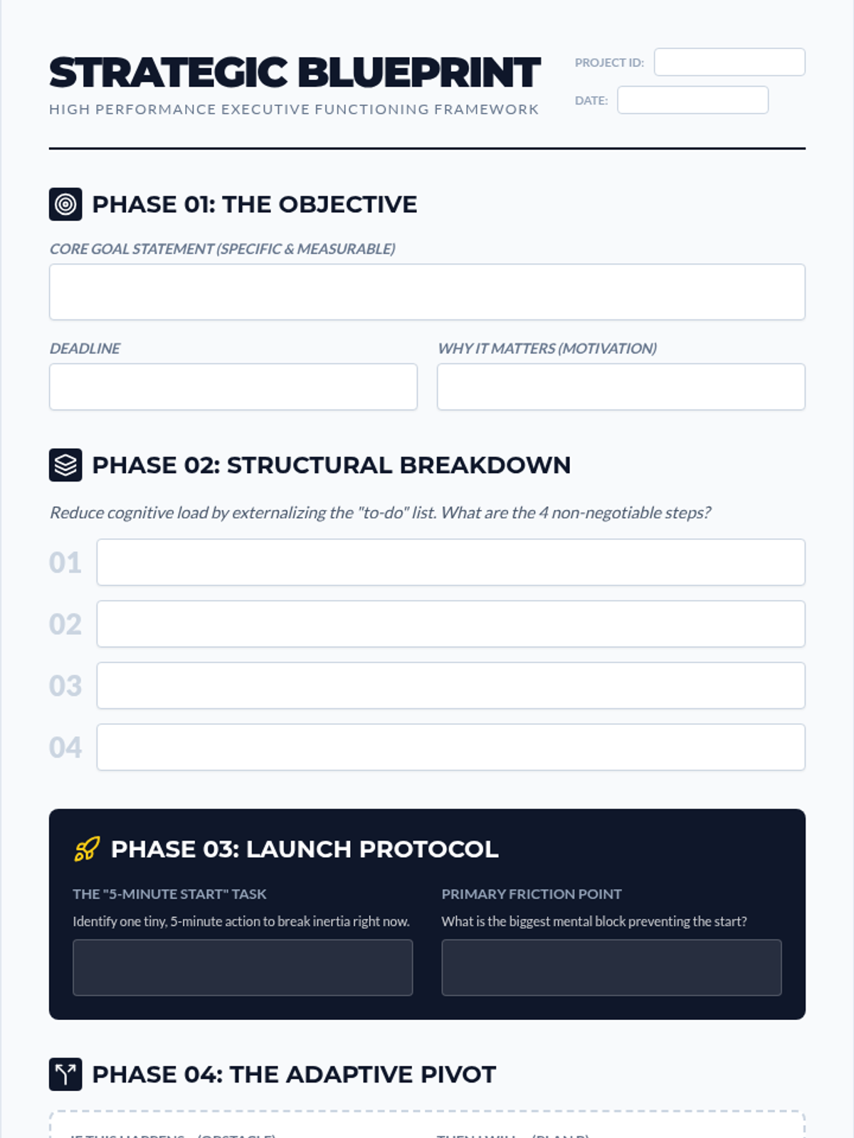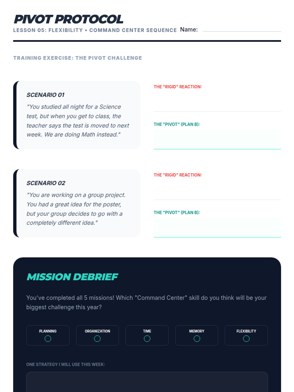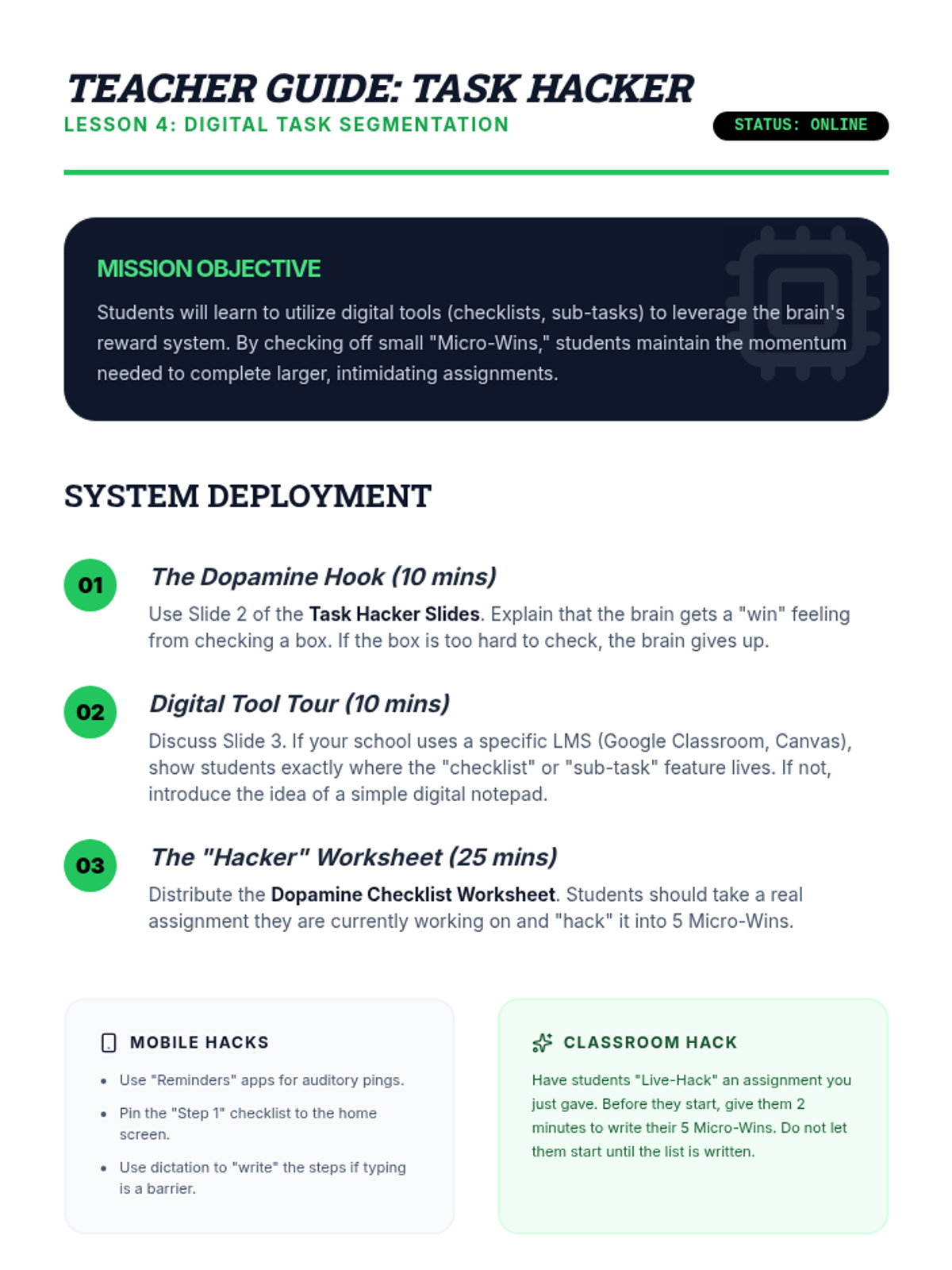 A specialized framework designed for high school students to master complex executive functioning skills through structured goal-setting and strategic planning. This lesson targets self-regulation, working memory, and task initiation within a professional-grade planning context.