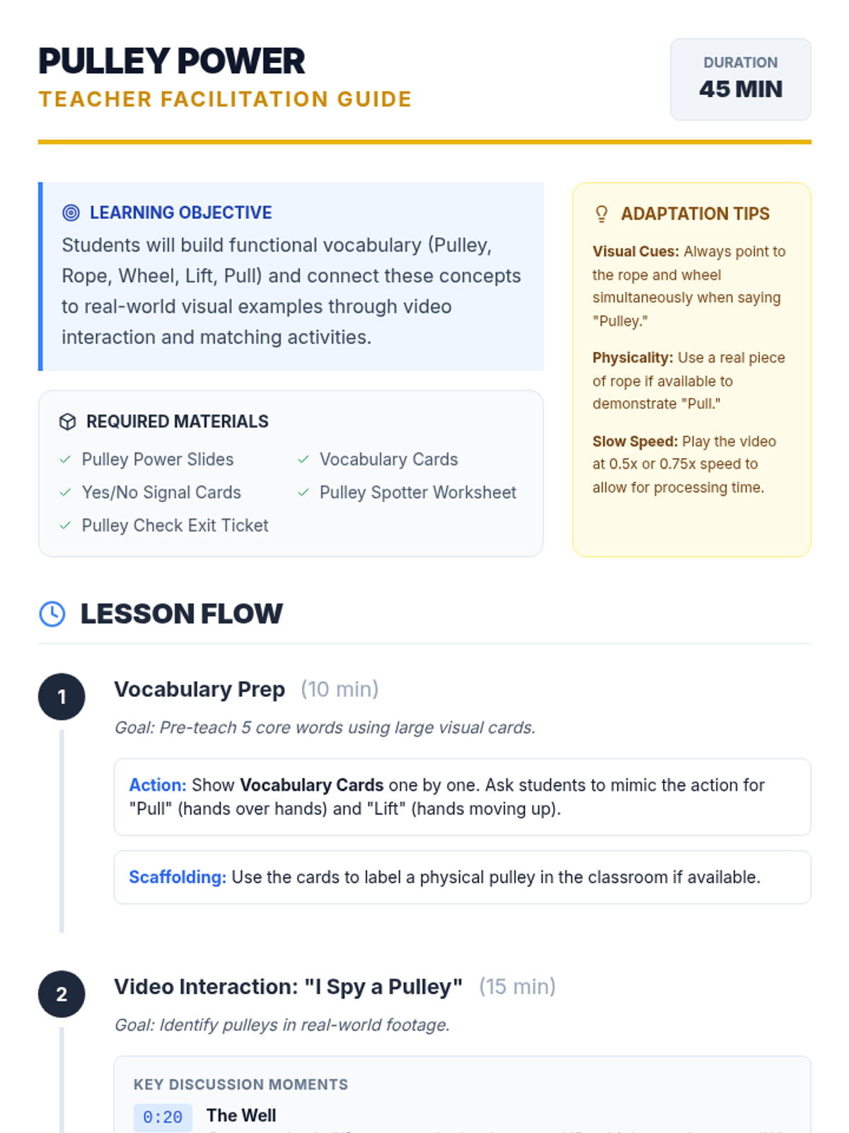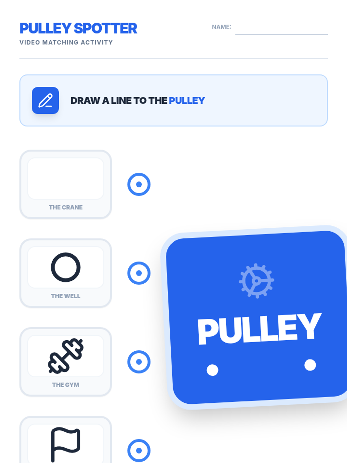 A specialized lesson for visual learners and special education students to identify pulleys in real-world contexts using a video compilation as a primary instructional tool. Students will build functional vocabulary and practice directional concepts like 'up' and 'down'.