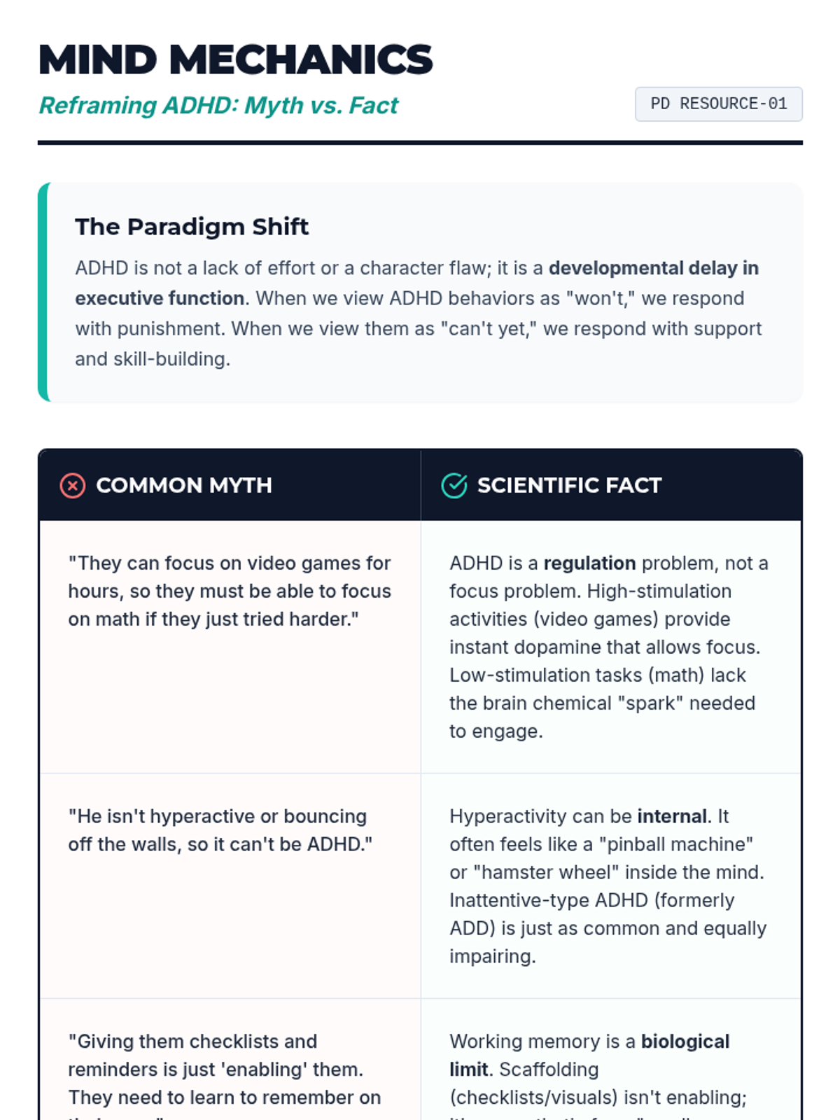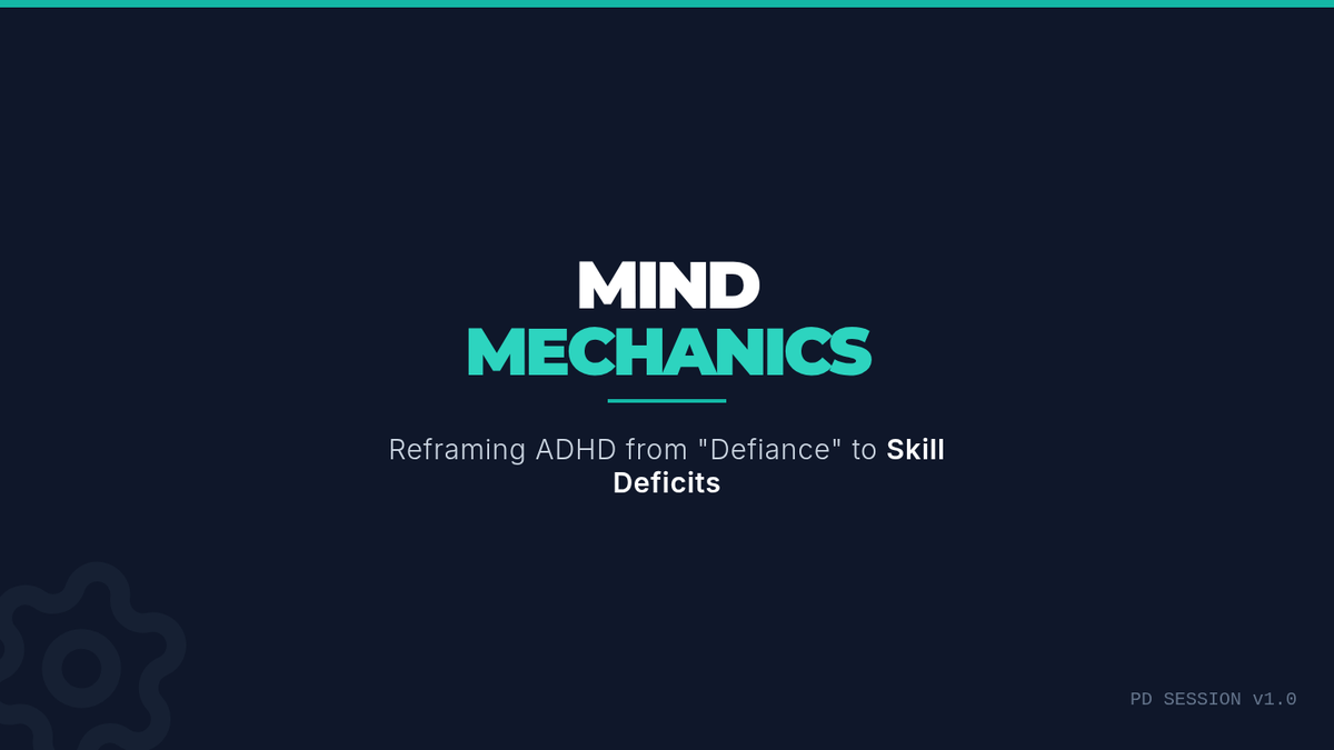 A professional development session for parents and educators to reframe ADHD behaviors as skill deficits using metaphors and evidence-based executive function strategies.