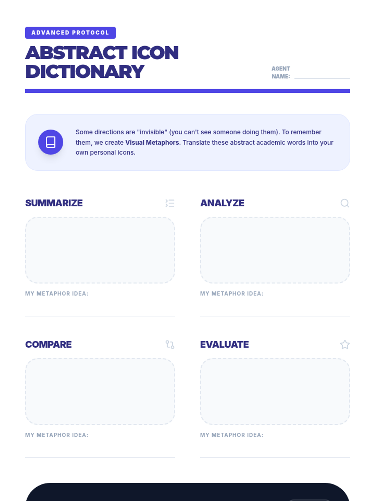 Students learn to associate abstract academic directions (like 'summarize' or 'analyze') with concrete icons to bridge the gap to higher-level tasks.