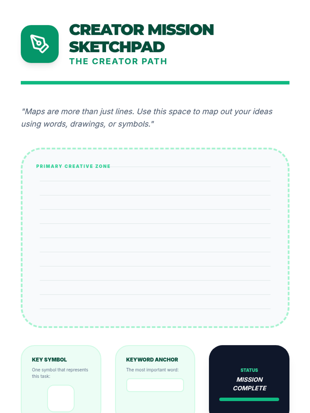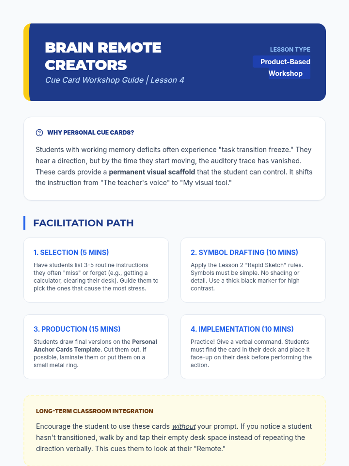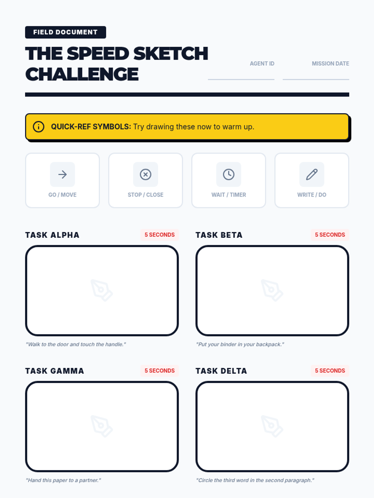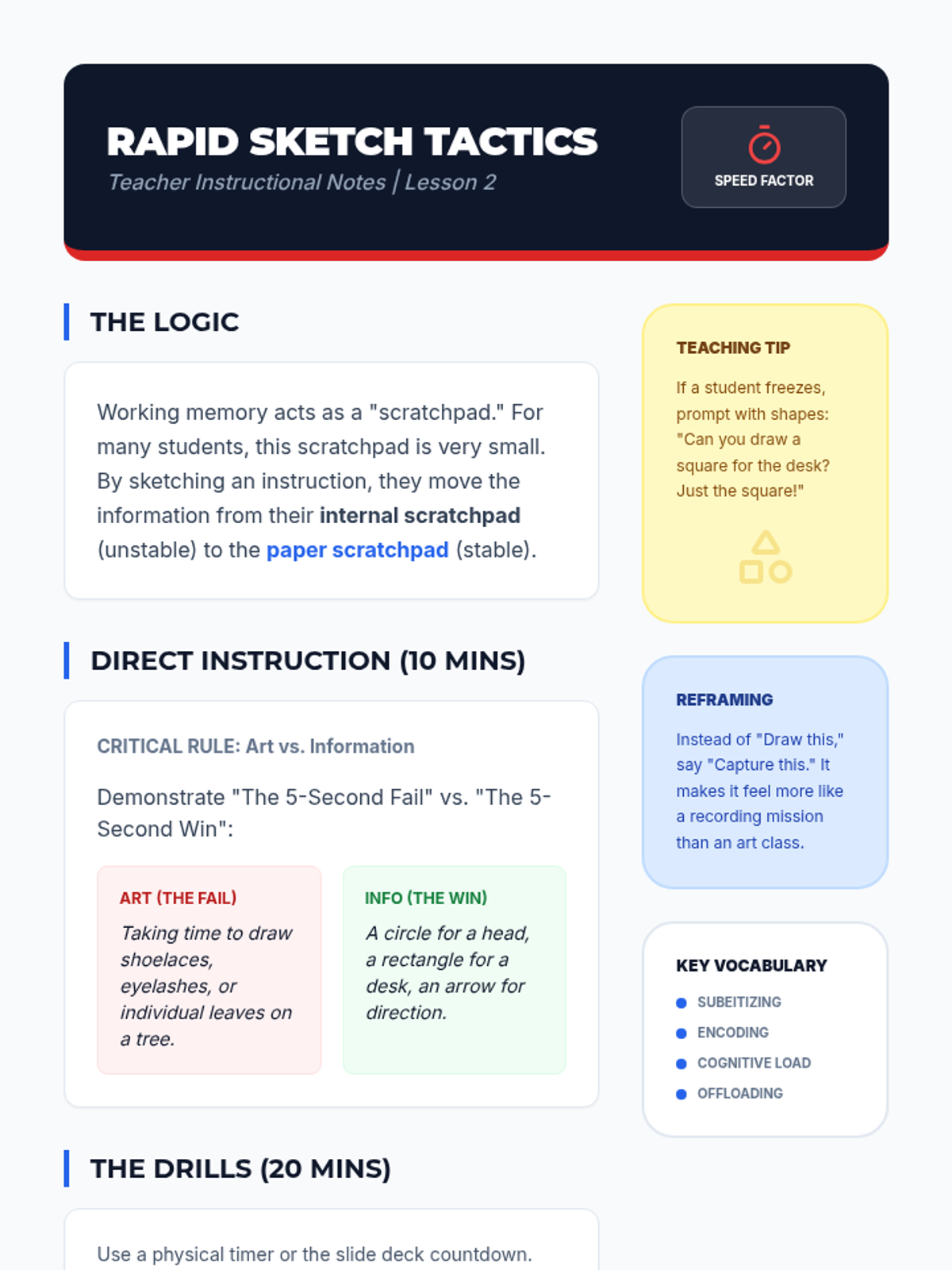 Students practice using rapid shorthand drawing to capture single-step instructions, creating a physical reference to offload working memory.