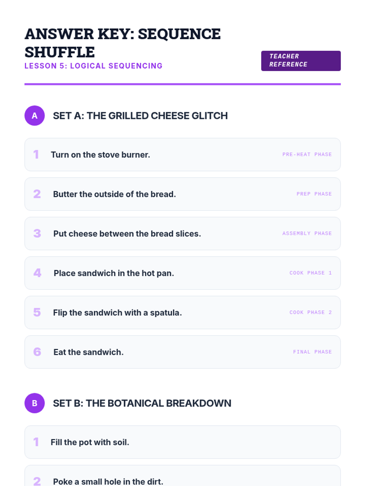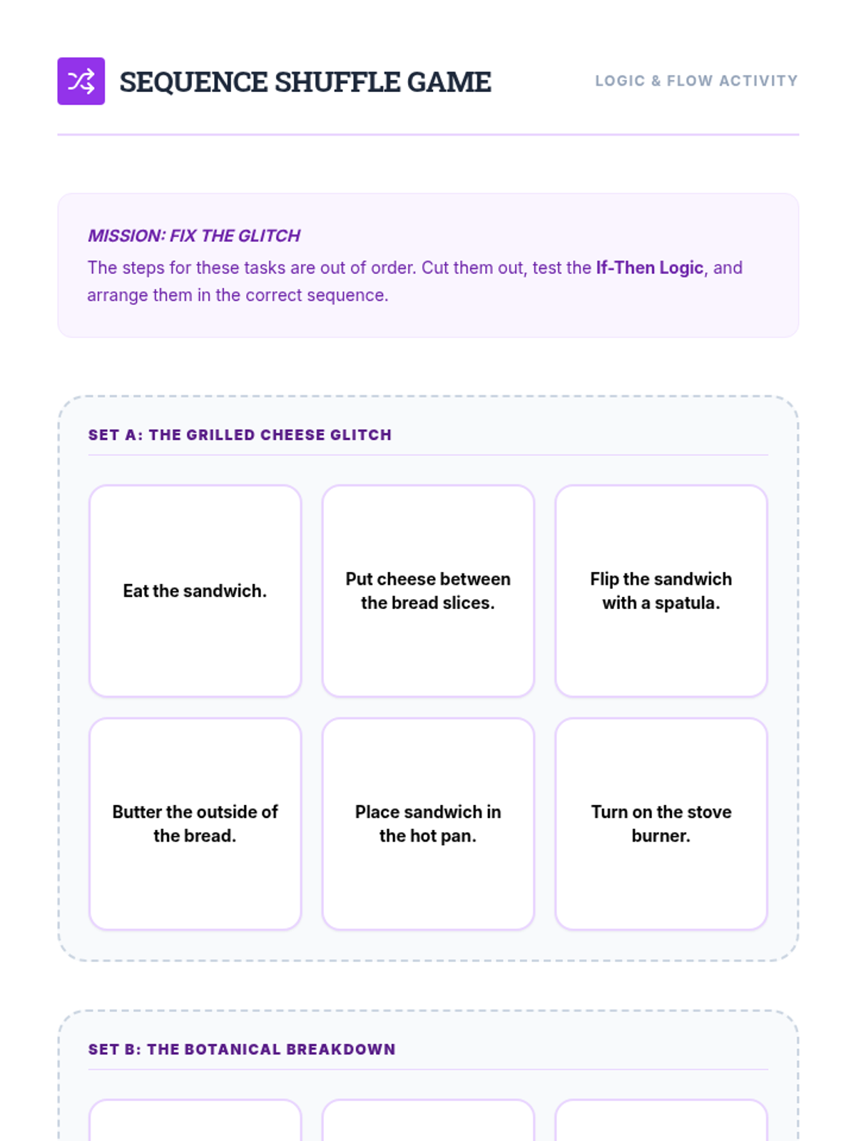 Students practice logical reasoning by reordering scrambled steps of a process into their correct sequence before starting a task.