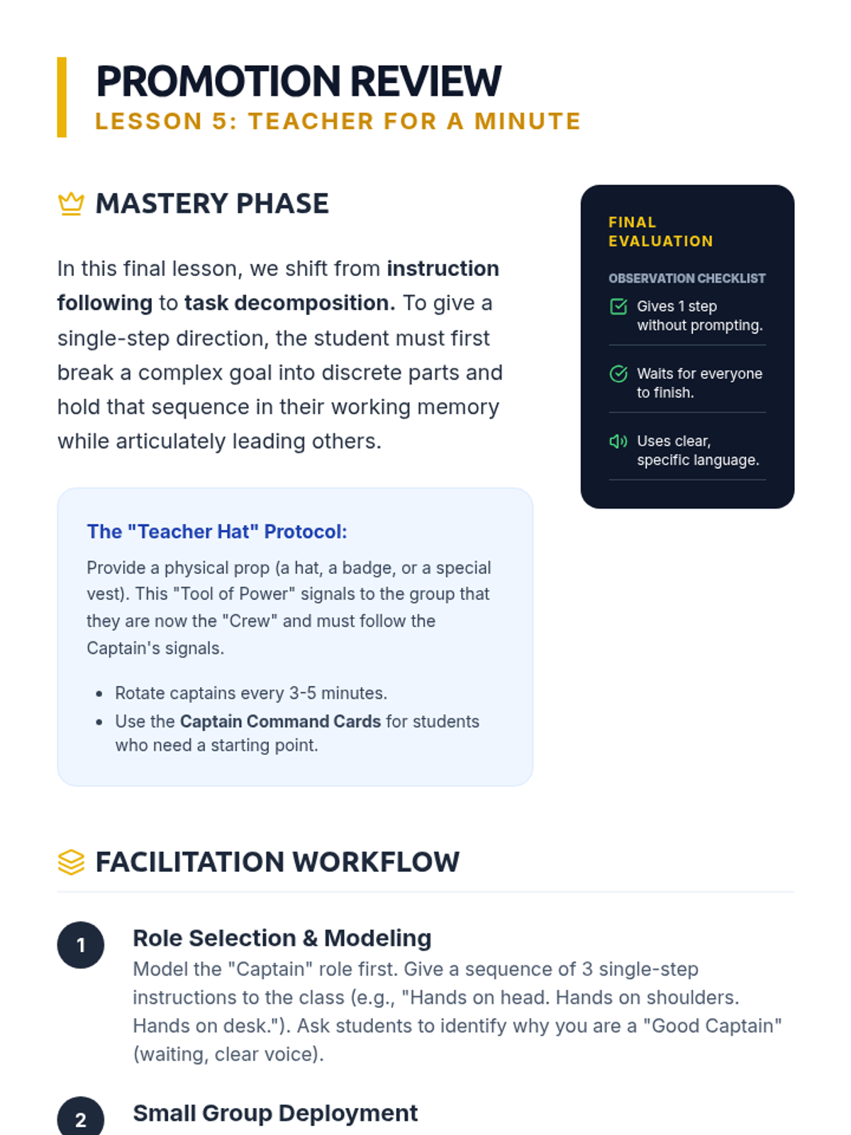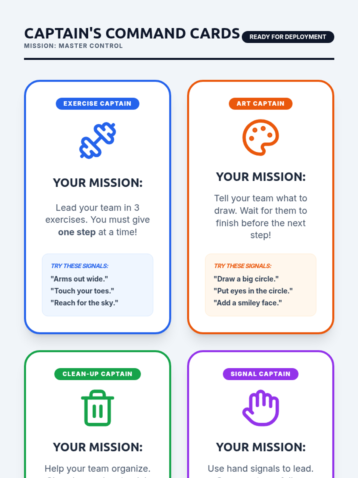 Students take turns leading a small group in a simple activity by giving single-step directions. This mastery-level activity requires them to formulate, hold, and articulate discrete steps, reinforcing their understanding of how tasks are broken down.