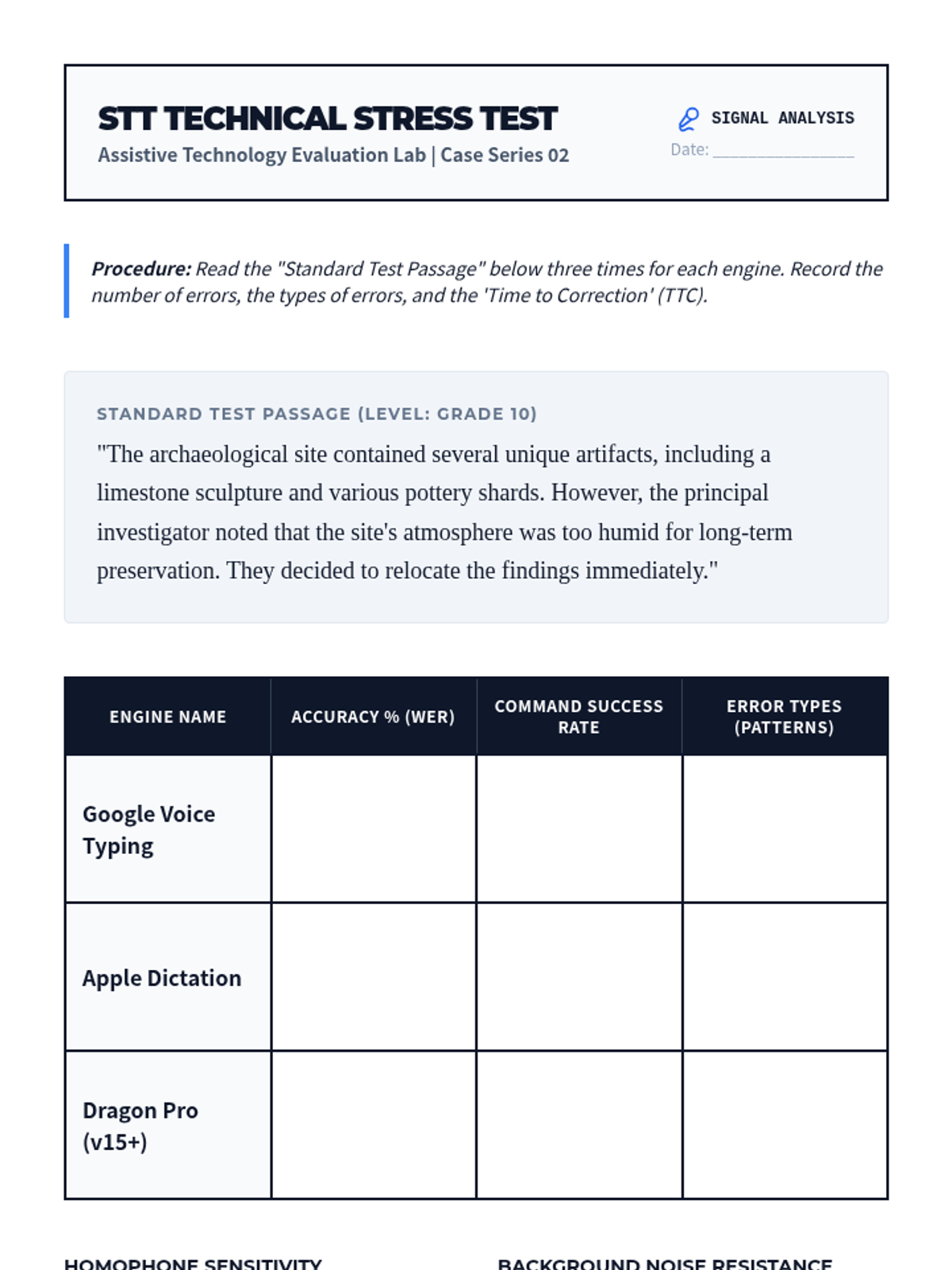 Perform a technical stress test of various speech-to-text engines to evaluate accuracy and cognitive prerequisites. Focuses on command sets and error pattern analysis.