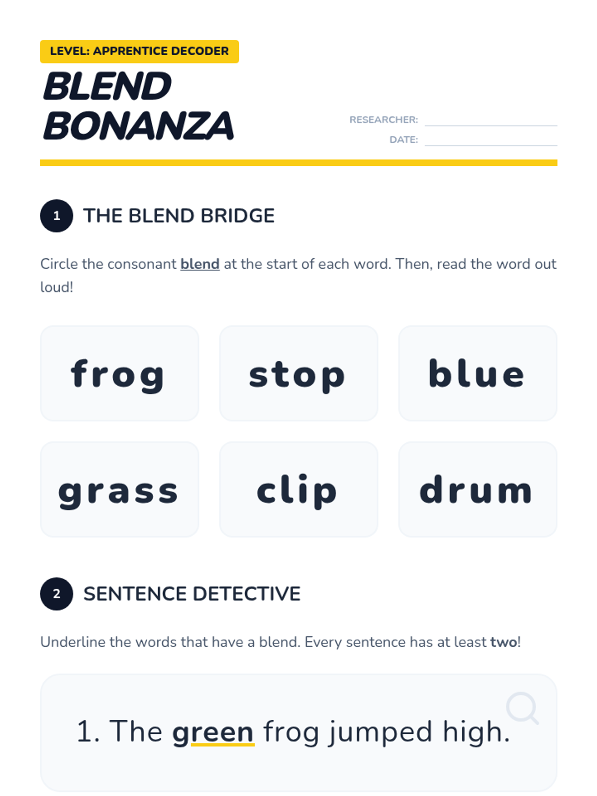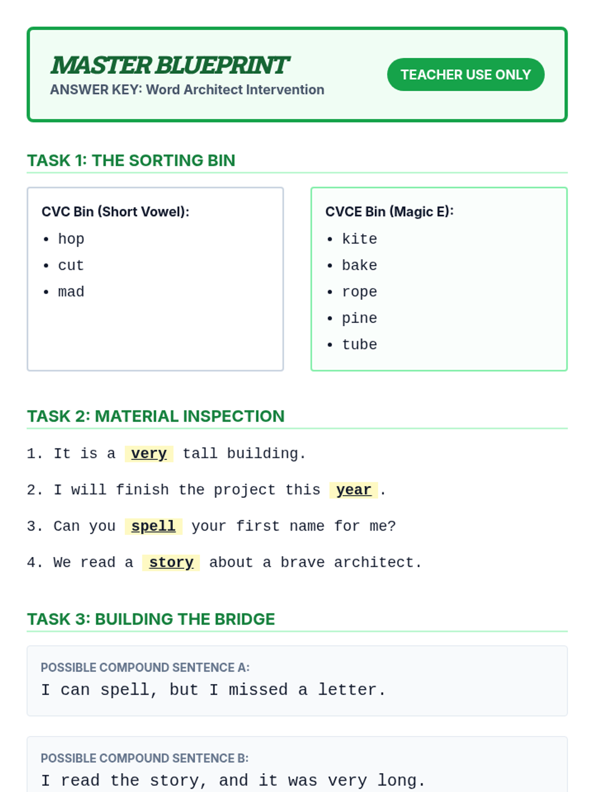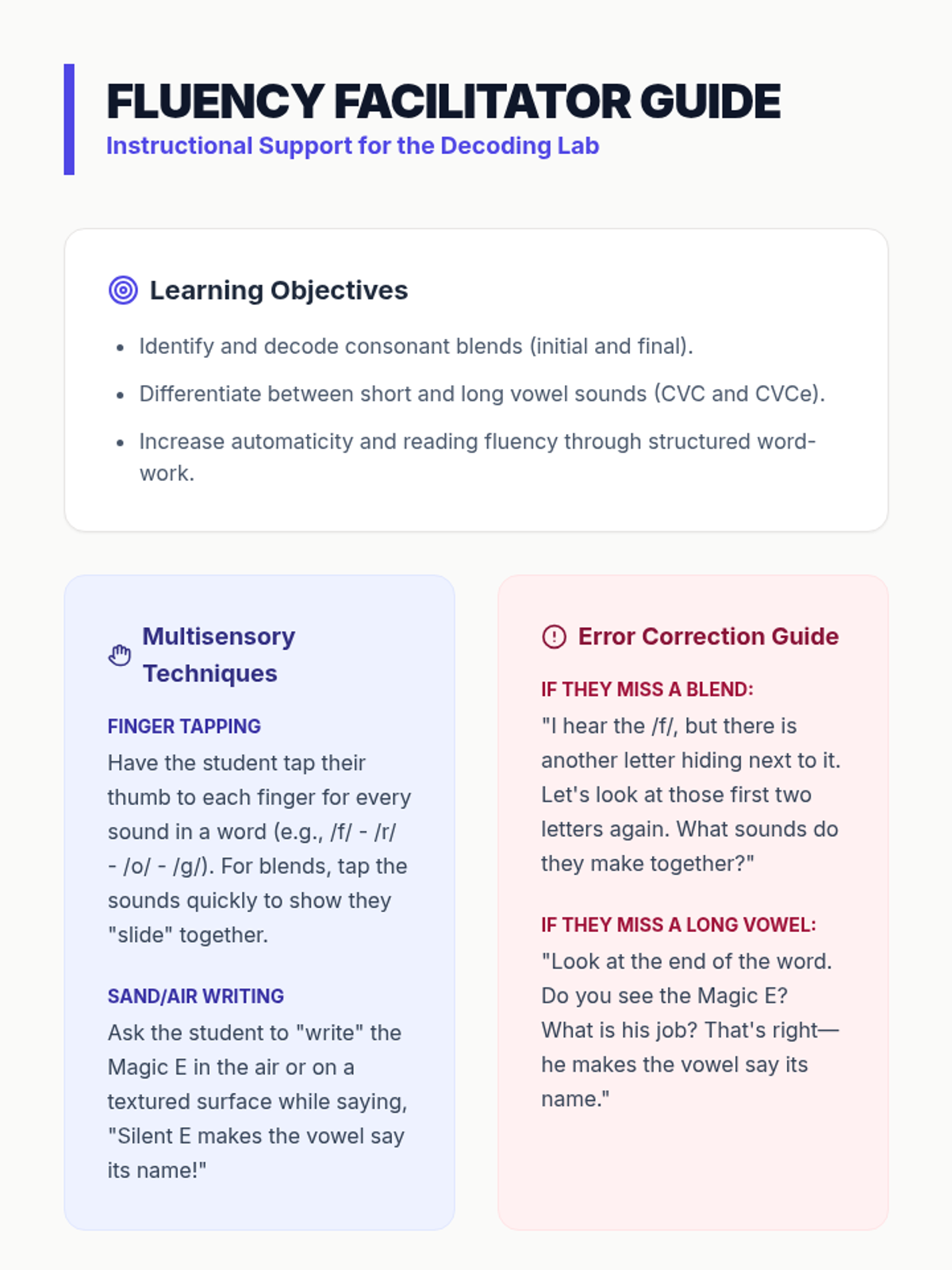 A comprehensive set of tools focused on short and long vowel patterns and consonant blends, designed specifically for Grade 3 students with reading difficulties. The lesson emphasizes multisensory decoding and structured fluency practice.