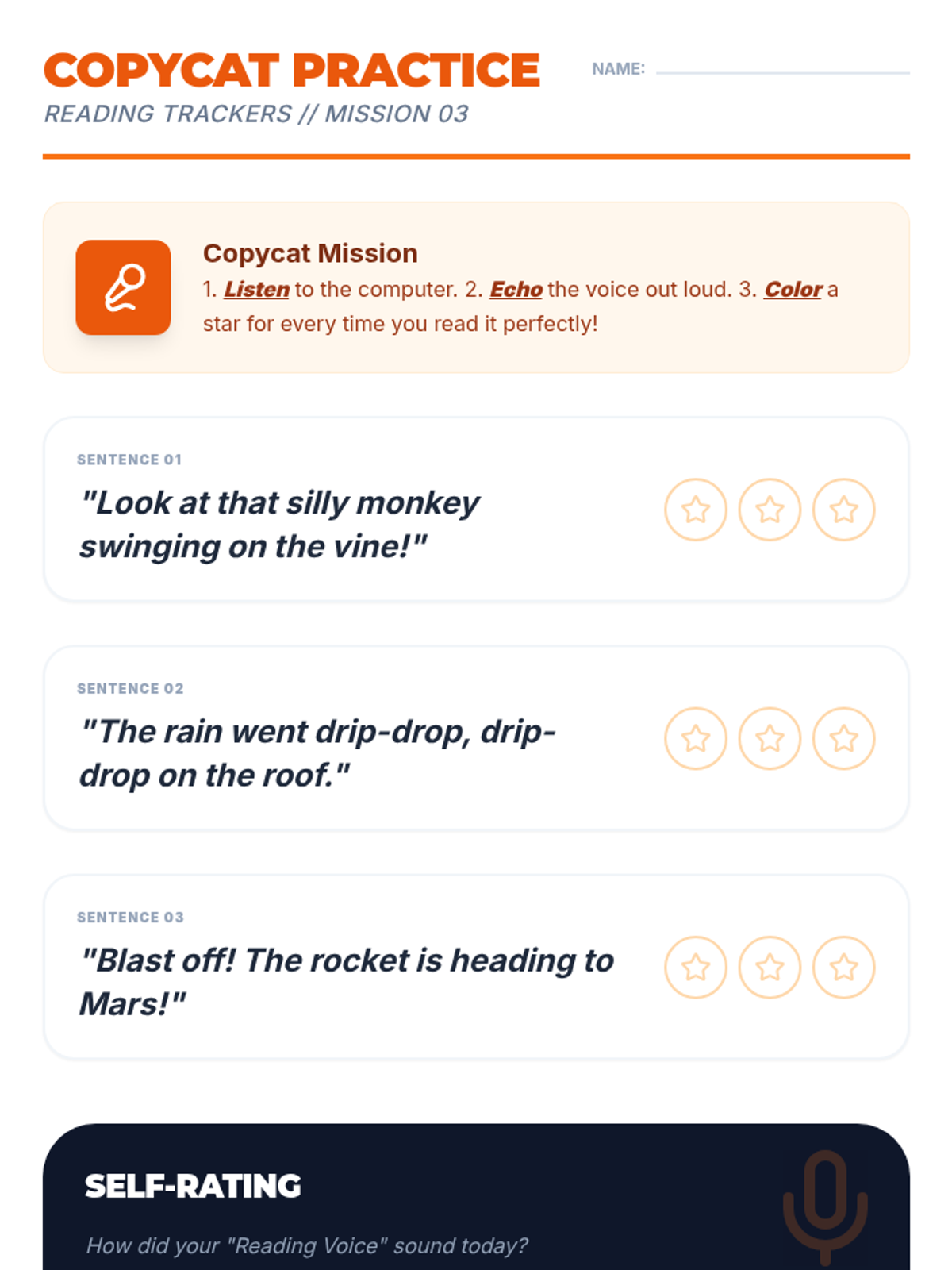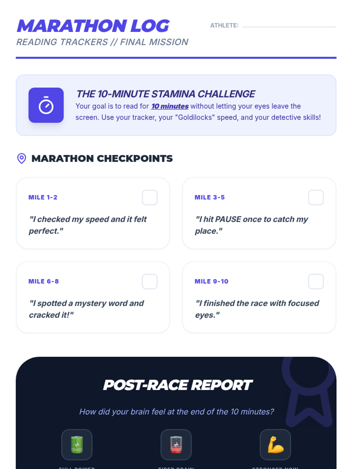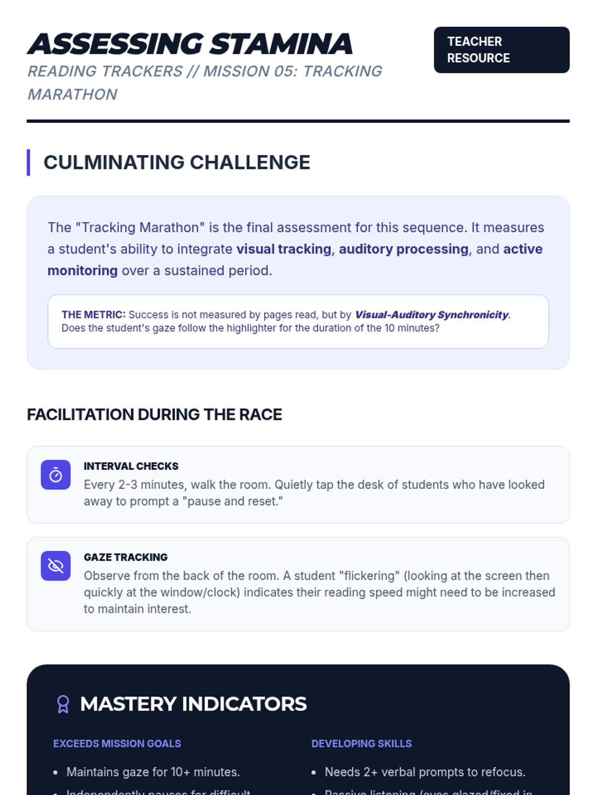 Students apply their tracking skills to longer reading passages, monitoring their own attention and focus during a sustained reading session.