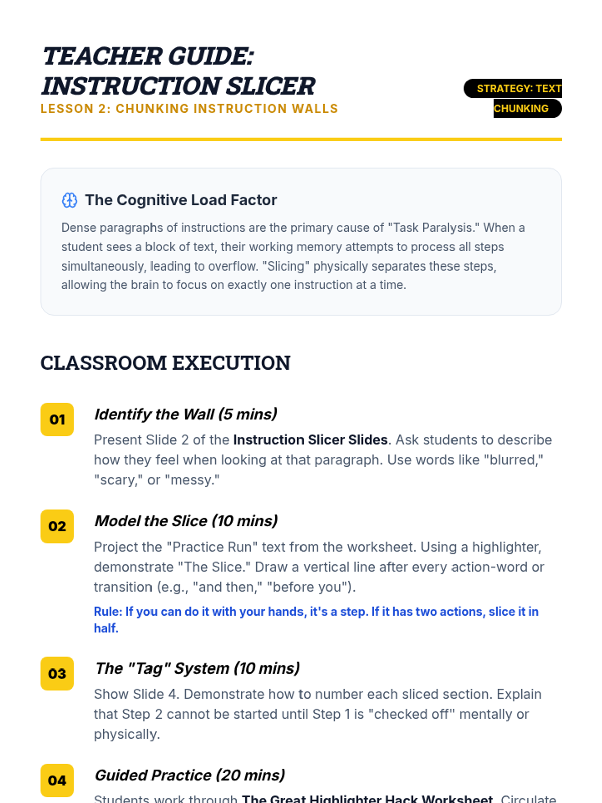 A comprehensive lesson for middle schoolers on breaking down complex, multi-step instructions using chunking, visualization, and paraphrasing strategies.