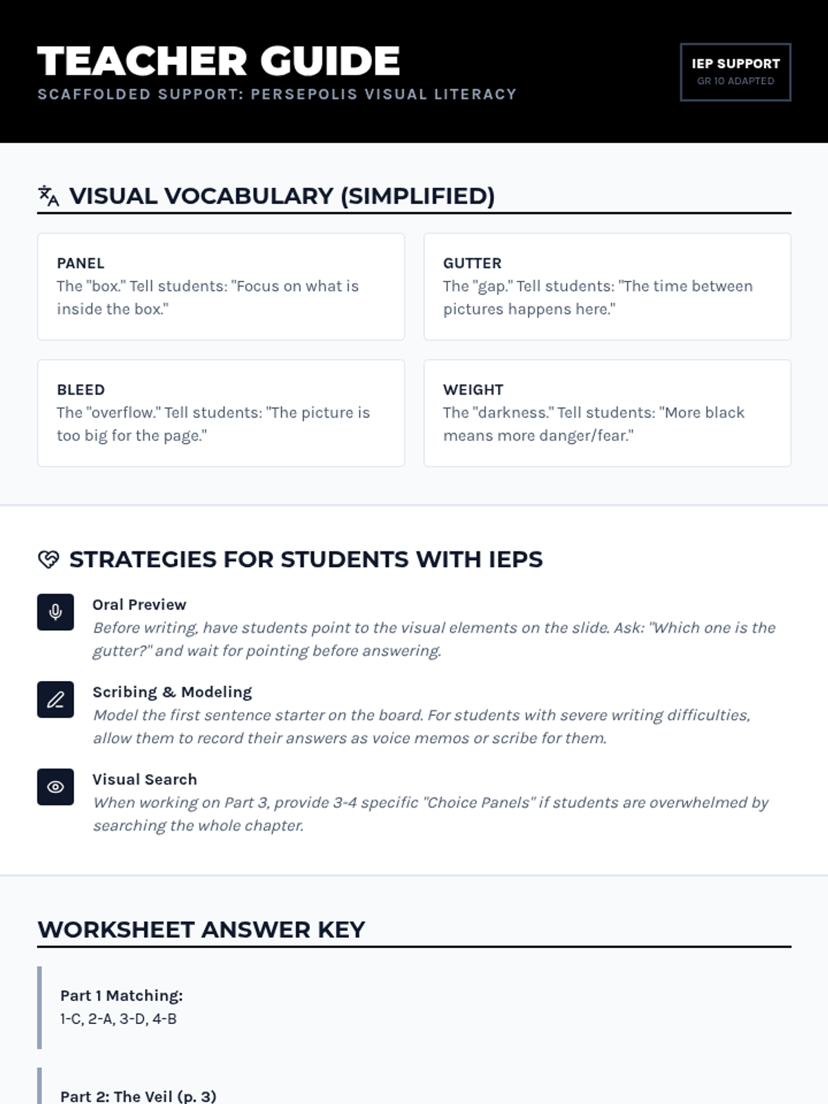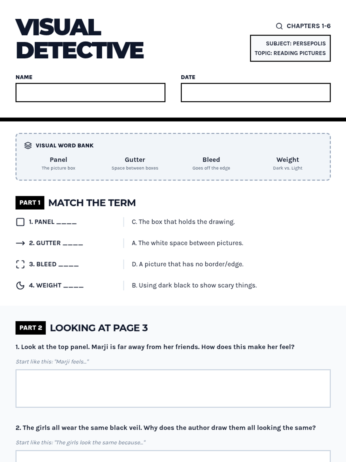 A lesson focused on visual literacy and the specific graphic techniques Marjane Satrapi uses in the first six chapters of Persepolis to convey political and personal themes.