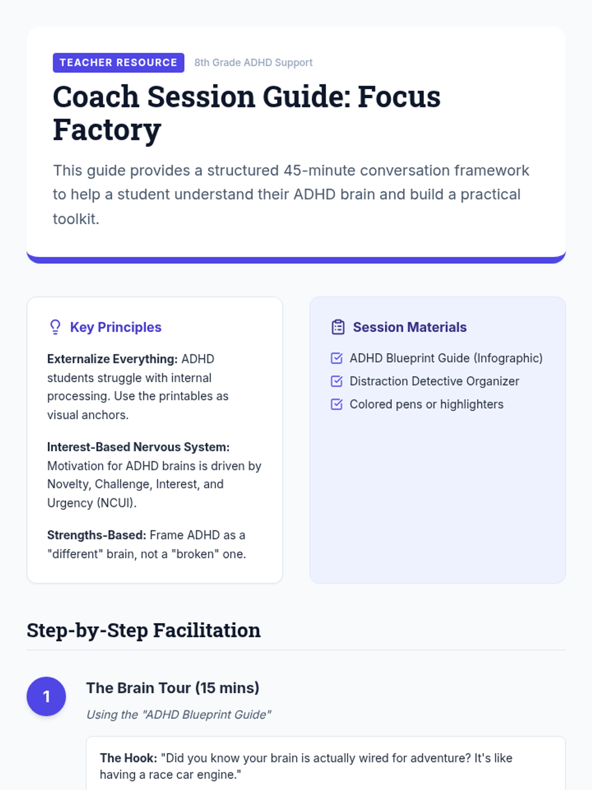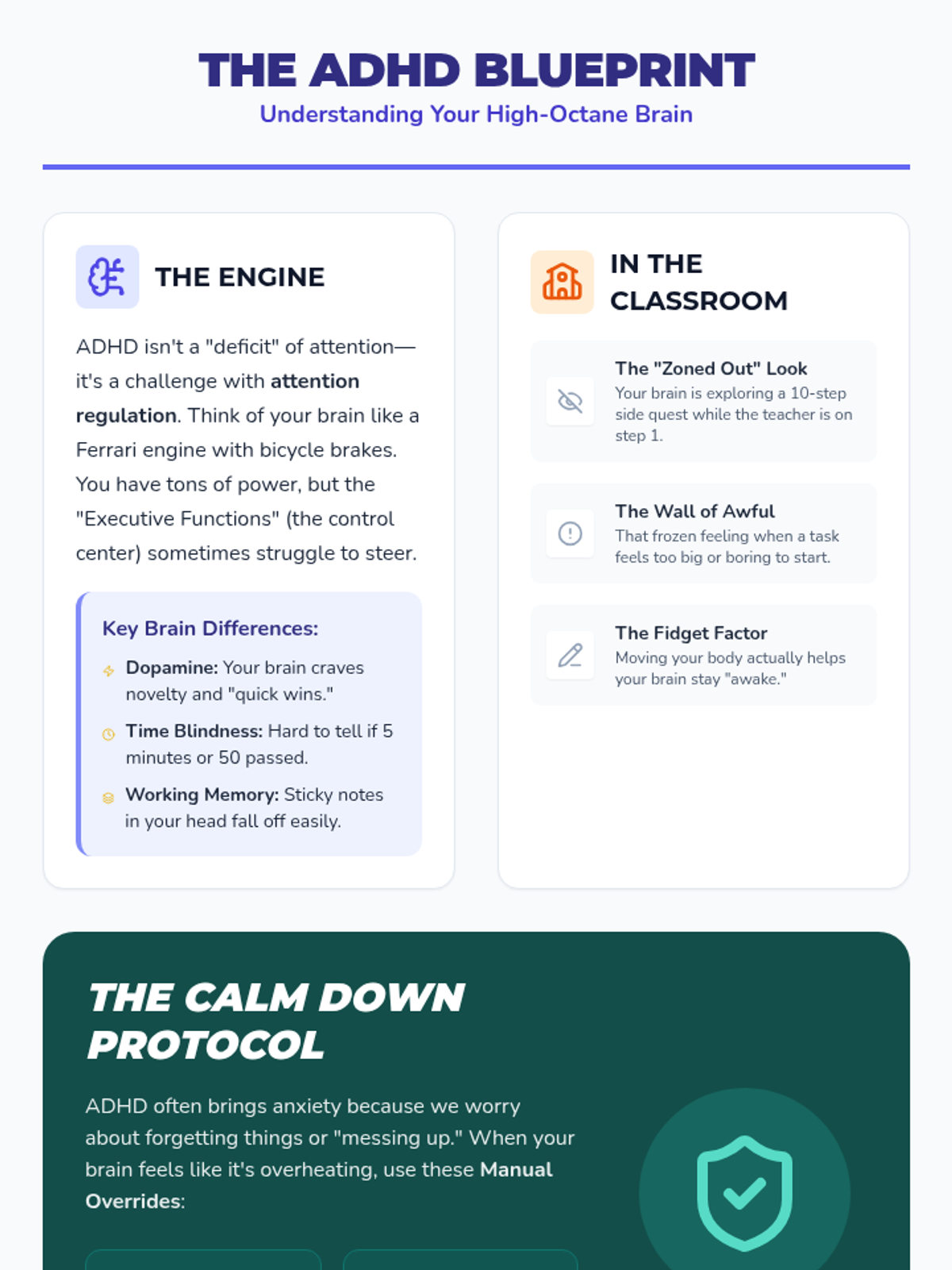 A lesson designed for an 8th-grade student to understand their ADHD brain and build a personalized toolkit of coping strategies for school and anxiety management.