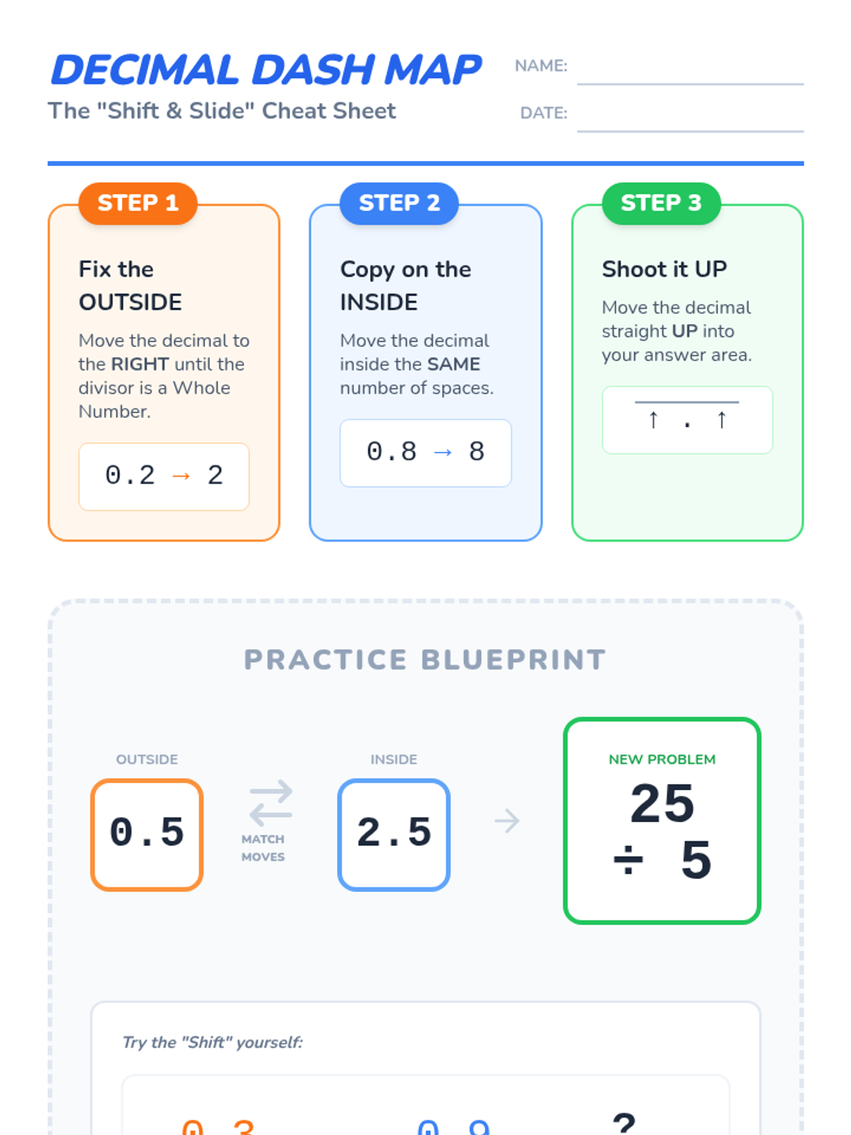 A highly visual introductory lesson for SPED students focusing on the 'shift and slide' method for dividing decimals by decimals. The lesson uses color-coded steps and a blueprint theme to make abstract movements concrete.