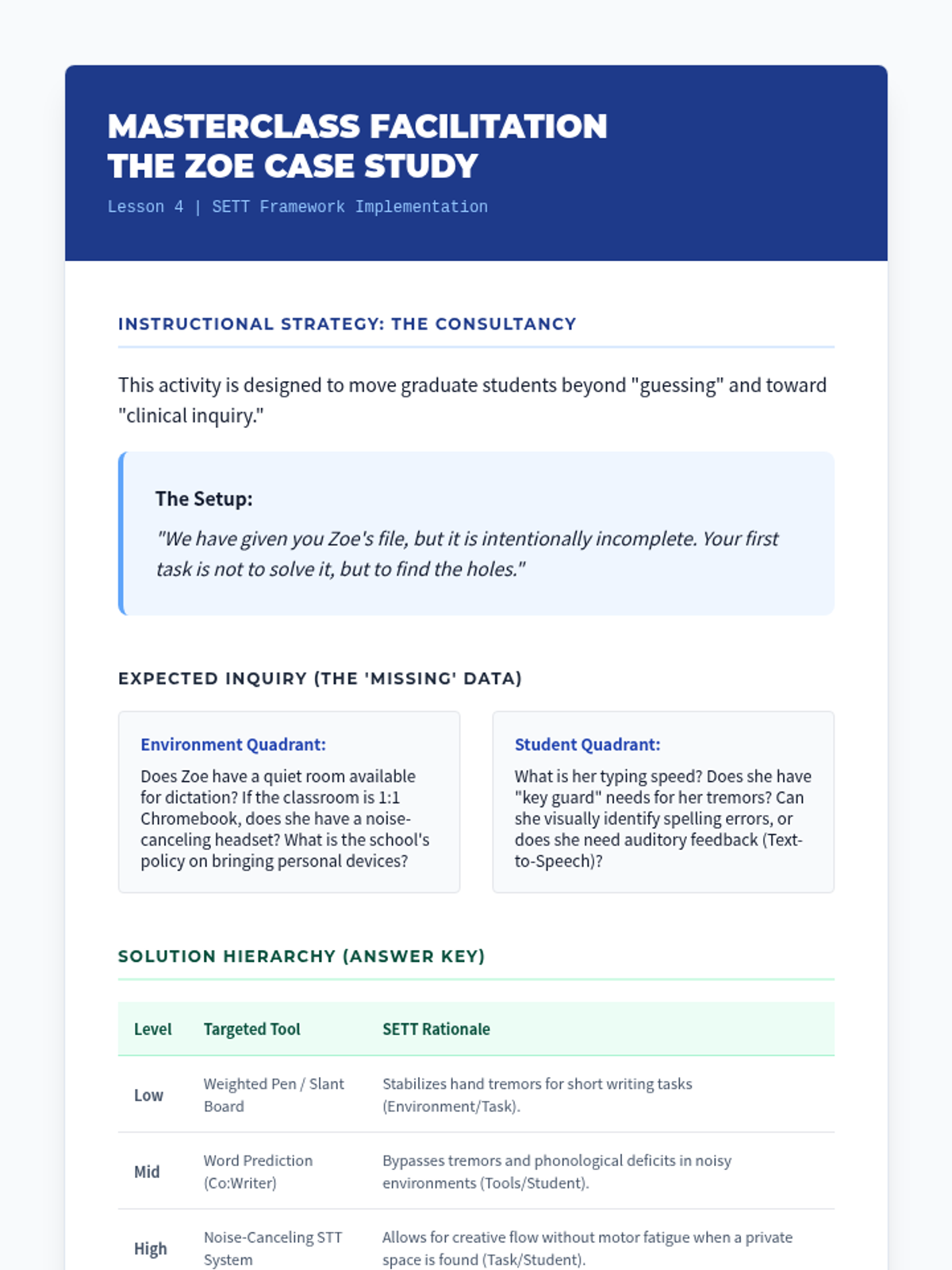 Synthesize student profiles and environmental data using the SETT Framework to propose a hierarchy of assistive writing solutions. Includes a consultancy protocol for complex cases.