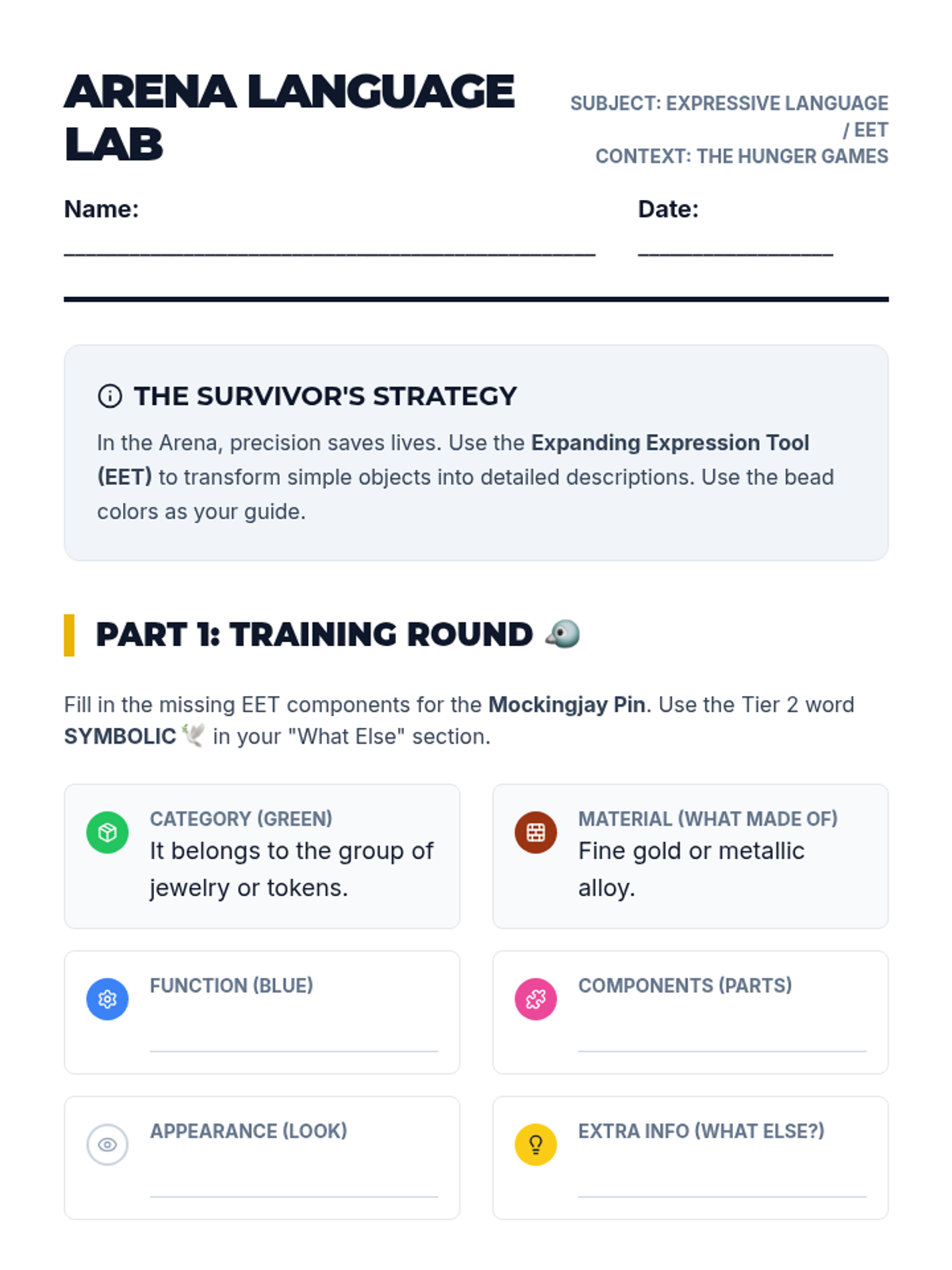 A visual guide to using the Expanding Expression Tool (EET) to enhance descriptive language and vocabulary, specifically themed around the world of The Hunger Games.